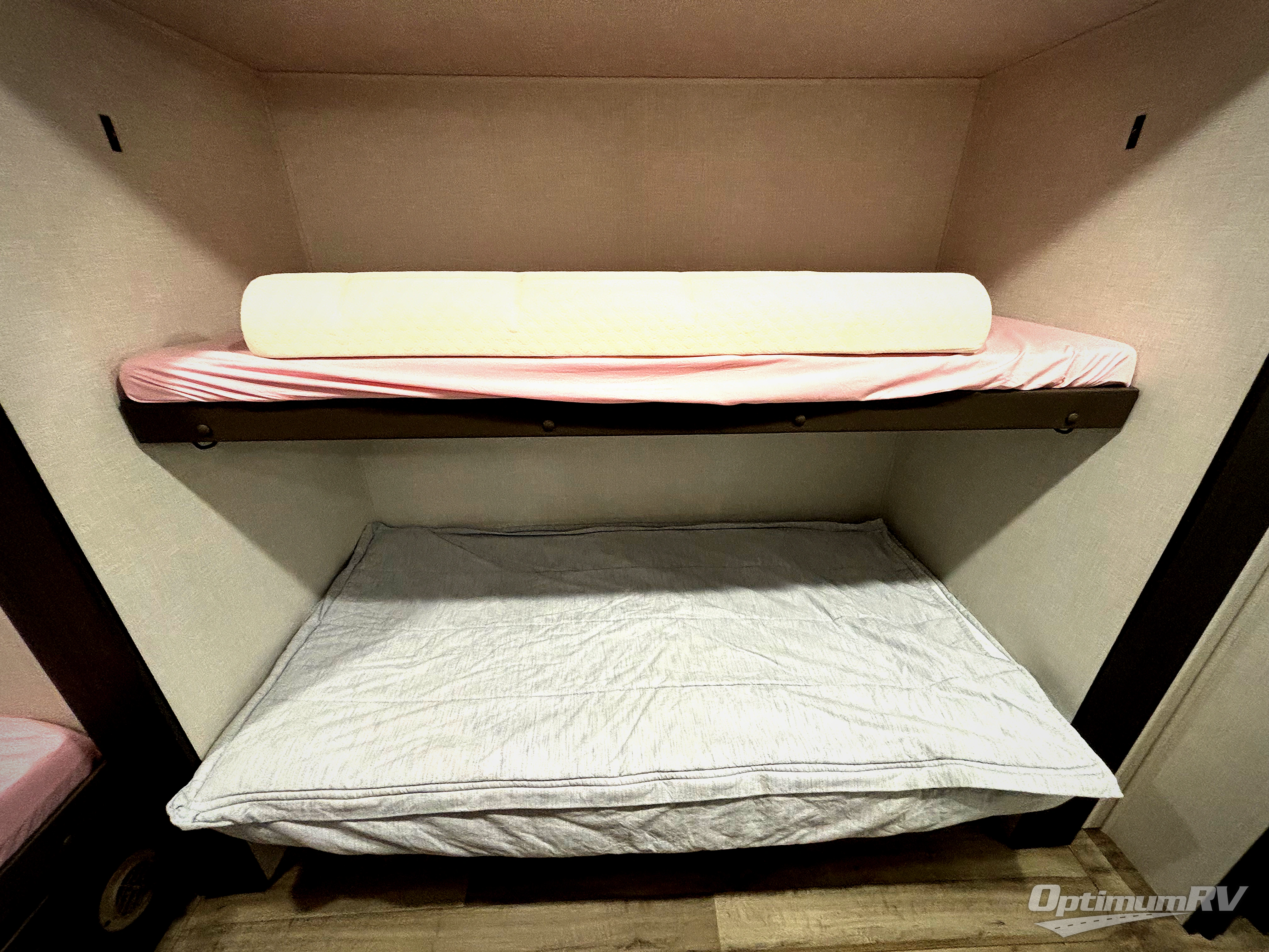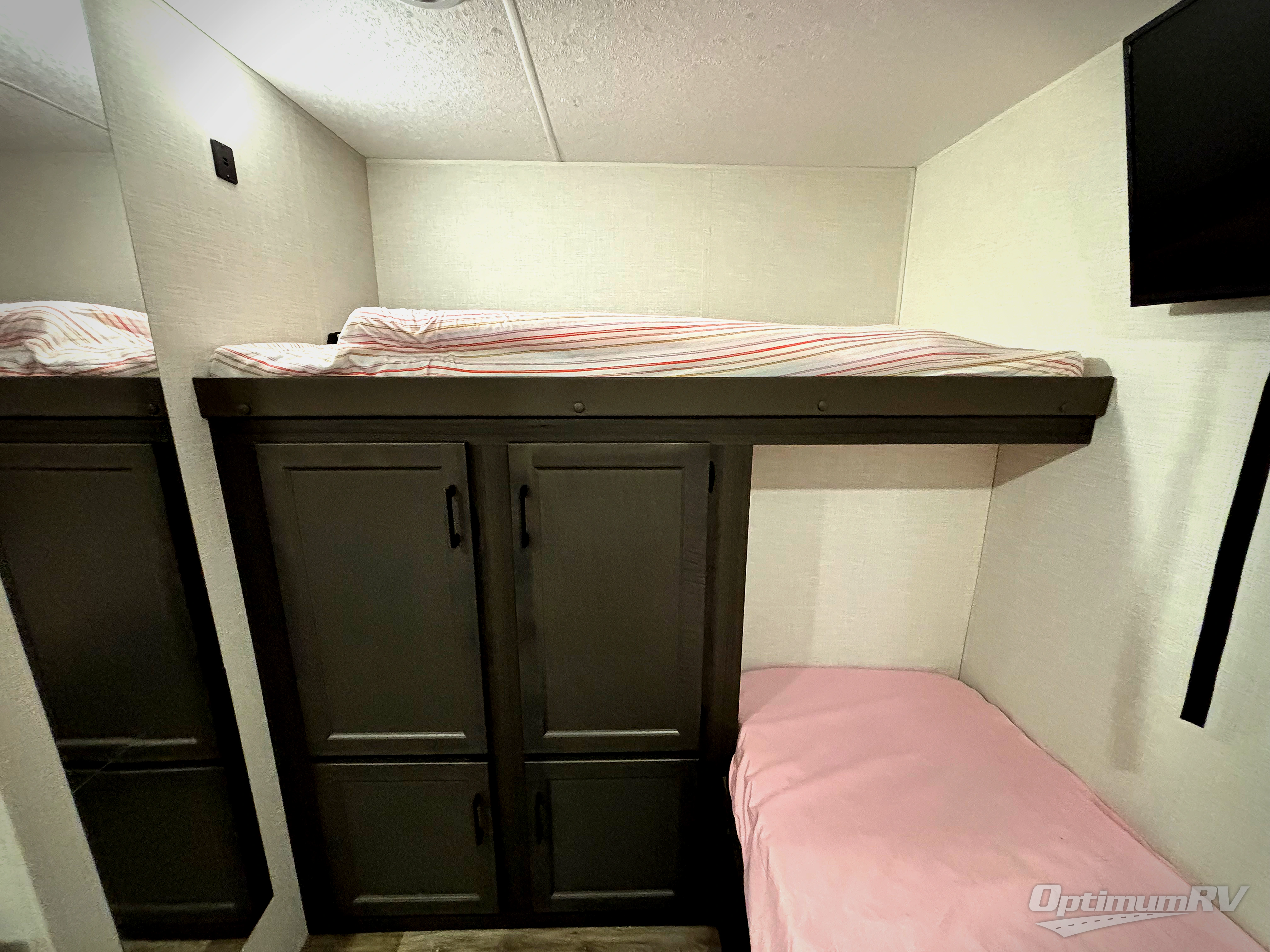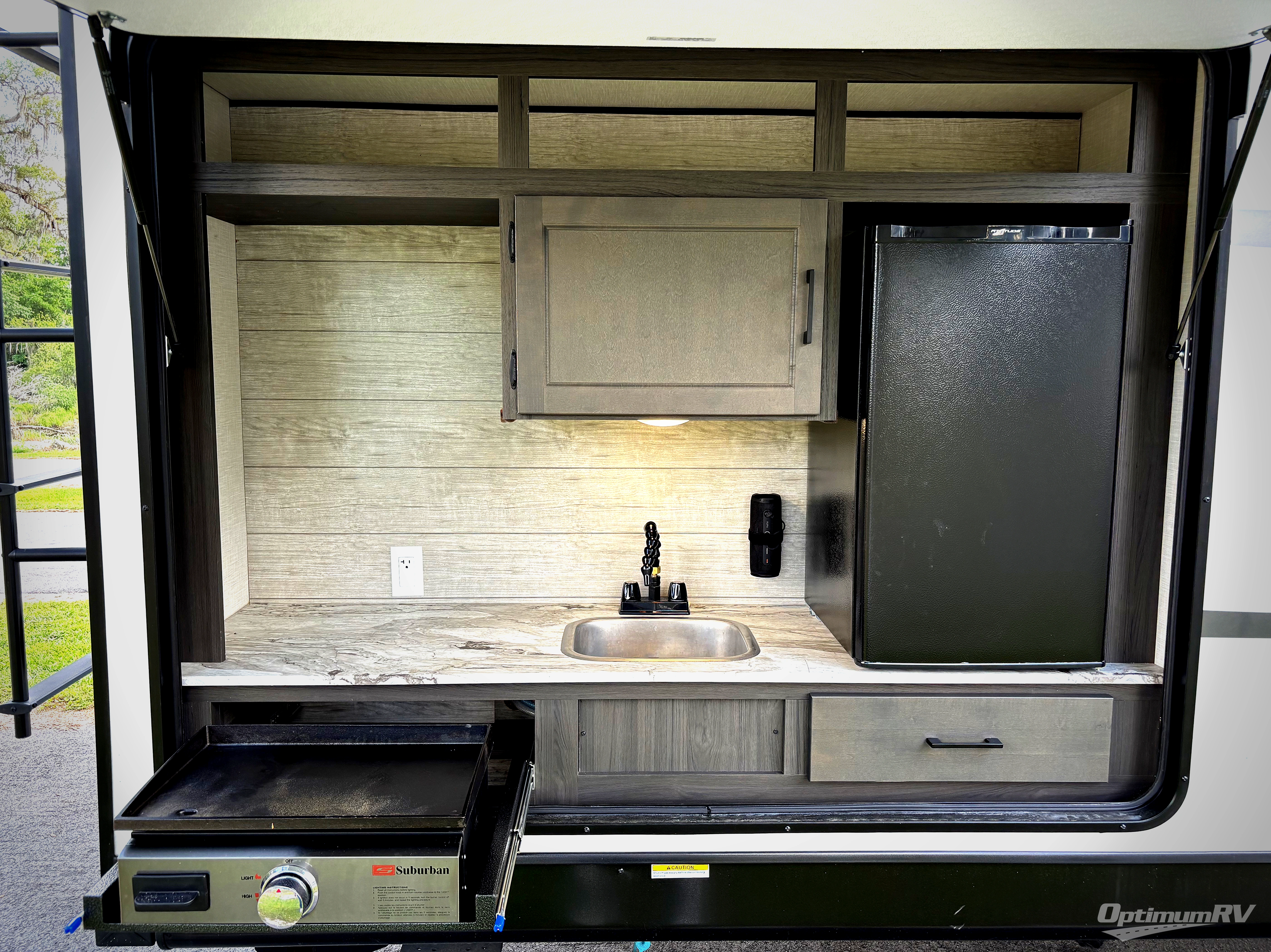 It's a clean decision with a bath and a half to take this travel trailer on your next camping trip! The rear private bunkhouse is decked out with a 28" x 70" bunk bed, a 32" x 70" top bunk, a 28" x 73" flip-up bunk above a 72" sofa with table, and a flip desk to do some school work. The half bathroom has an entry/exit door so you can get back to cooking at the outdoor campfire café which has two outdoor 3 cu. ft. refrigerators, a sink, griddle, and storage. Your clean up will be a breeze thanks to the kitchen island with a large sink and dish drying rack. If you need extra sleeping space then simply convert the 70" sofa at night. There is also a Sit N' Slide table with flipside reversible cushions. Those staying in the front private bedroom will enjoy a good night's rest on the Sleep Tight queen bed and have the convenience of accessing the dual entry bathroom!