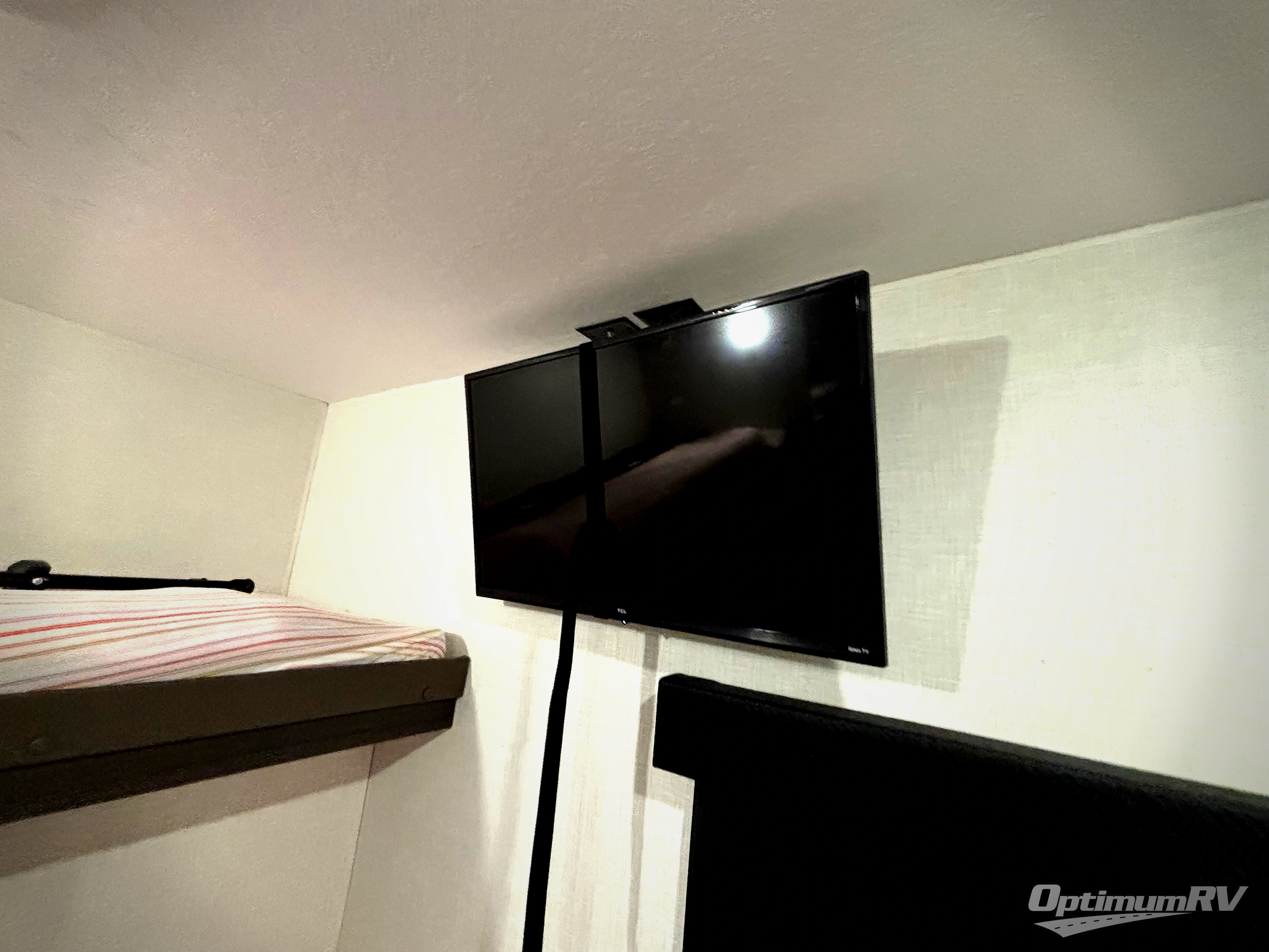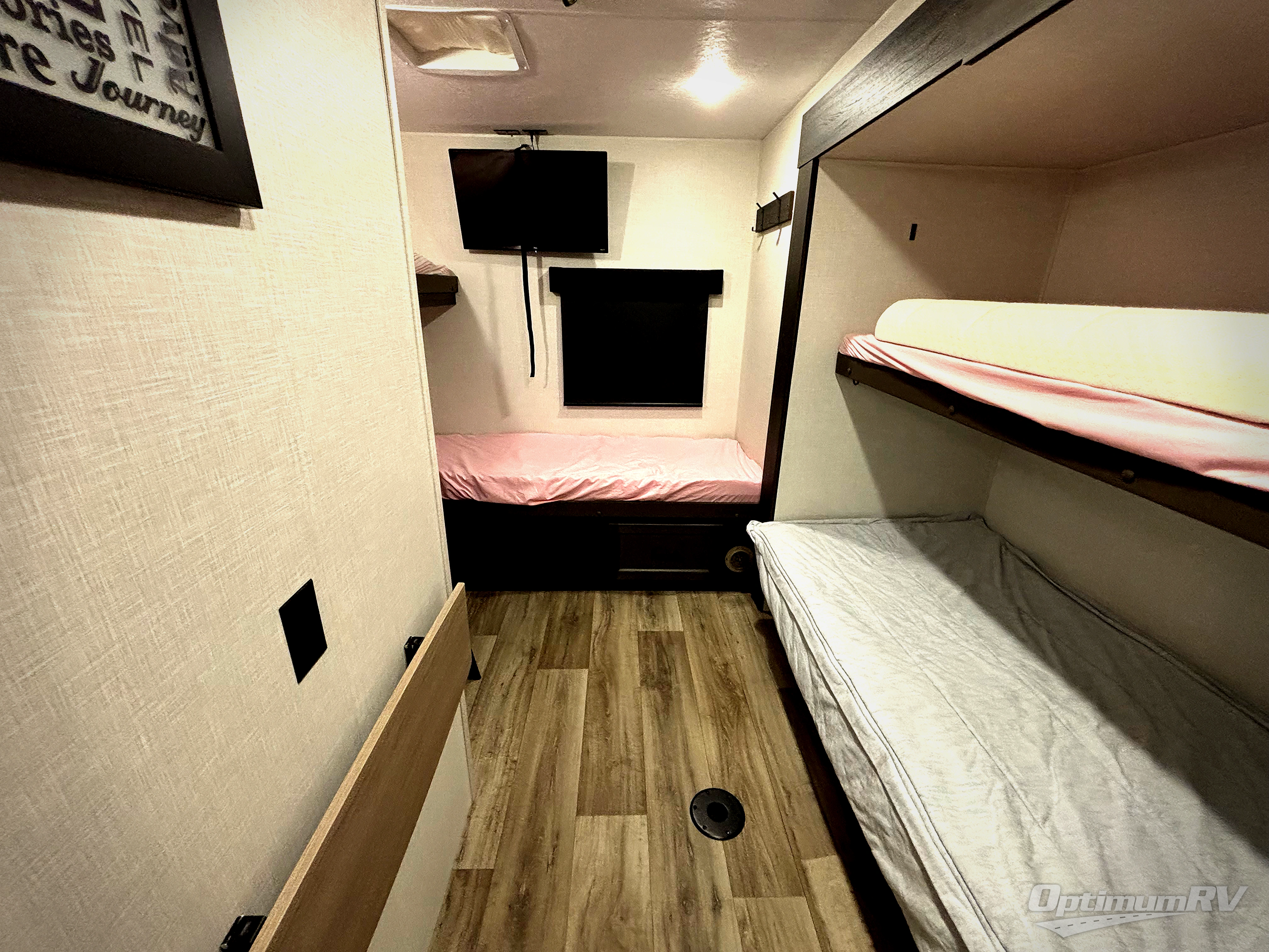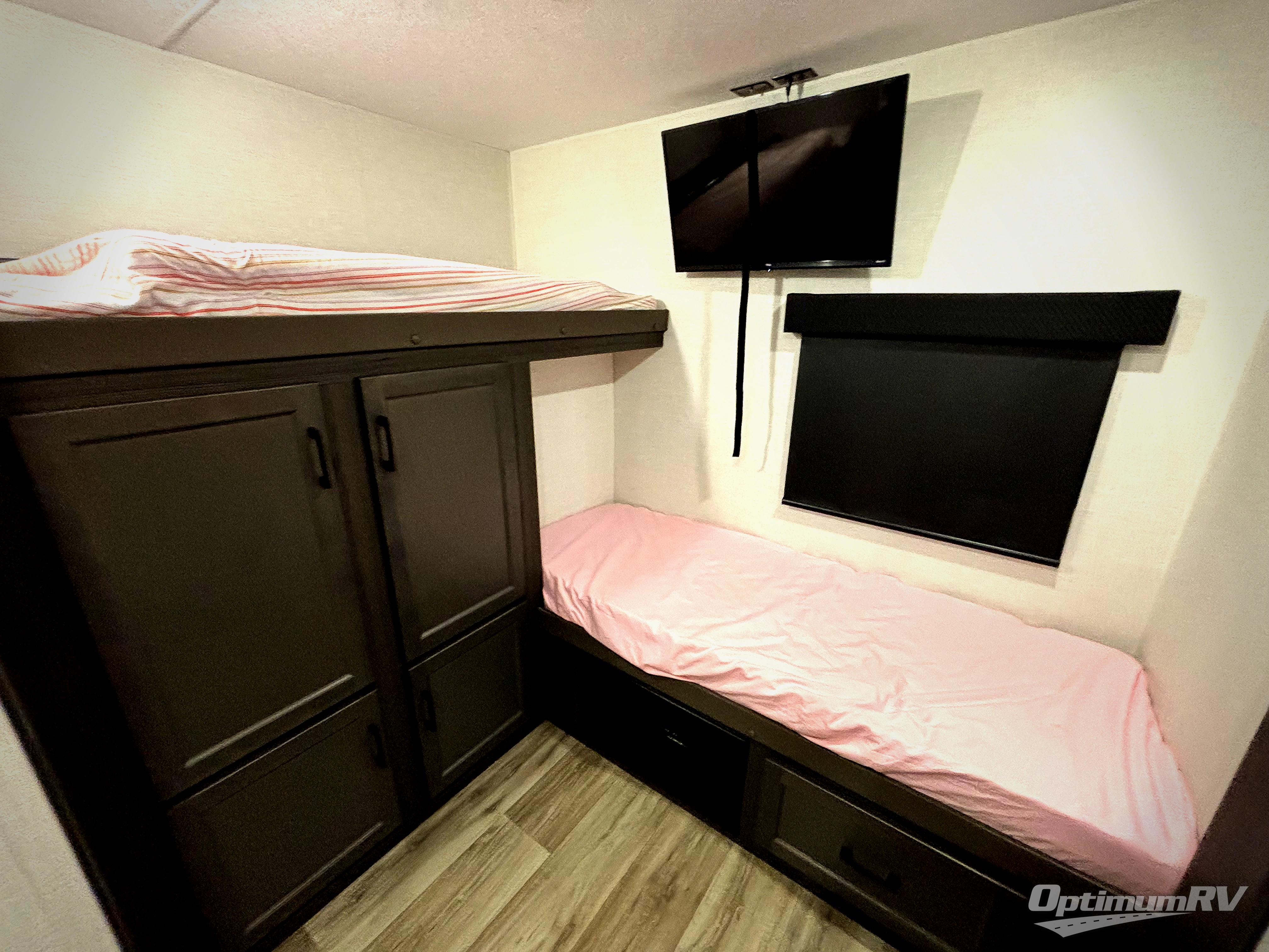 It's a clean decision with a bath and a half to take this travel trailer on your next camping trip! The rear private bunkhouse is decked out with a 28" x 70" bunk bed, a 32" x 70" top bunk, a 28" x 73" flip-up bunk above a 72" sofa with table, and a flip desk to do some school work. The half bathroom has an entry/exit door so you can get back to cooking at the outdoor campfire café which has two outdoor 3 cu. ft. refrigerators, a sink, griddle, and storage. Your clean up will be a breeze thanks to the kitchen island with a large sink and dish drying rack. If you need extra sleeping space then simply convert the 70" sofa at night. There is also a Sit N' Slide table with flipside reversible cushions. Those staying in the front private bedroom will enjoy a good night's rest on the Sleep Tight queen bed and have the convenience of accessing the dual entry bathroom!