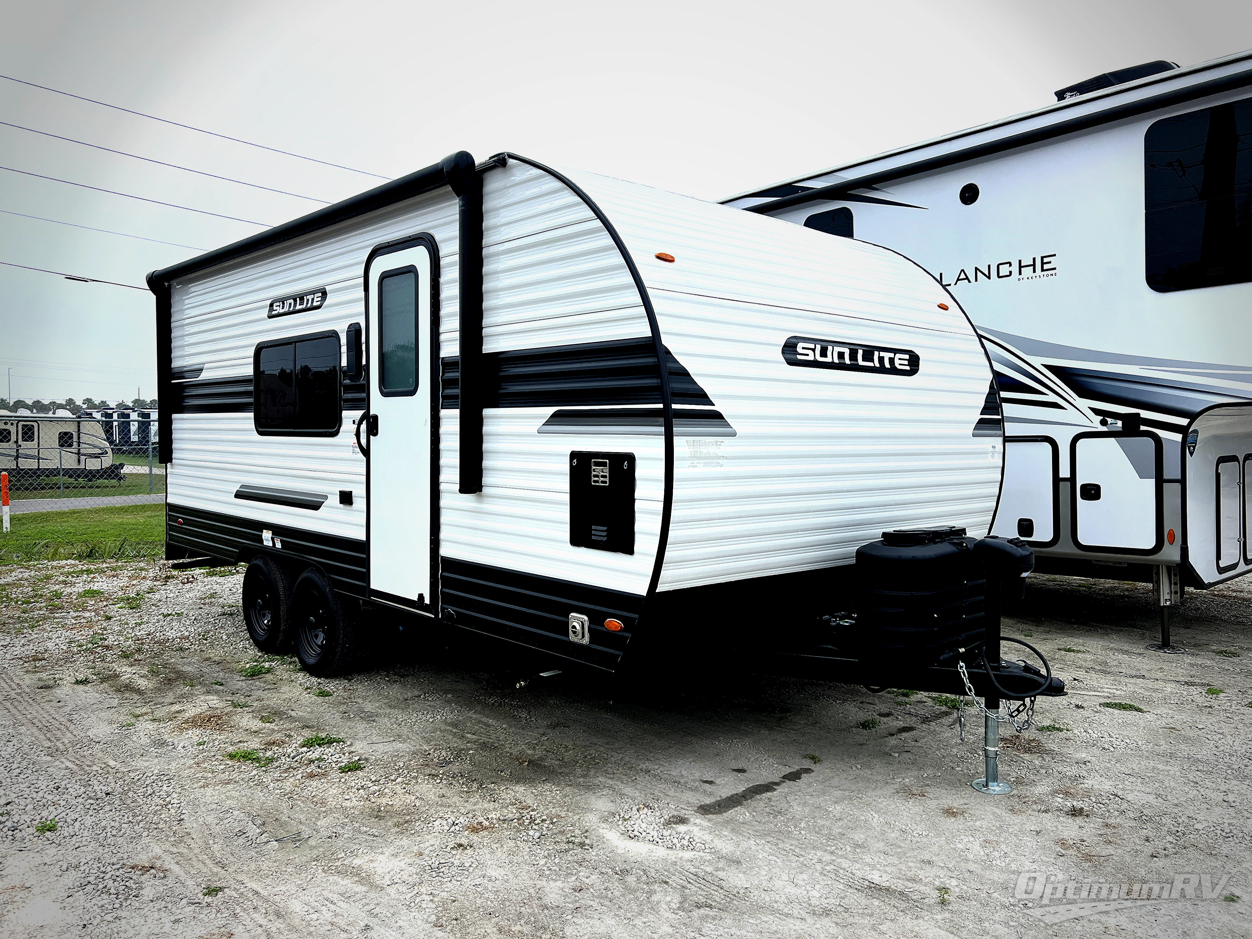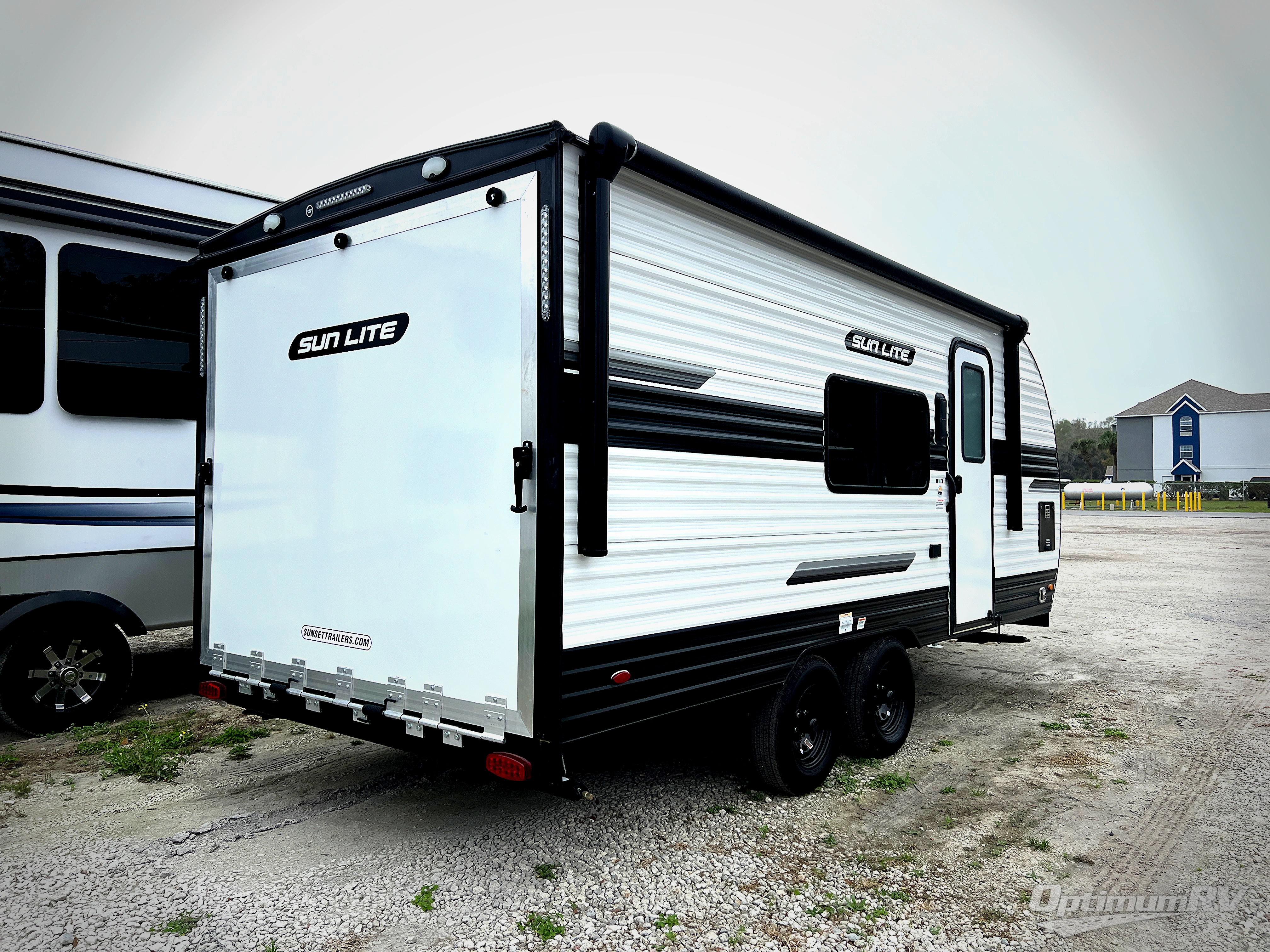 You can trust the build and enjoy your experience with any one of these Sunset Park RV Sun Lite travel trailers or toy haulers! Their aerodynamic profile is not only easy to haul, but also saves on fuel. They are built to withstand years of traveling even though they are lightweight with a diamond plate rock guard, a one piece PVC roof membrane, Dexter Spring-Leaf axles, and tinted safety glass windows. Some comfort standards you are sure to enjoy are the two-burner stove top range with hood, light and fan, plus the refrigerator and microwave, and an outside shower to help keep the dirt outdoors where it belongs.