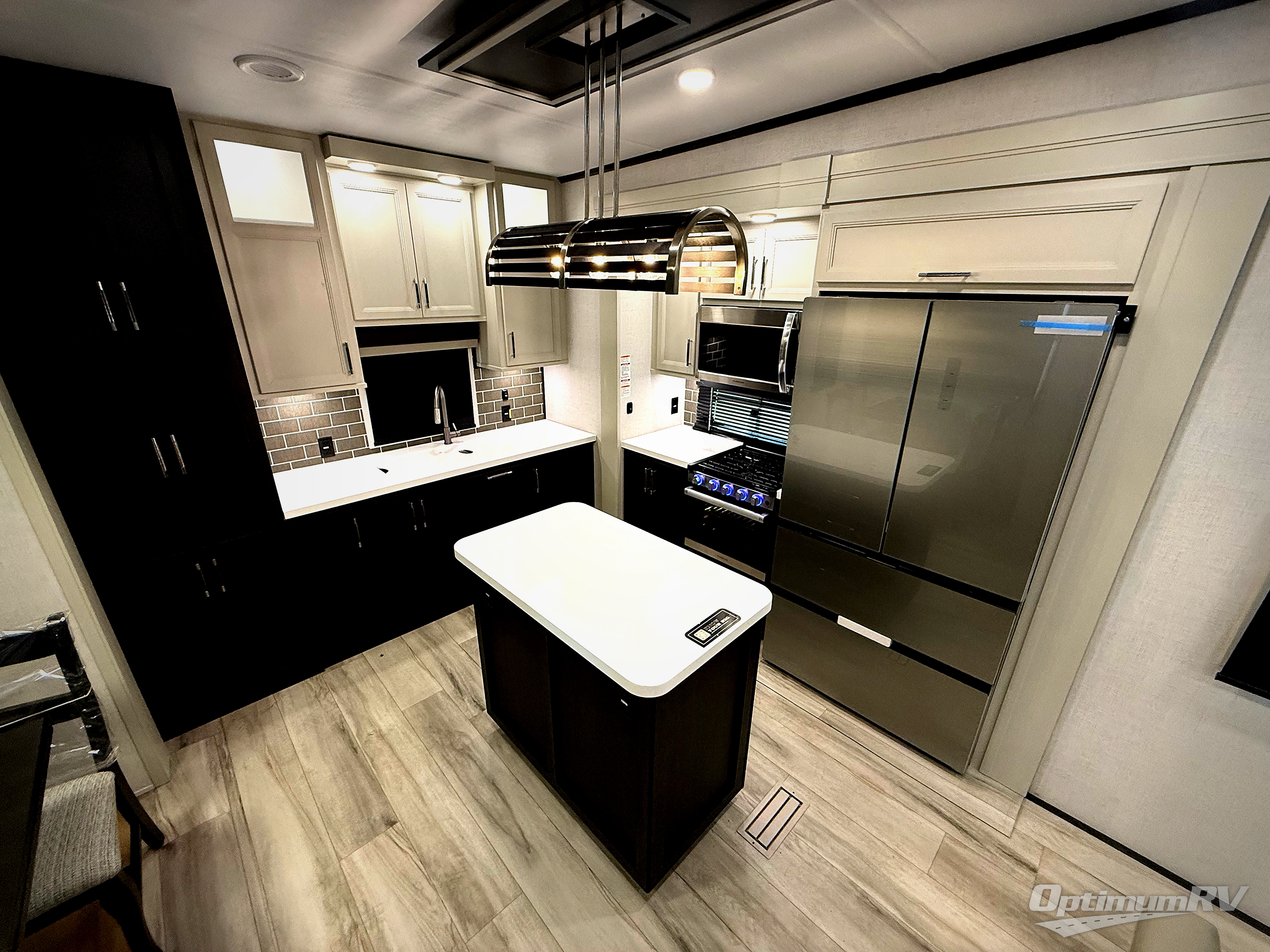 This rear kitchen fifth wheel makes extended stays or weekend trips to the lake enjoyable! The chef of your group will find plenty of counter space with the included kitchen island, plus there is a pantry and 18 cu. ft. residential refrigerator for food storage. A free-standing dinette provides a place to dine together, and the largest L-shaped sofa with recliners will be the perfect spot to relax with a movie. If you have guests, they could sleep here or on the hide-a-bed sofa sleeper. The dual entry bath includes a shower with a seat for added comfort, and the front master bedroom will feel just like home with its king bed slide out and master closet. There is also a dresser and stackable washer and dryer prep if you want to add those appliances!
