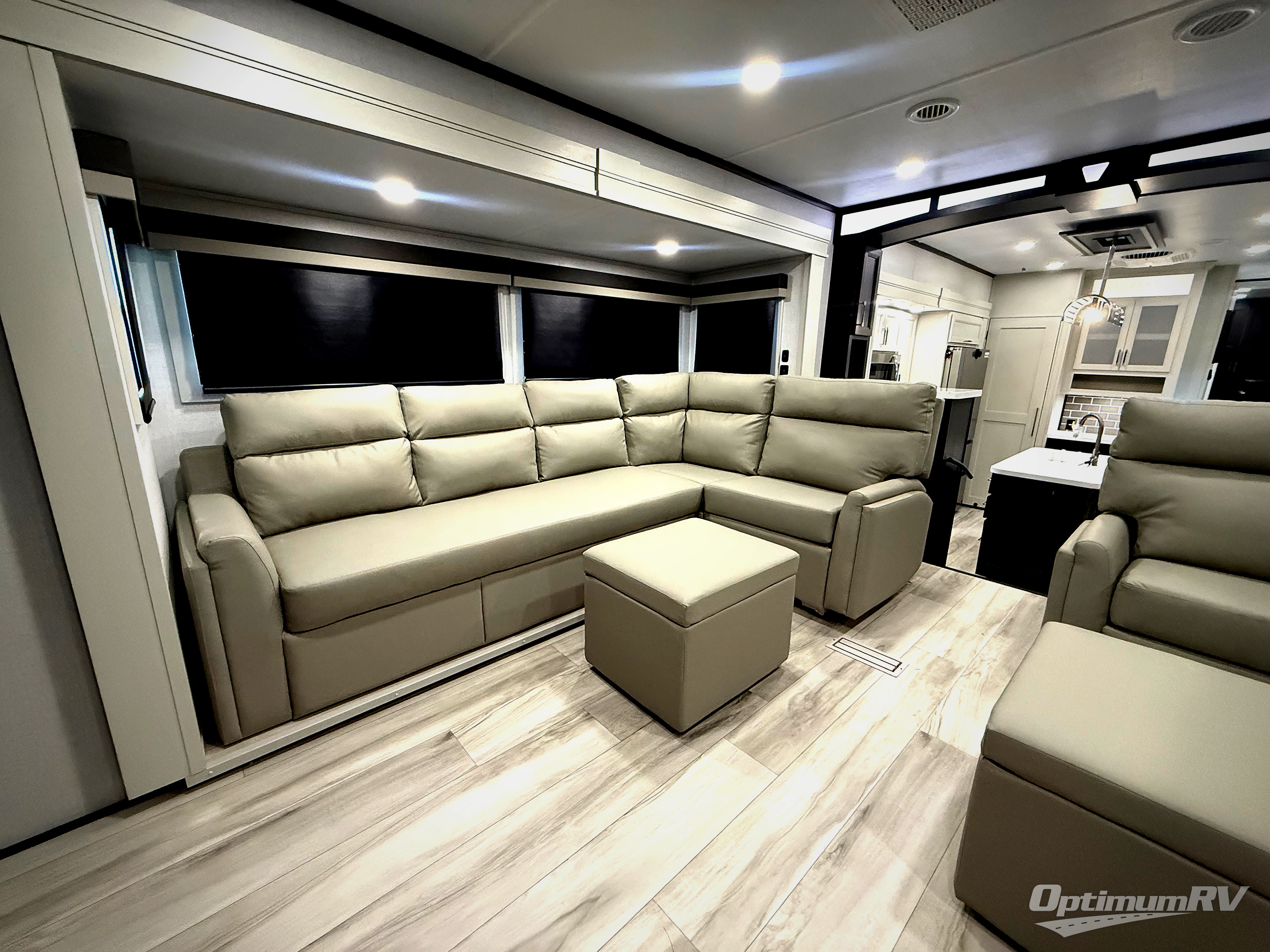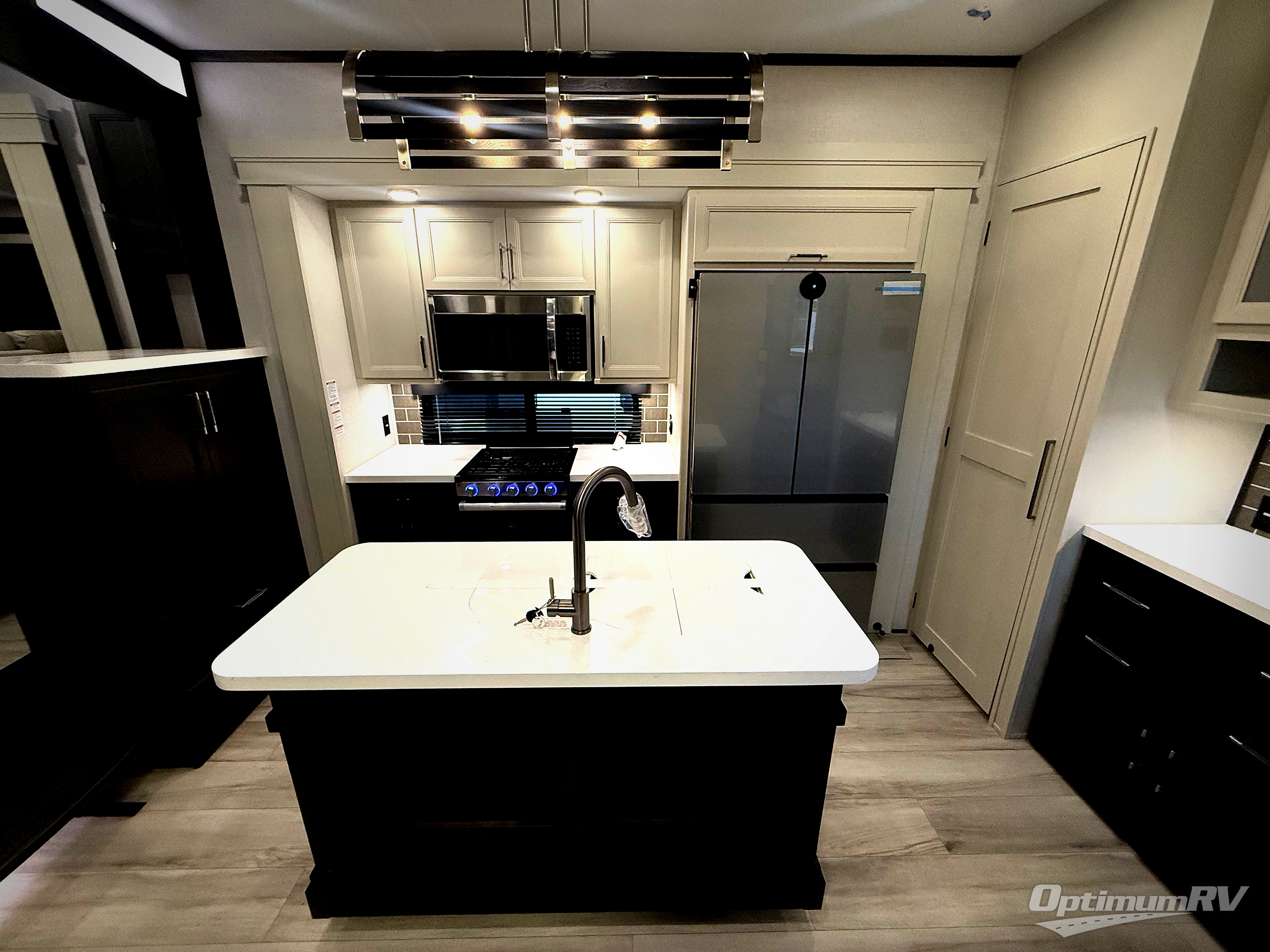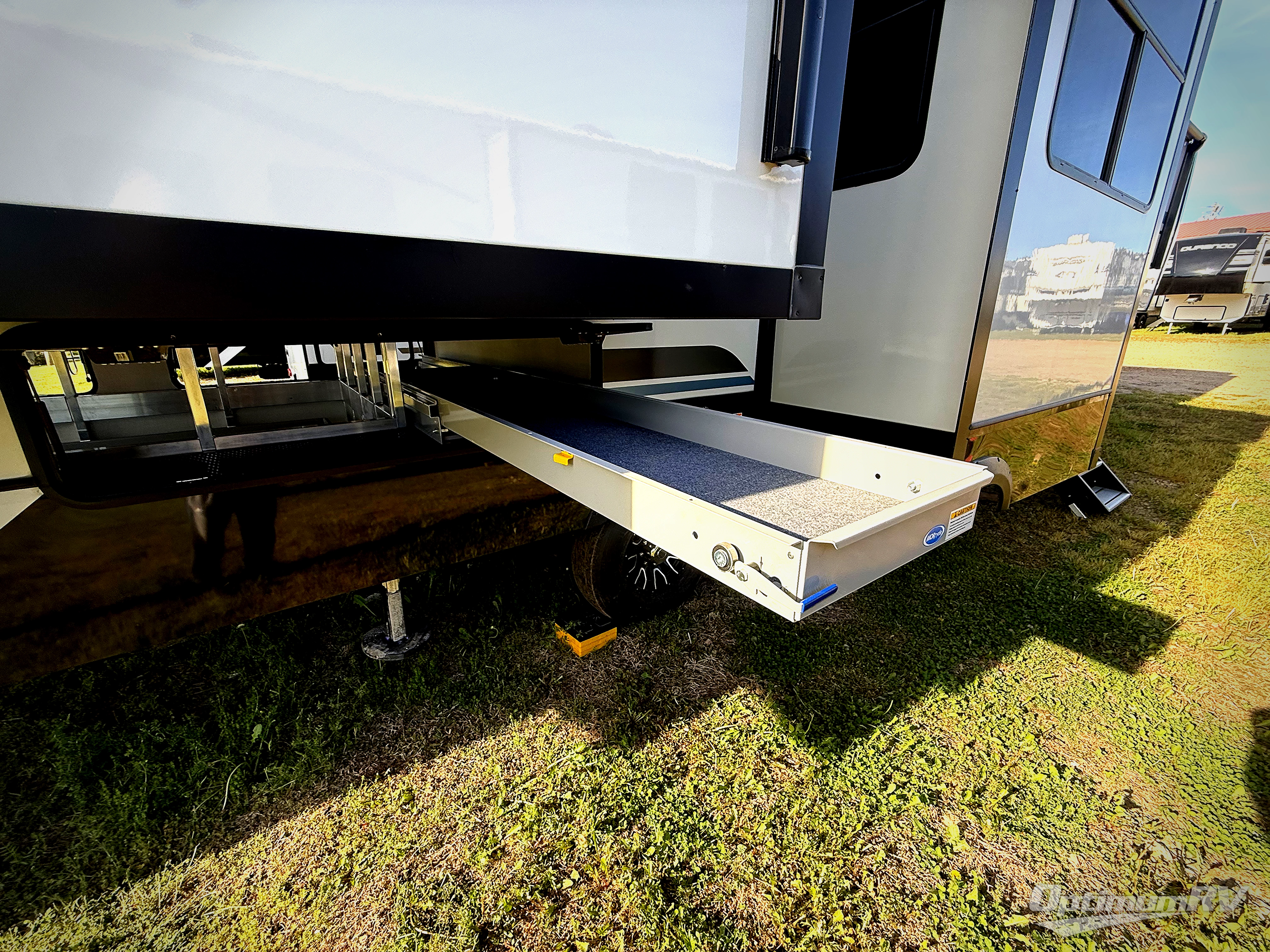It will be so easy to enjoy trips in this spacious fifth wheel that can sleep six each night! The rear living room features L-shaped sofa slide outs with ottomans, a 65" TV with a large feature wall, and a fireplace to make it cozier. There is a stylish lighted beam and lighted steps that lead to the middle kitchen with dual opposing slides, a kitchen island, triple pantries, and a free-standing dinette. And the chef will appreciate all the kitchen appliances to make their best meals for the whole gang. As you head up the steps, you'll find a full bath to easily freshen up each day, and you'll love the front private bedroom with a king bed slide, master closet with hidden shoe storage, plus stackable washer and dryer prep!