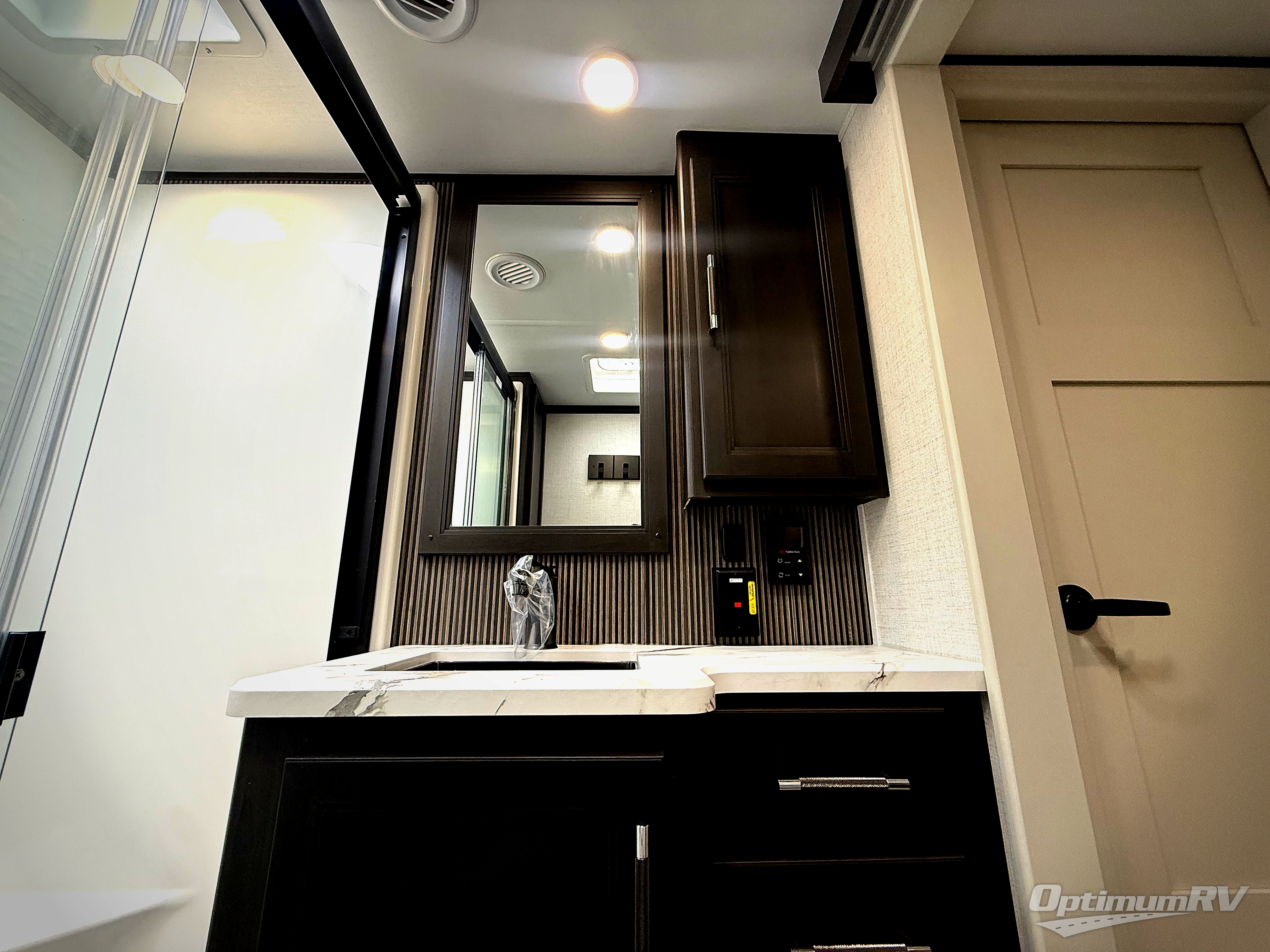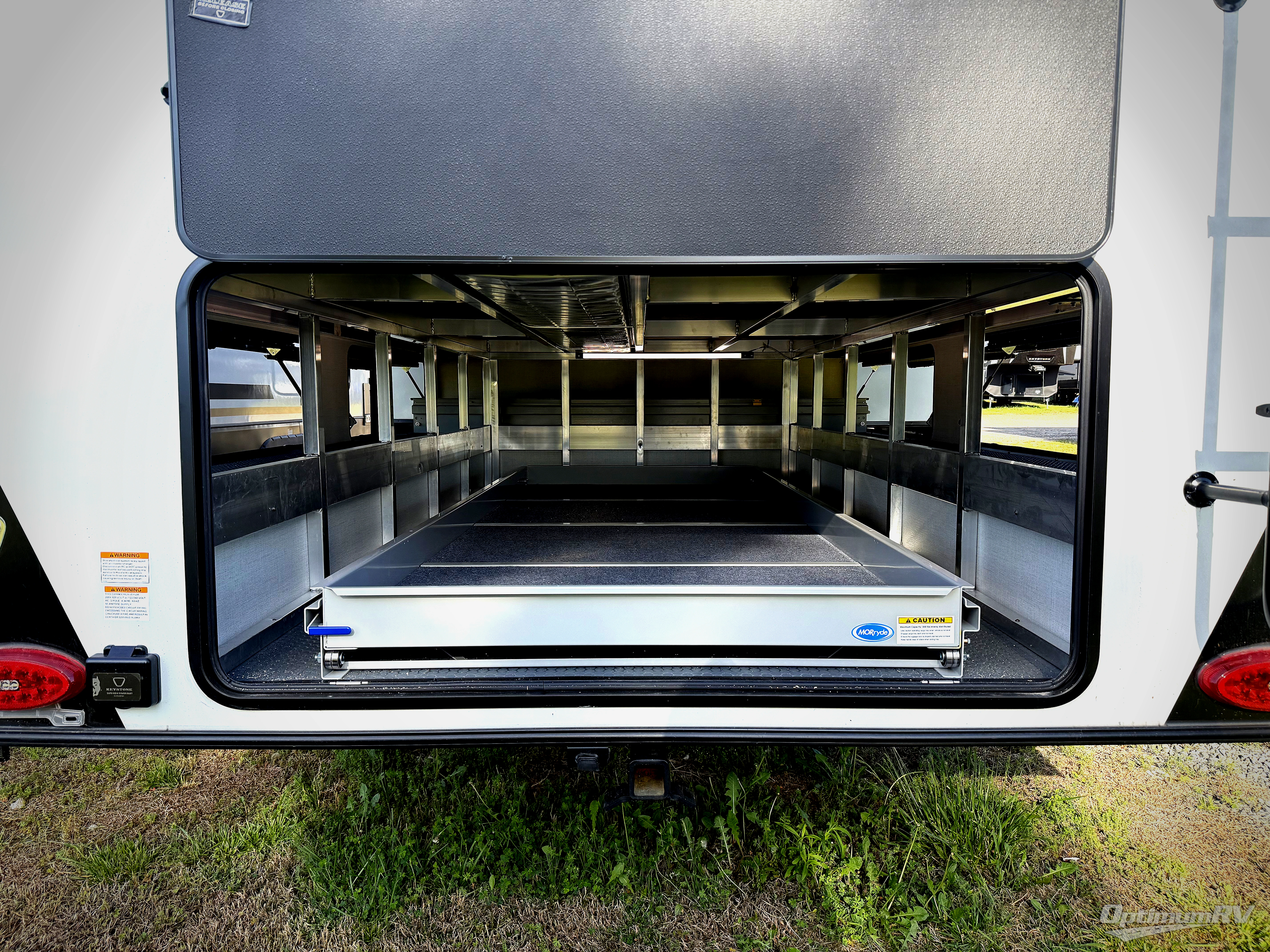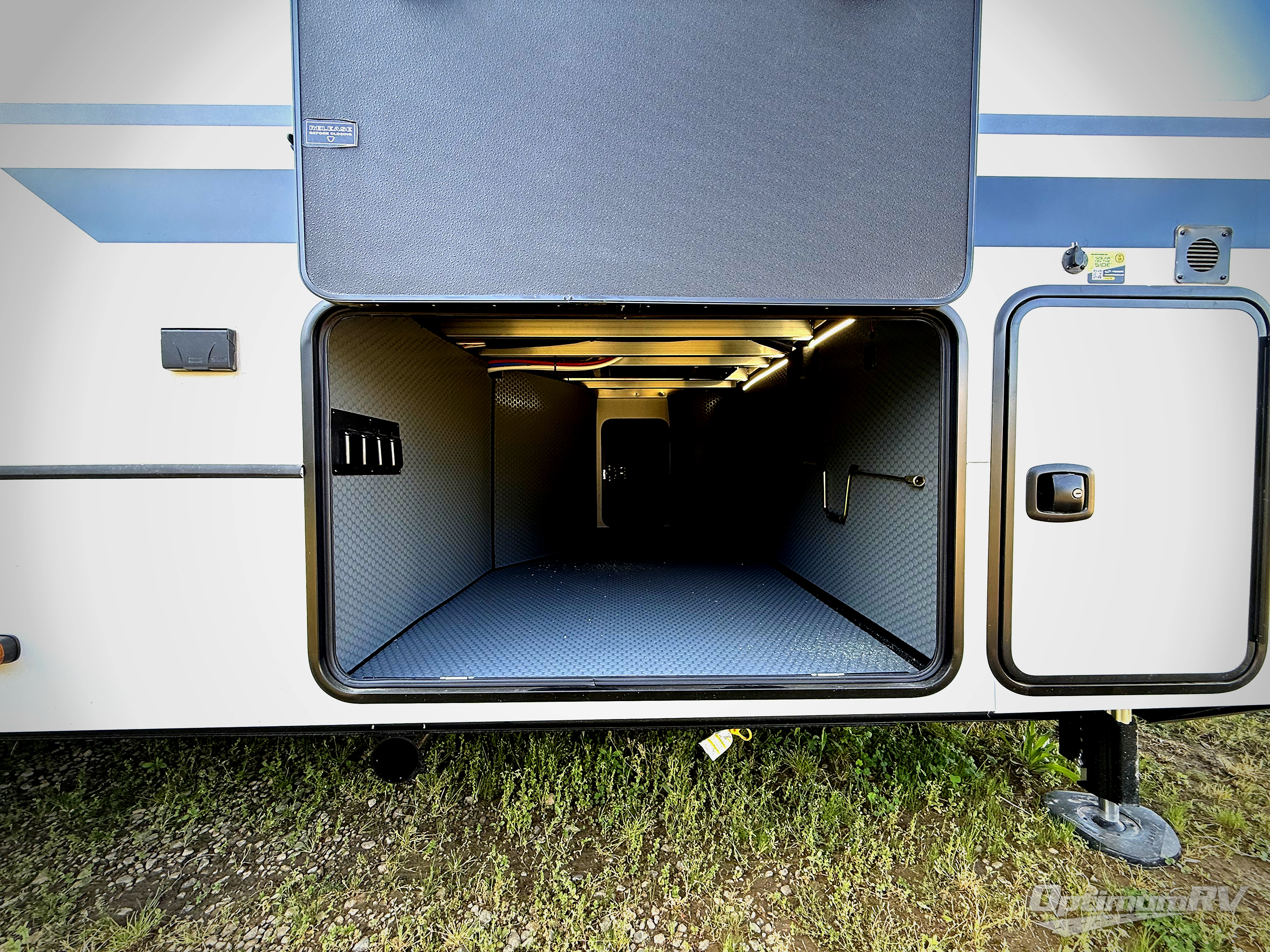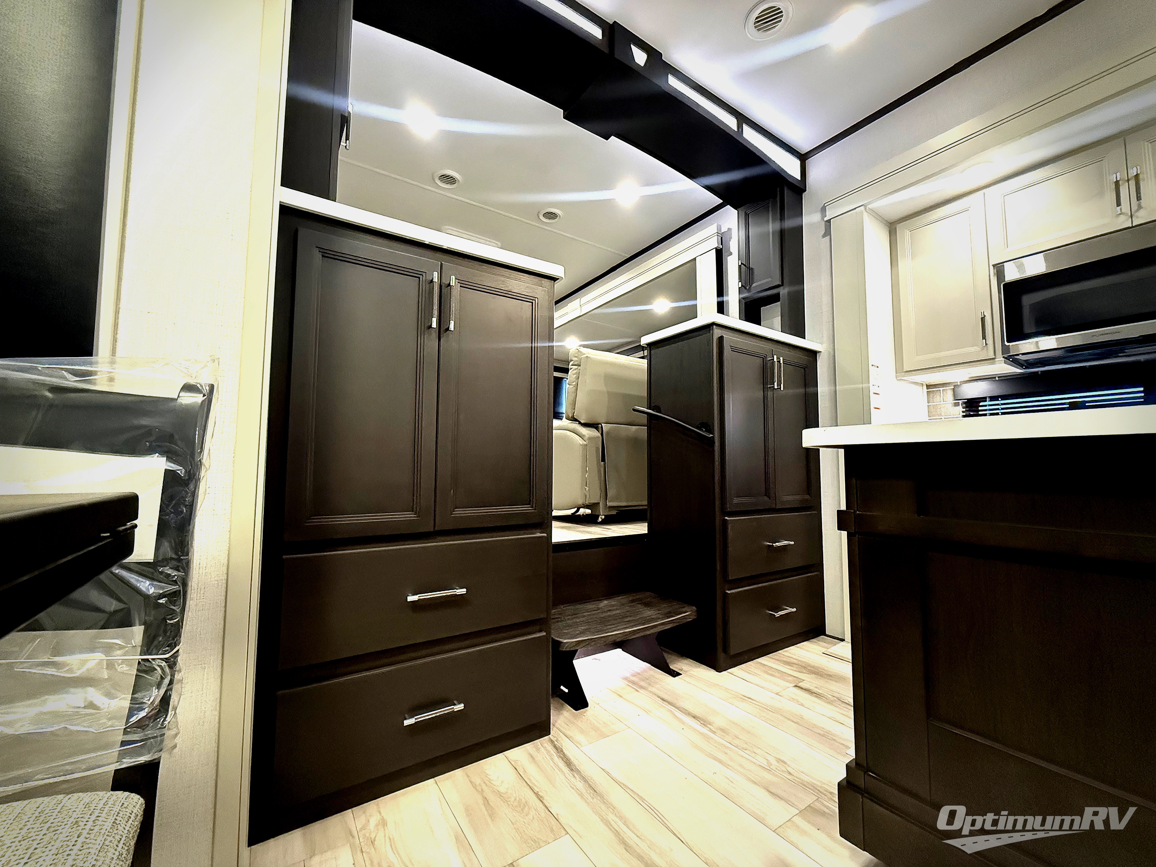 It will be so easy to enjoy trips in this spacious fifth wheel that can sleep six each night! The rear living room features L-shaped sofa slide outs with ottomans, a 65" TV with a large feature wall, and a fireplace to make it cozier. There is a stylish lighted beam and lighted steps that lead to the middle kitchen with dual opposing slides, a kitchen island, triple pantries, and a free-standing dinette. And the chef will appreciate all the kitchen appliances to make their best meals for the whole gang. As you head up the steps, you'll find a full bath to easily freshen up each day, and you'll love the front private bedroom with a king bed slide, master closet with hidden shoe storage, plus stackable washer and dryer prep!