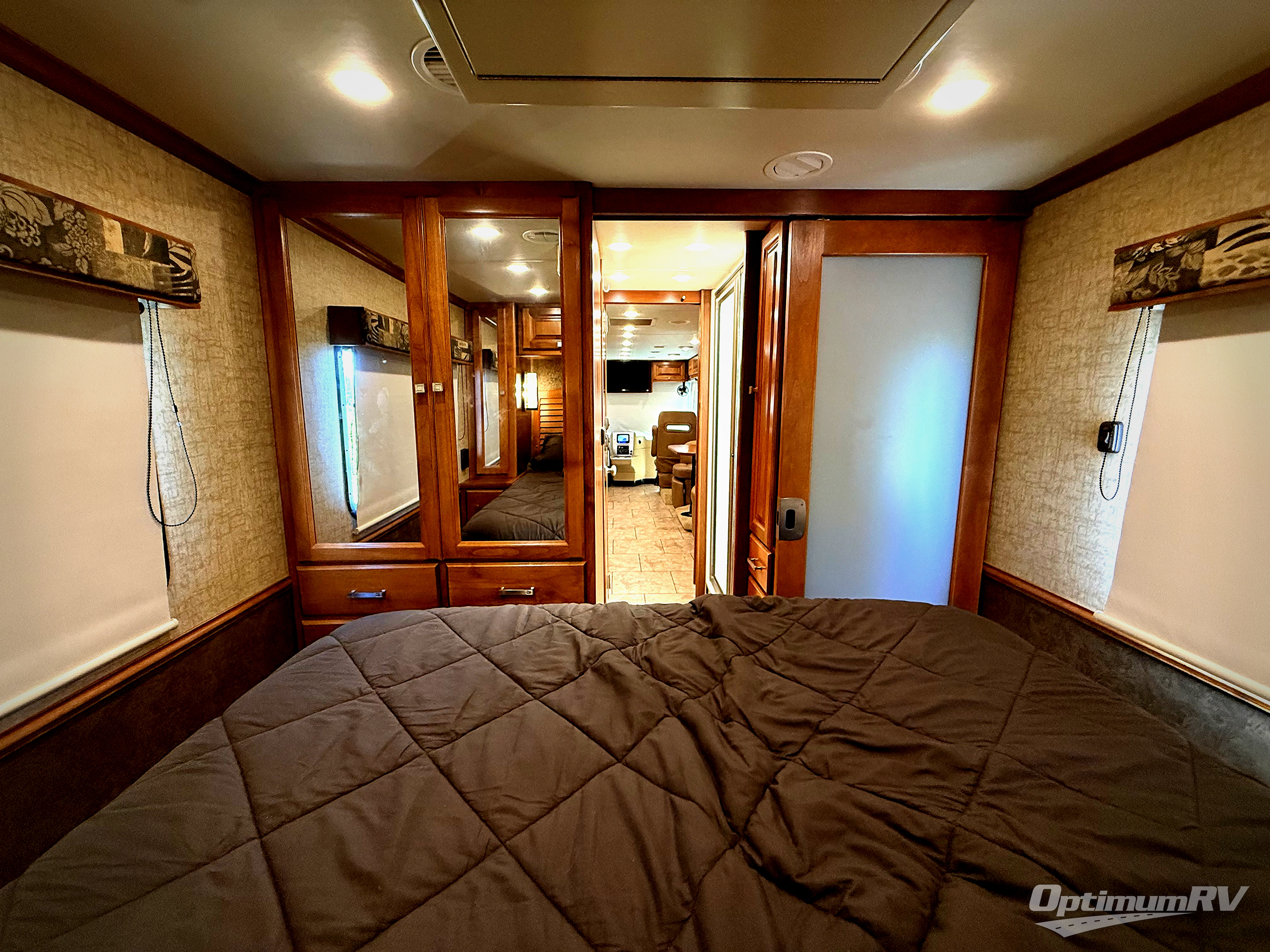 The rear bedroom holds a queen size bed with closets above nightstands at each side of the bed. There is a closet opposite the bed, as well as space for an optional TV.