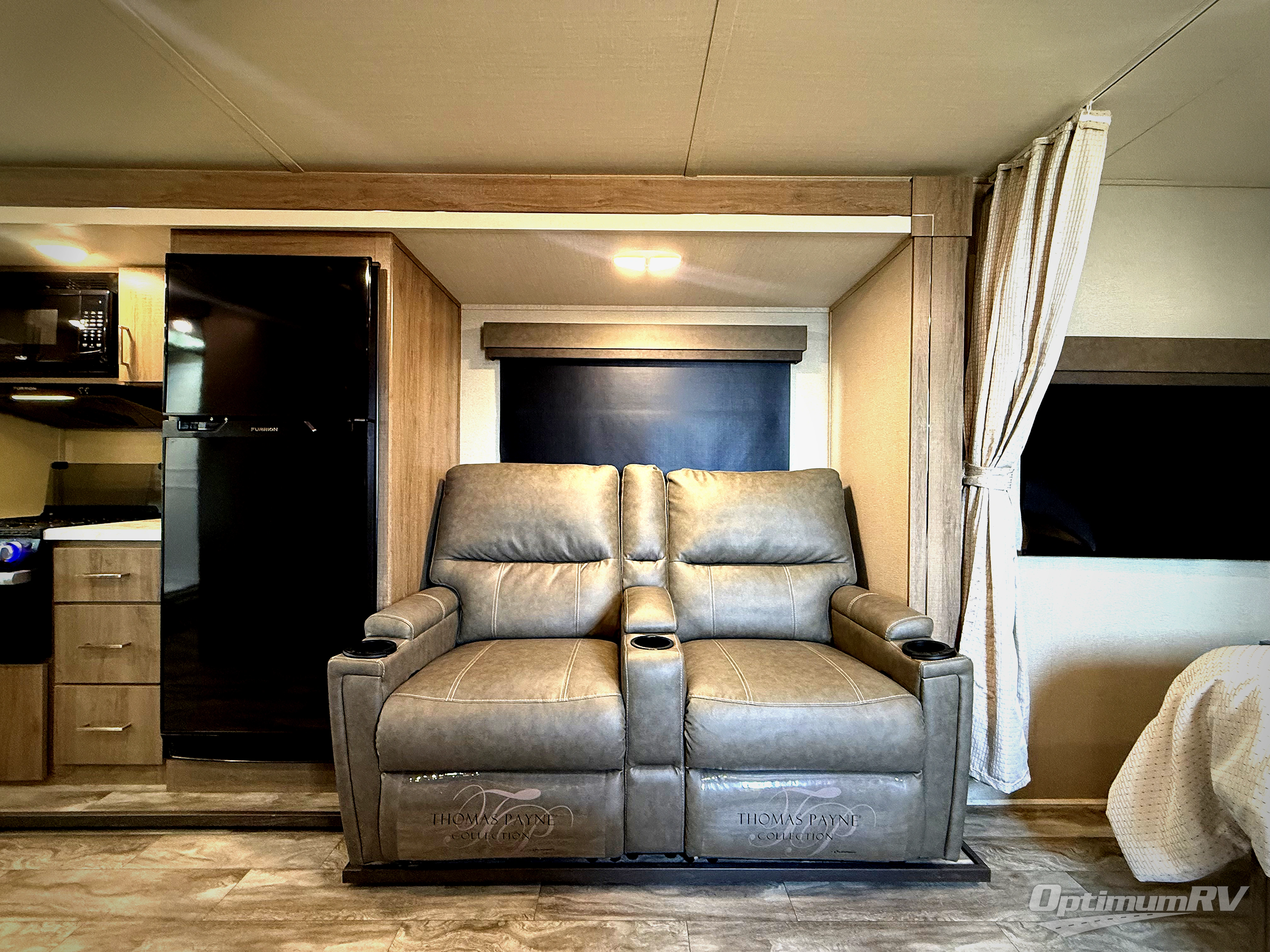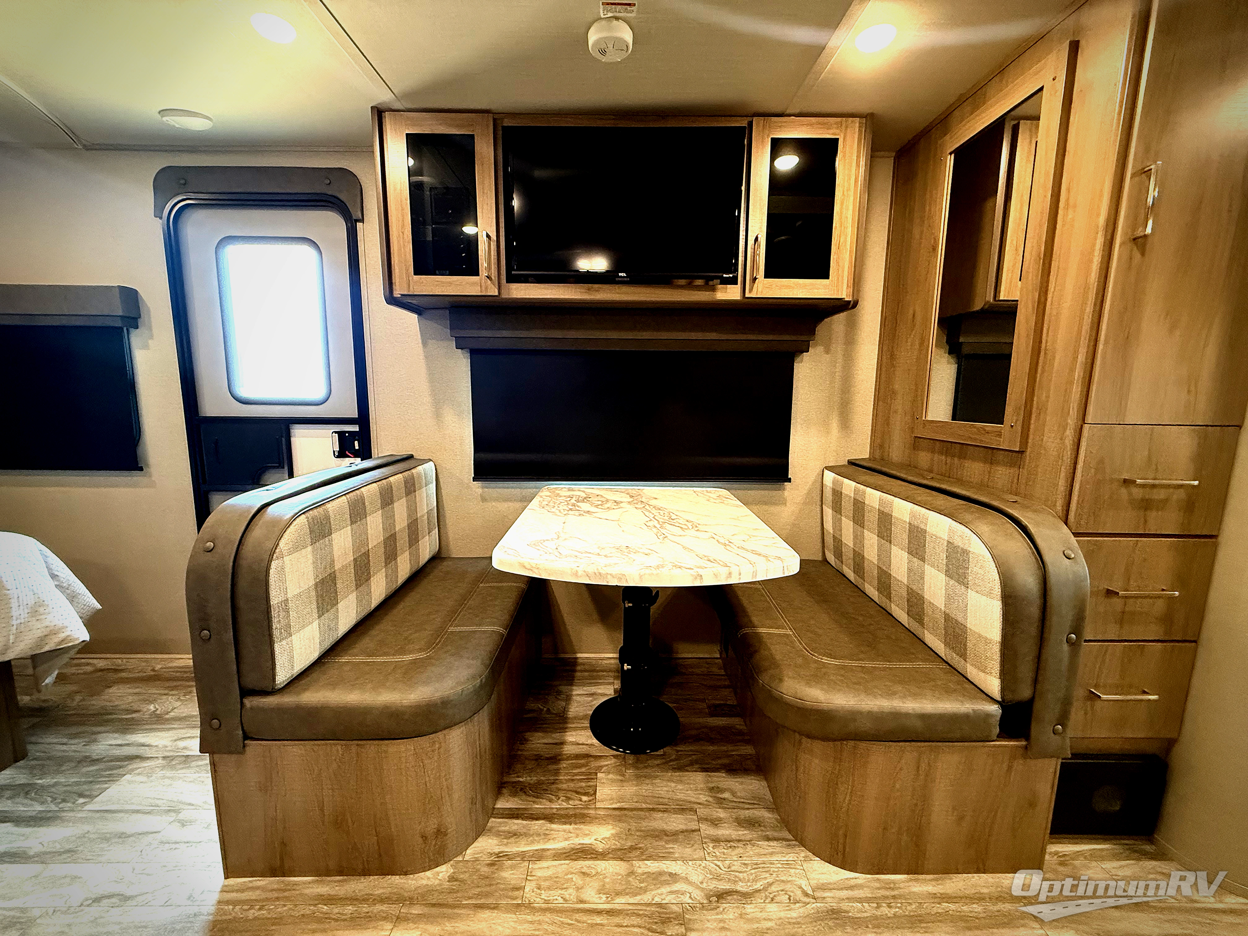 This Imagine XLS travel trailer has theater seating and a booth dinette that you can use any time you need a little break from the outdoors. If you want to come in and grab a coffee, put together a puzzle, or work on your itinerary for the week, just put up your feet and relax. You could even switch on the LED HDTV if you want a little entertainment. The front queen-size bed has a privacy curtain that you can draw to create a semi-private bedroom, and in the back of the trailer you will find the rest of your amenities, like the kitchen and the bathroom. The large slide makes it easy to enjoy spending your time indoors, but if you do want to get back outside, you can sit underneath the 18' electric awning for some shade.