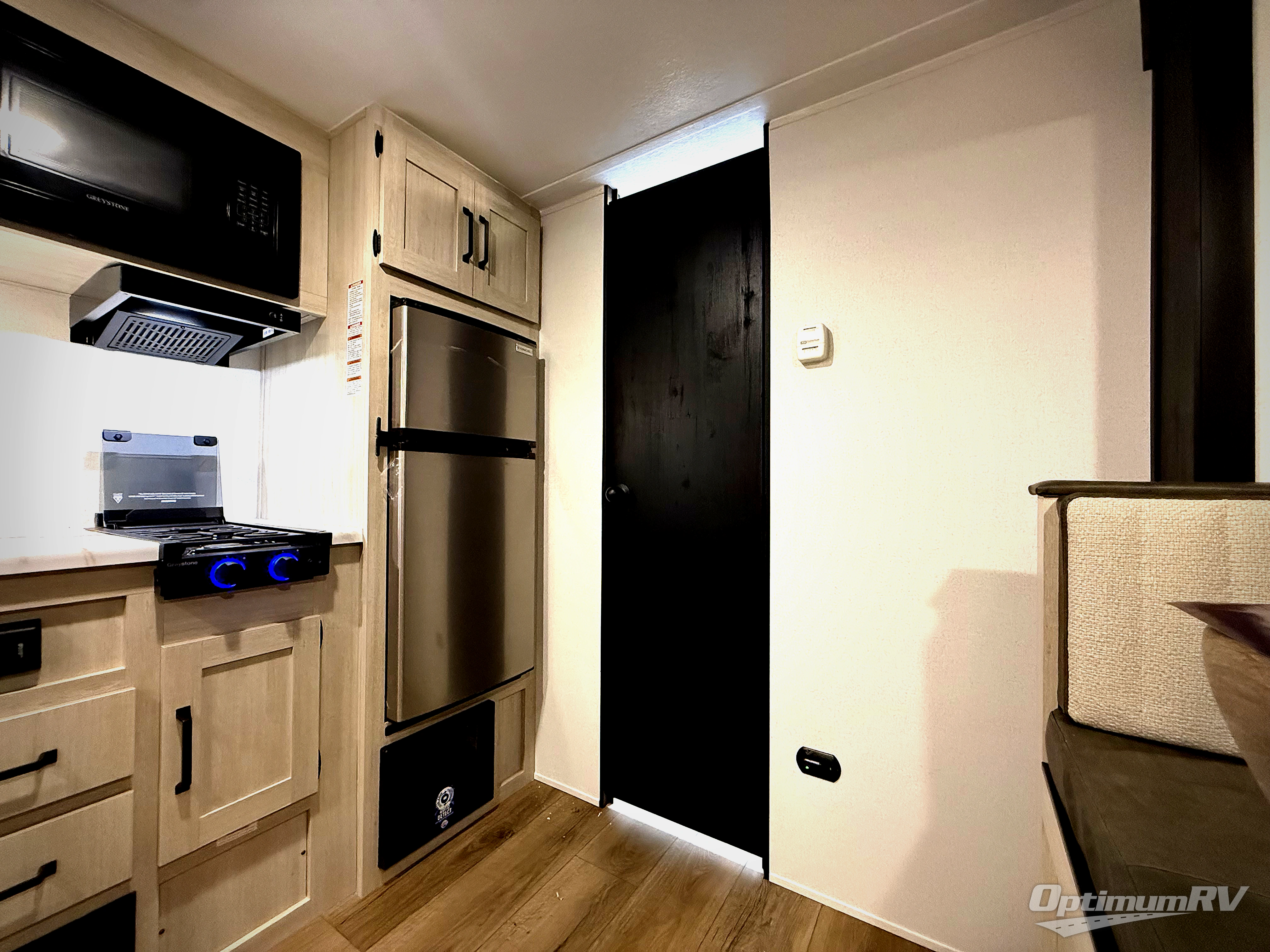 This travel trailer includes everything you need for camping trips at the lake. You'll sleep great each night on the front RV queen bed with a shirt closet to keep your things organized, or you can choose the optional Murphy bed with a shelf. The chef of your group can make meals on the two-burner cooktop or in the microwave oven, then you can dine around the U-shaped dinette slide. A full rear bath includes a 36" x 30" shower, a toilet, vanity, plus a medicine cabinet to keep your things organized.
