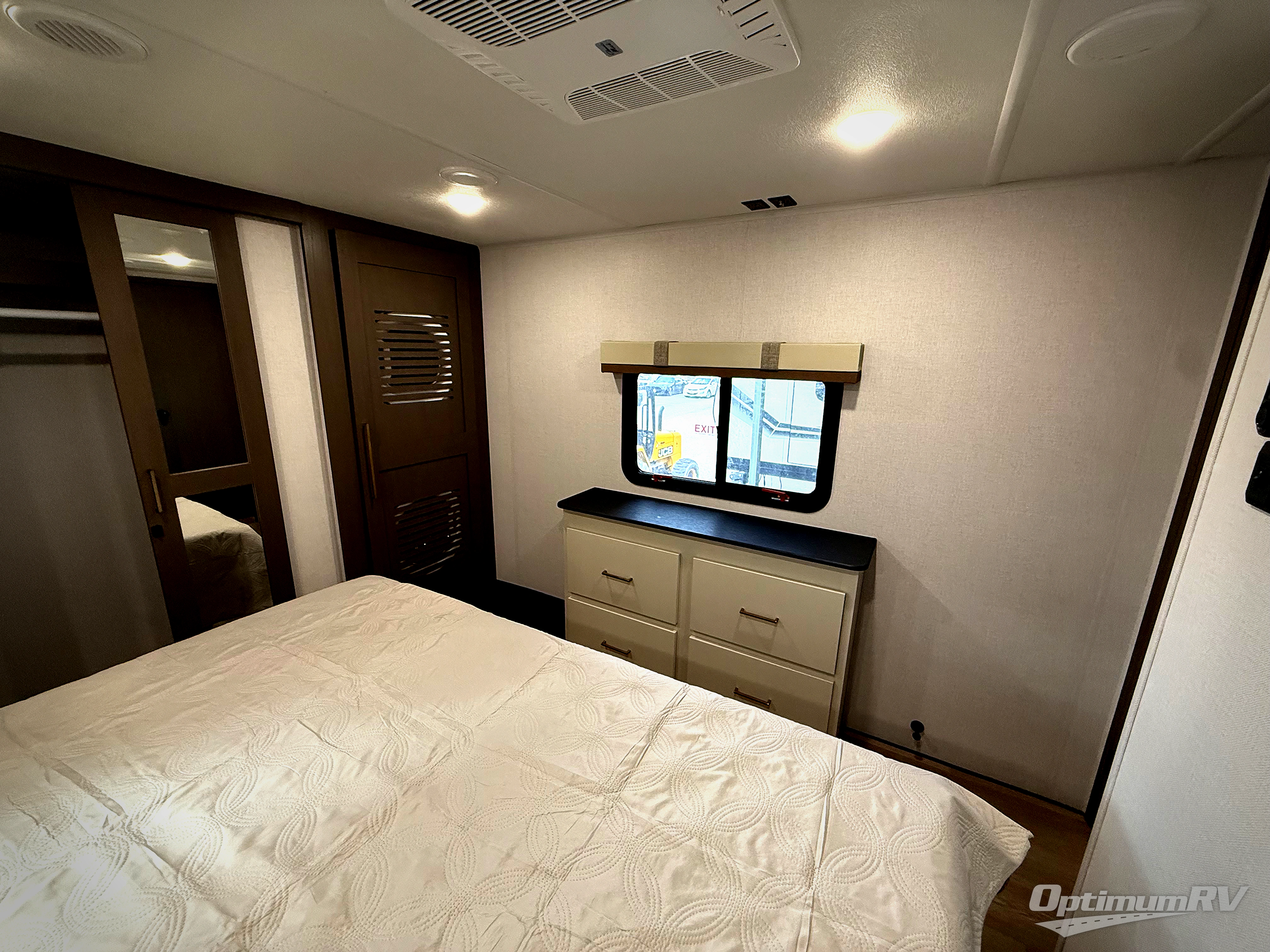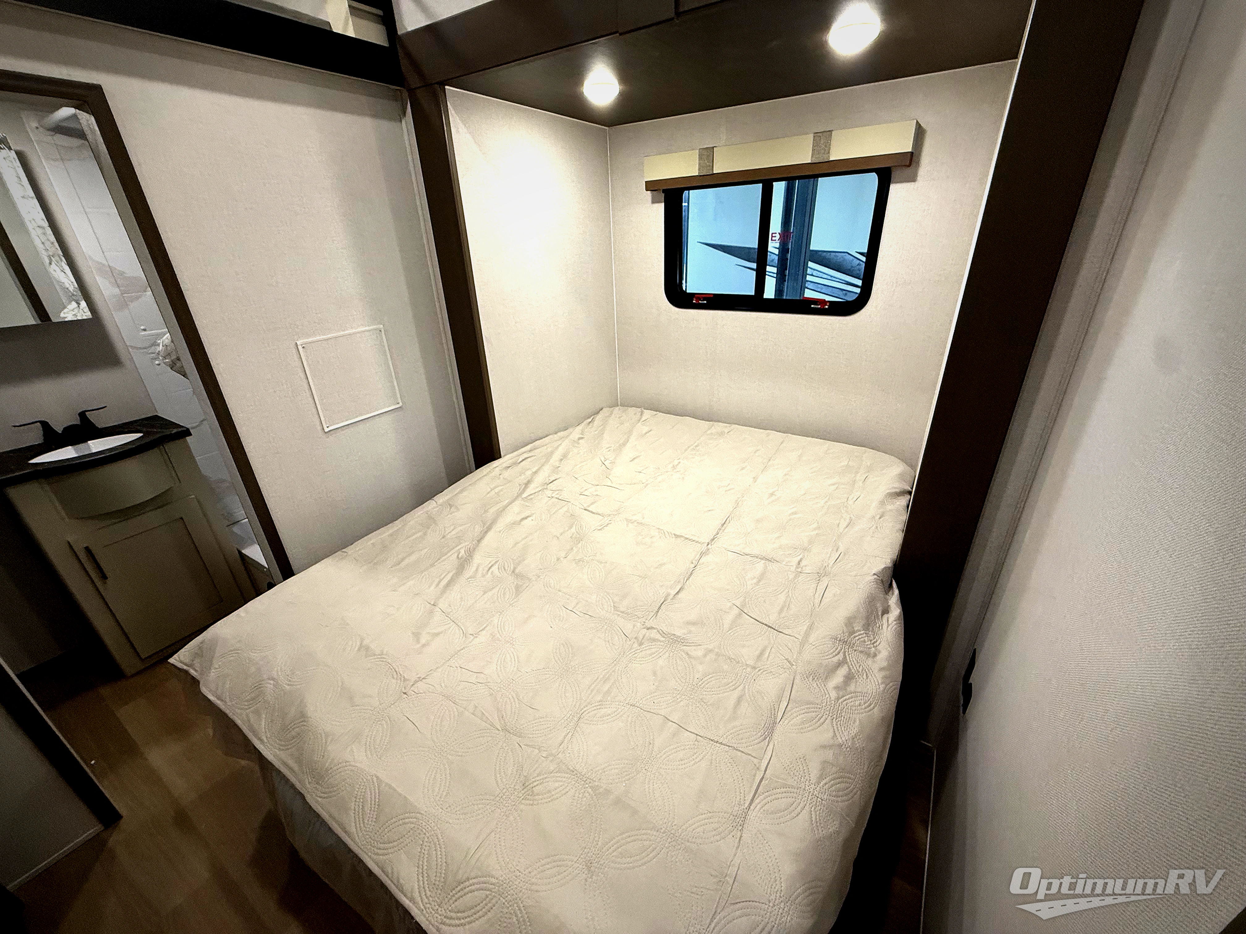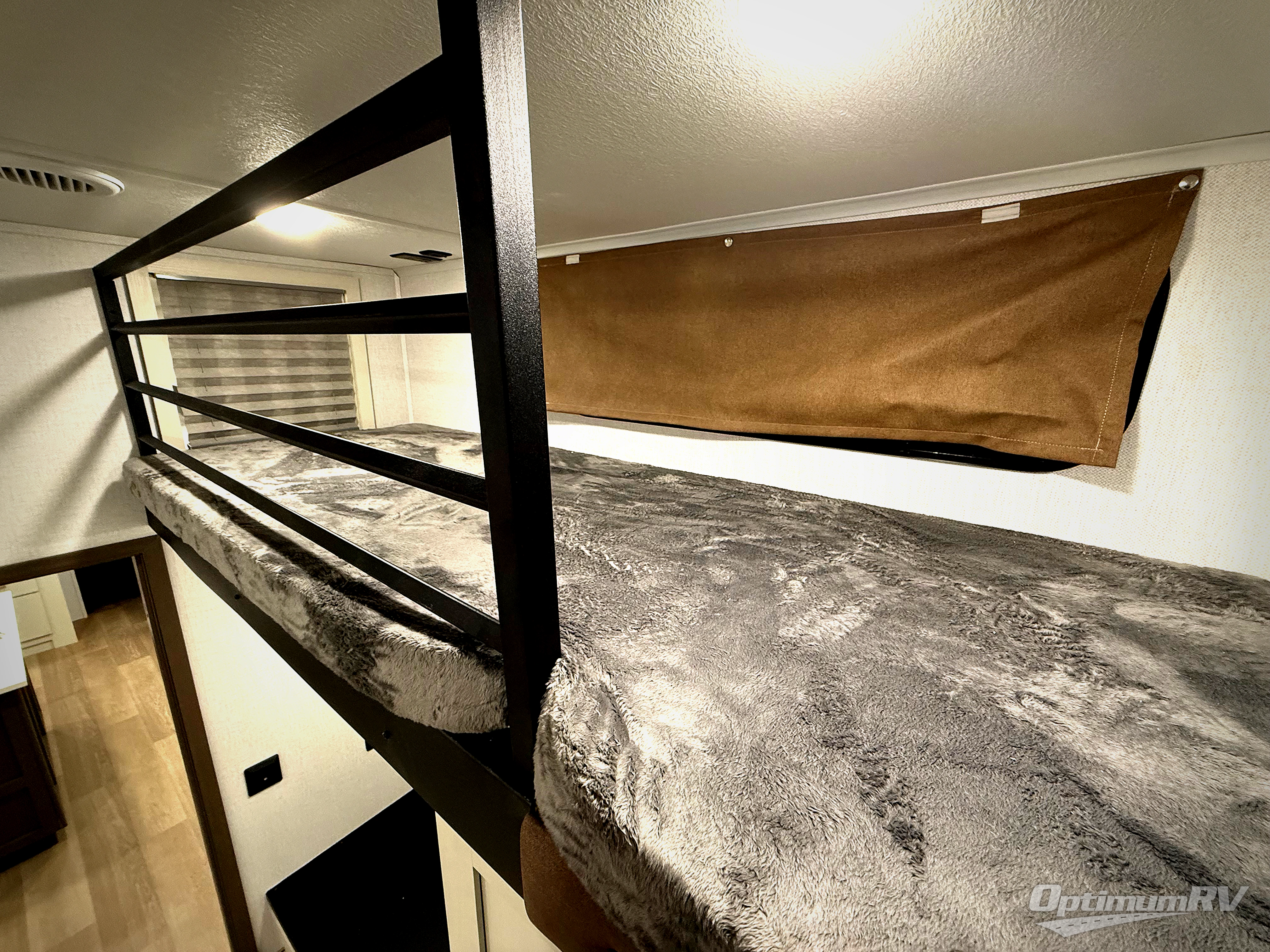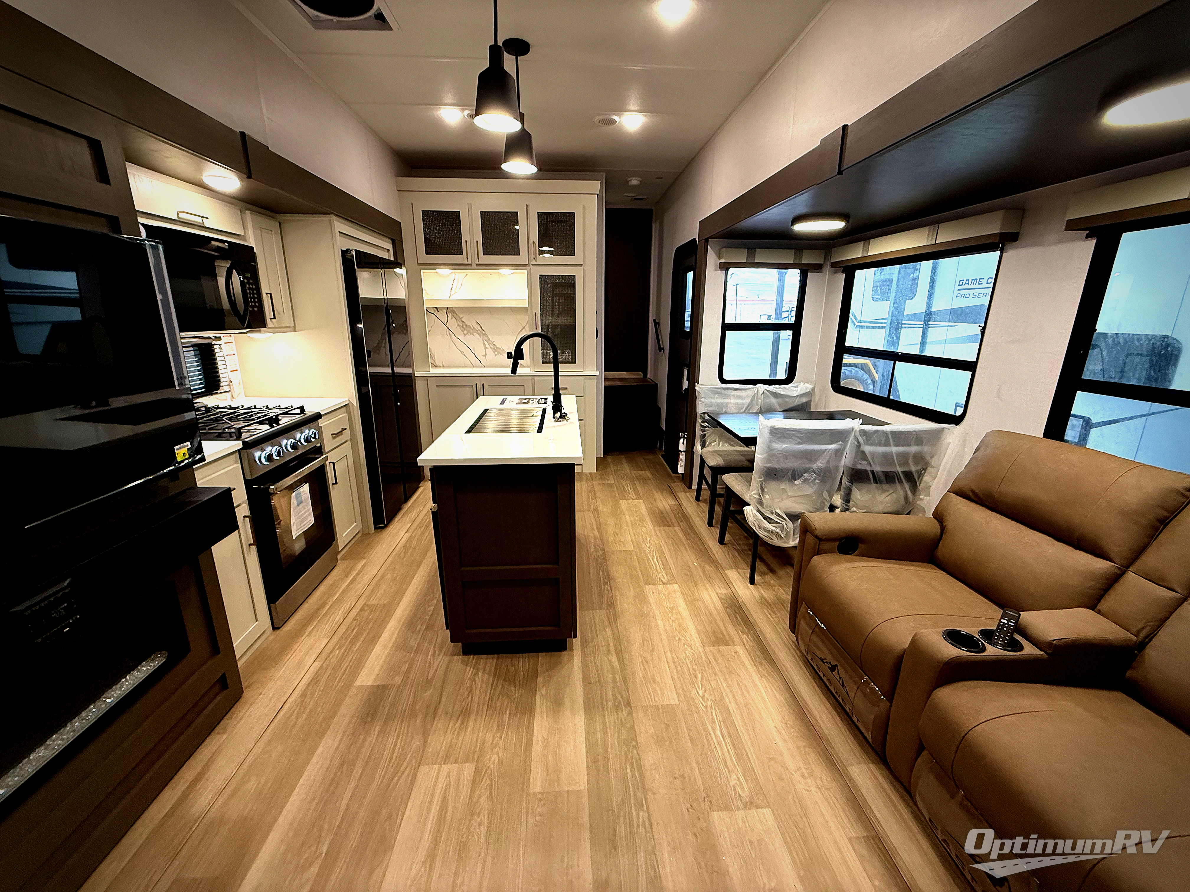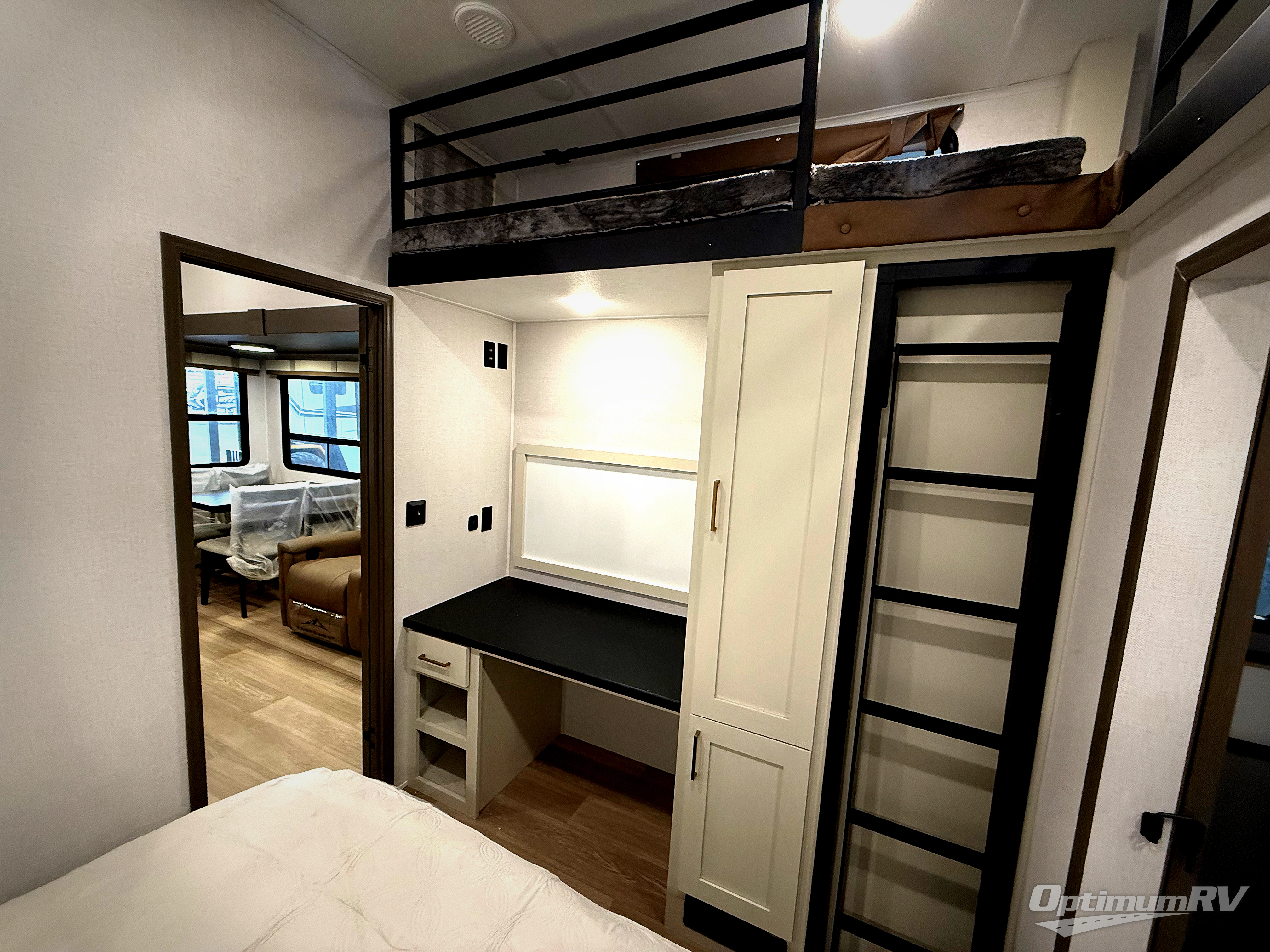 This is the perfect fifth wheel if you enjoy bringing along extra friends and family! You'll have the front private bedroom all to yourselves with a king bed slide out, a dresser with TV prep, plus a large front wardrobe and stackable washer/dryer prep. And a full bath is right next door for easy use. Your guests will love the rear den suite with a power tilt queen bed slide and a desk with a chair. There is also a full rear bath with its own exterior entry door and a loft area for even more sleeping or storage space. In the morning, you can all meet in the combined kitchen and living area that includes dual opposing slides for more space, a kitchen island, and a hutch for additional storage. There is also theater seating in direct view of the 50" TV and fireplace, along with a dinette with four chairs where you can dine together.