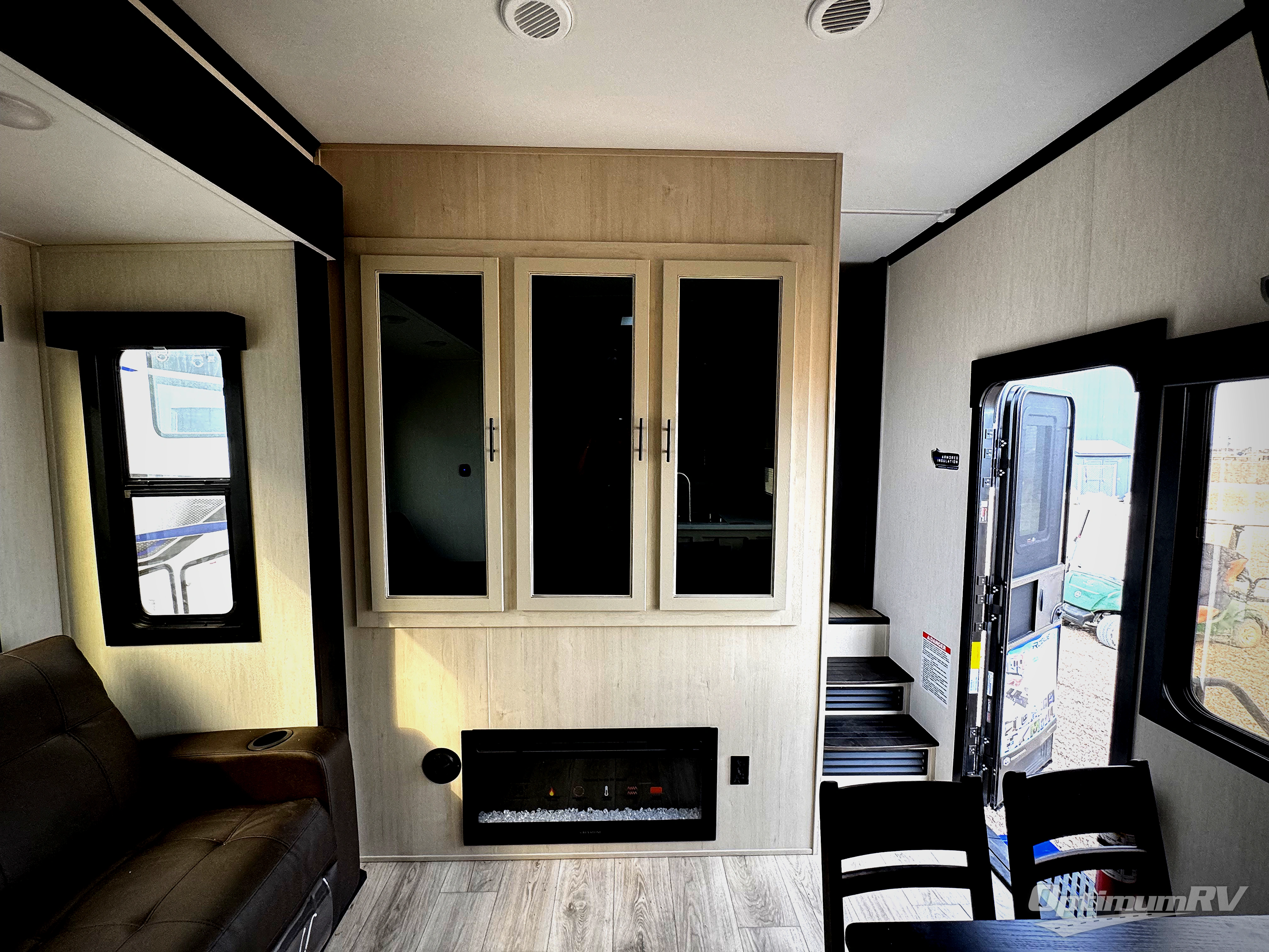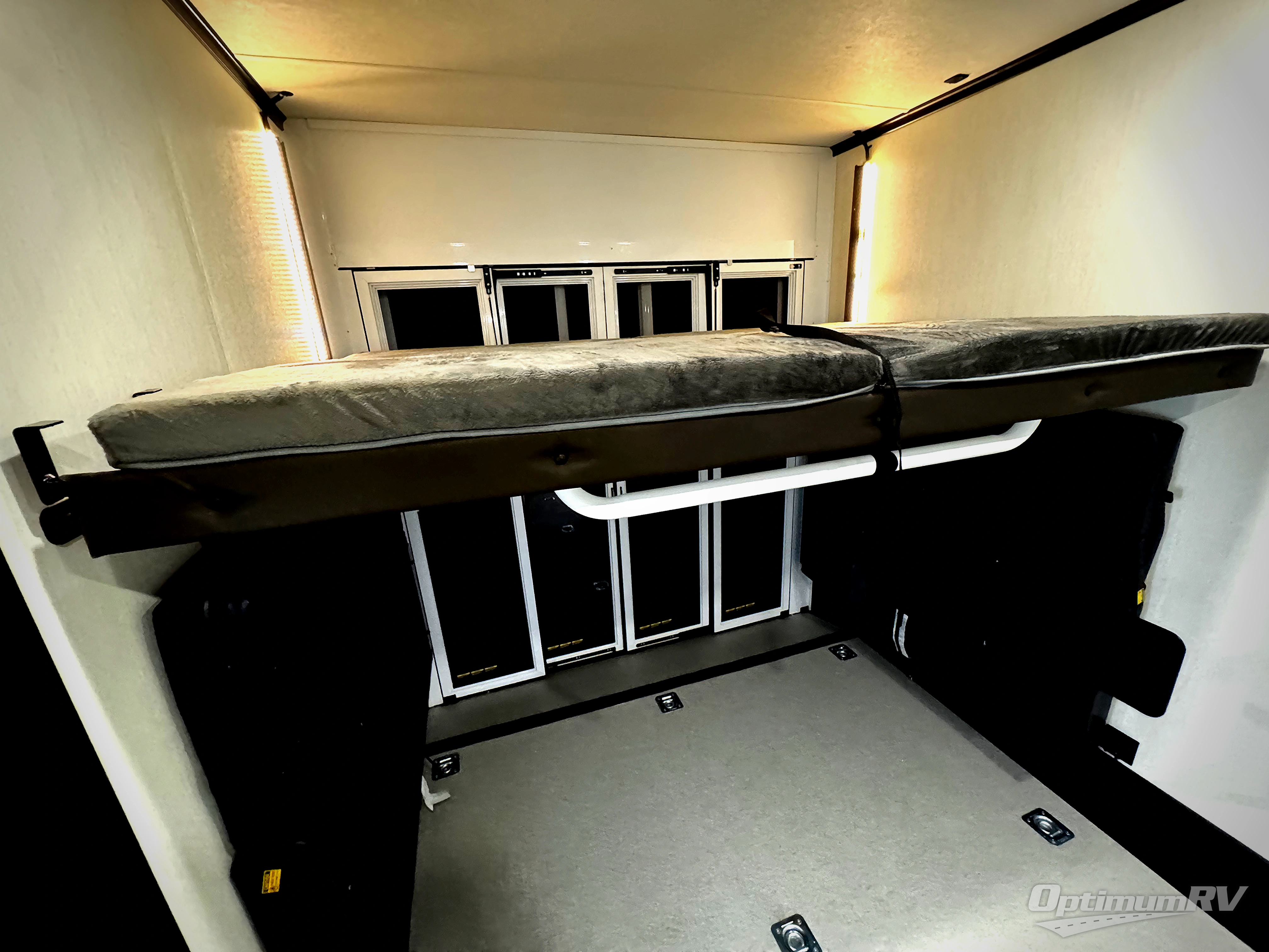 This toy hauler is perfect for a larger group since it can sleep up to eight with the added loft in the garage. There are also dual flip-up sofas here, along with a queen bed above and a half bath for added convenience! The dual entry full bath is up front, creating a master bedroom you are sure to love. There is a king bed slide out, a front wardrobe, and a dresser to keep your things organized. Head to the middle kitchen and living room to relax on the sofa within the large slide out, dine at the table with four chairs, and cook in the full kitchen. This unit also includes a fireplace to make it cozier, a large pantry to keep snacks stocked, and dual power awnings to expand your living space outdoors!