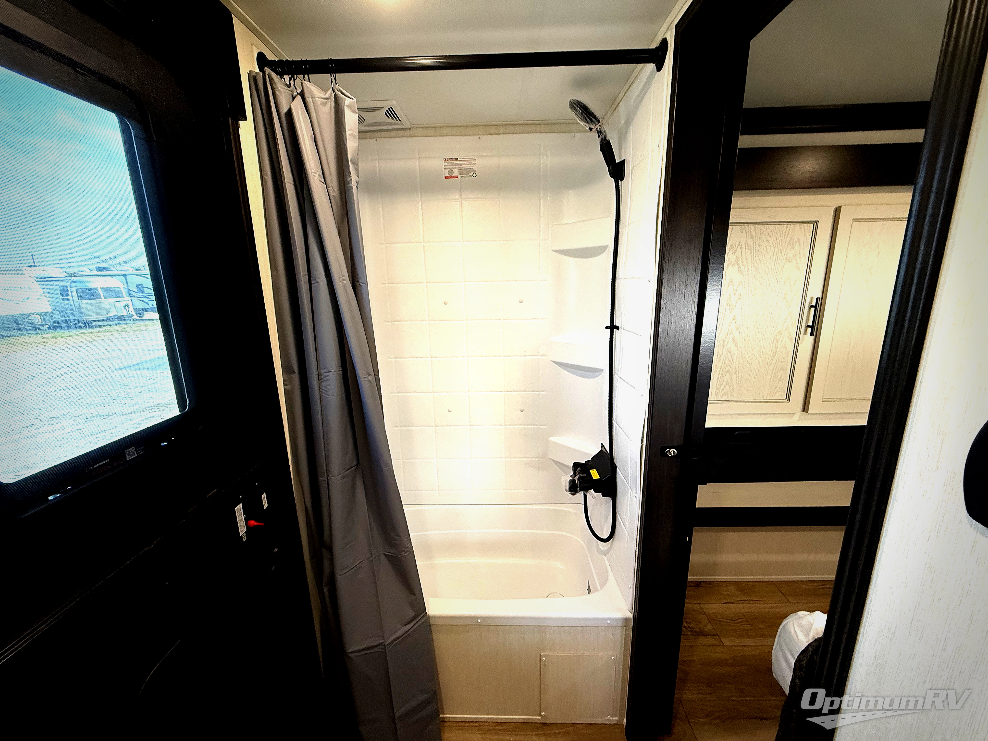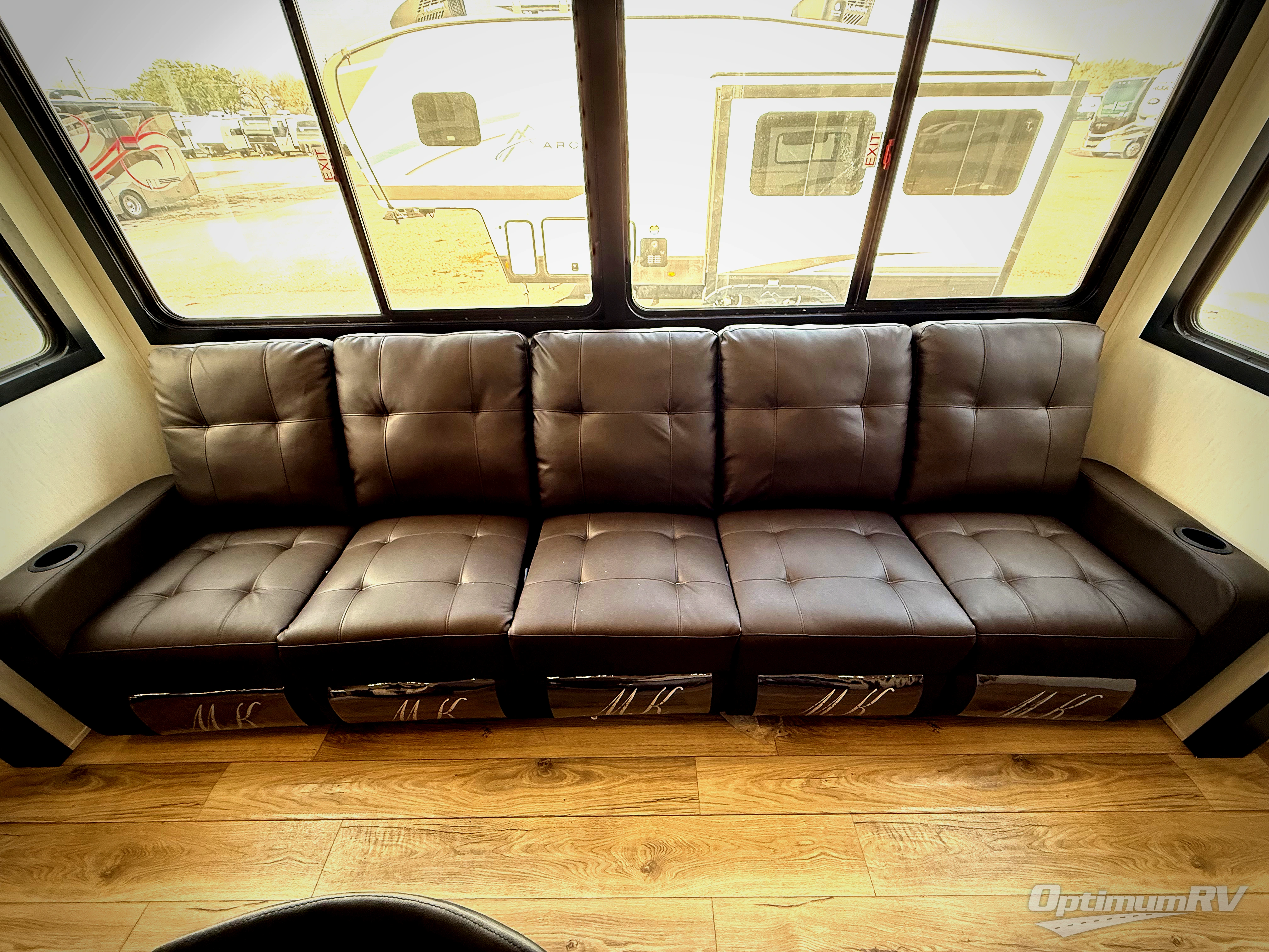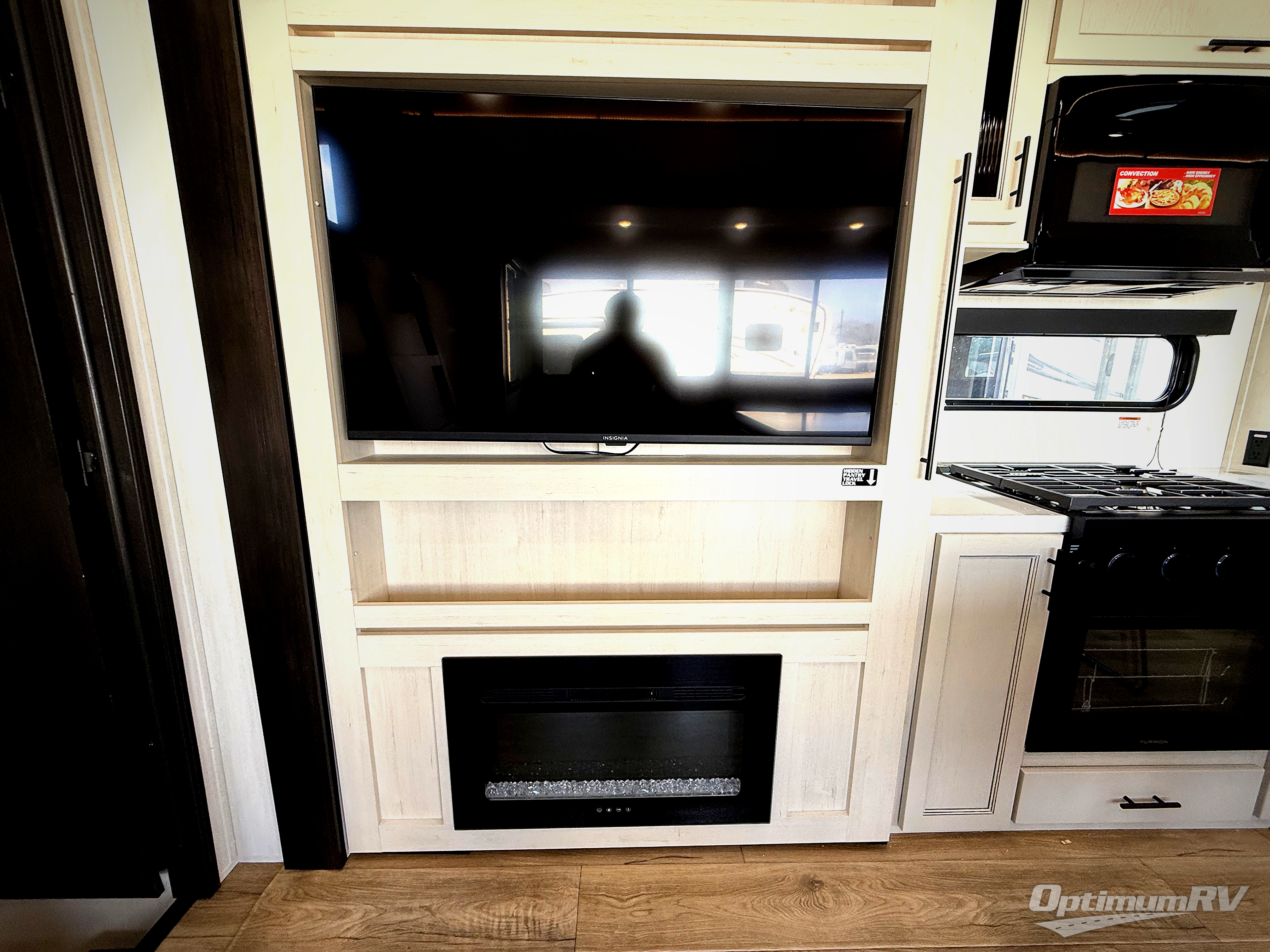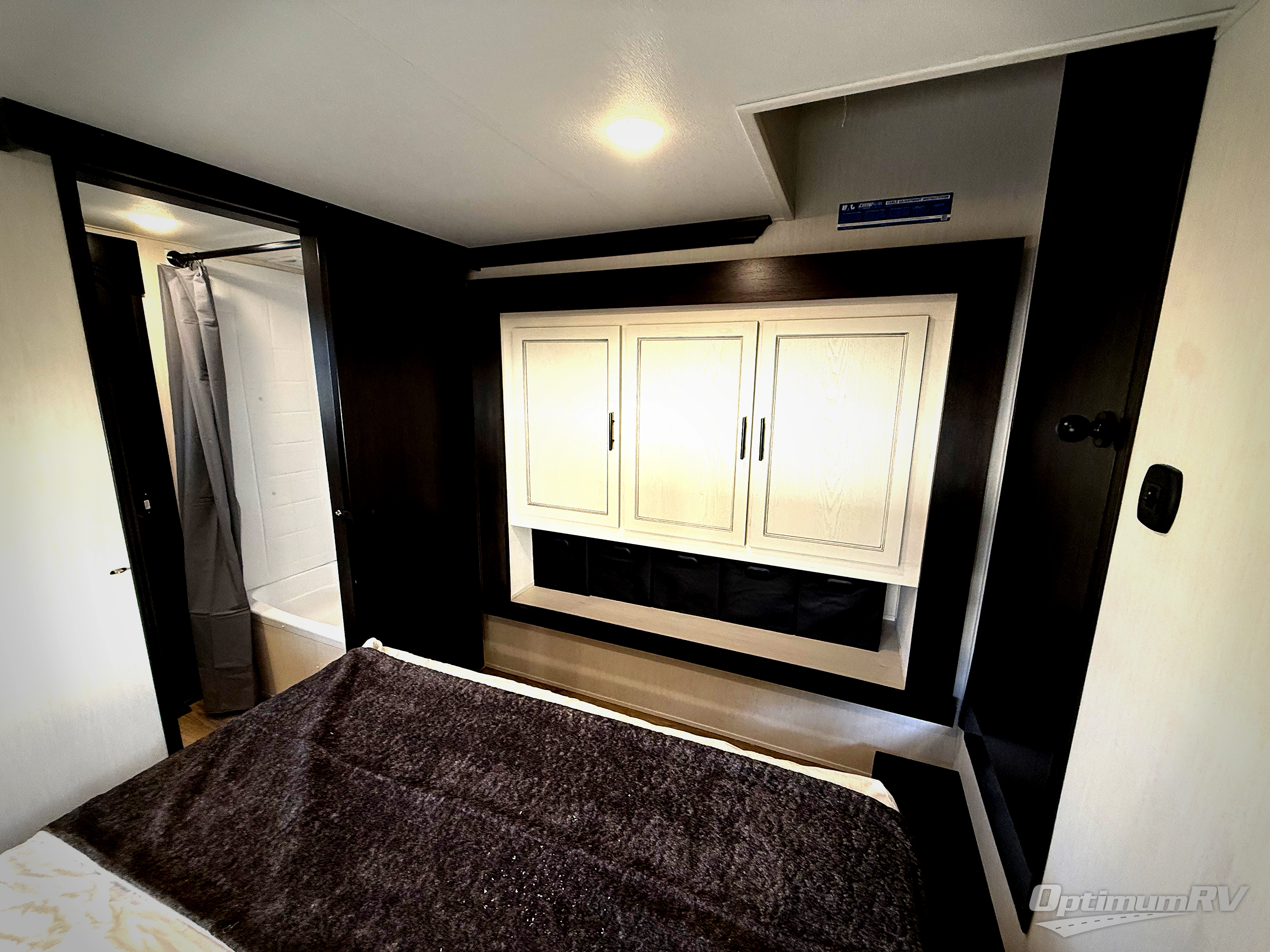 Are you looking for a fifth wheel where you can bring along your neighbor friends? You can do just that since there are two bedrooms in this unit, one of which includes a master bath with its own exterior entry door! The front bedroom is right next to the second full bath for convenience, and includes a camper king bed slide, a dresser, and front wardrobe. The rear master bedroom has a queen bed slide out across from a second slide for more floor space, and there is a loft above this room for more sleeping or storage space. Everyone can meet in the middle kitchen and living room since there are recliners, a ceiling fan, and kitchen island with four chairs. There is also storage below the island for kitchen necessities, and the hidden pantry behind the TV will be perfect for snacks, board games and more!