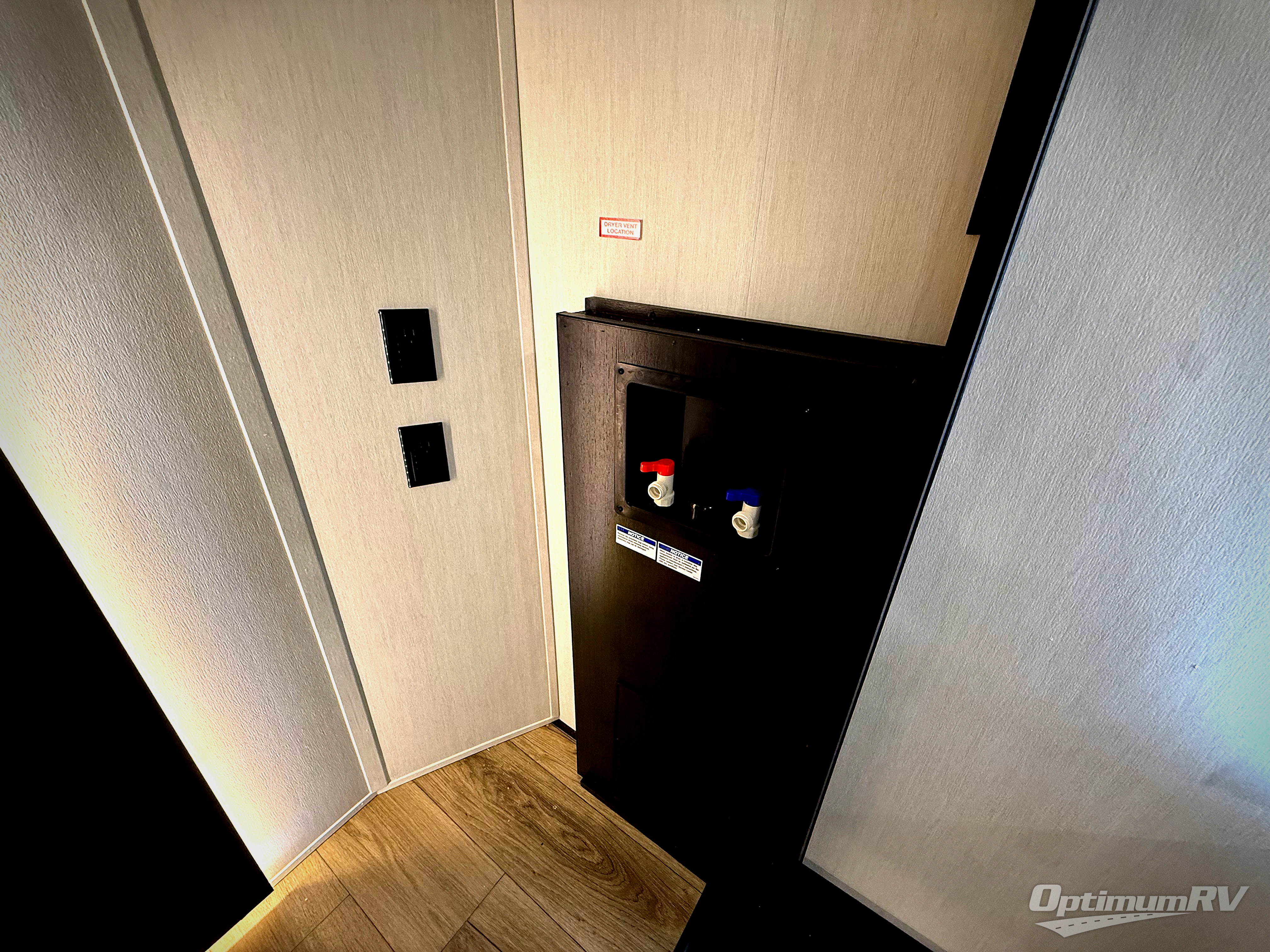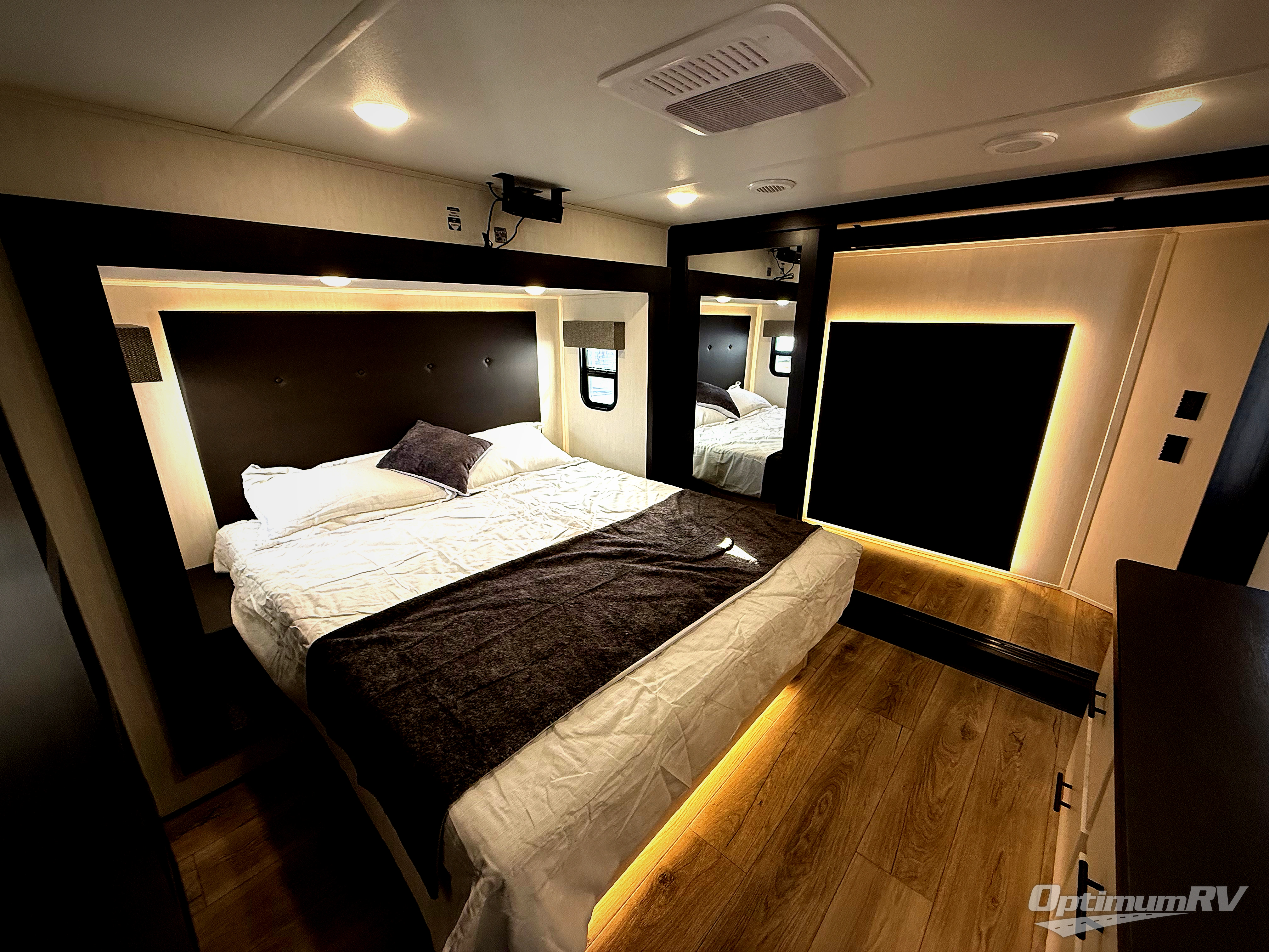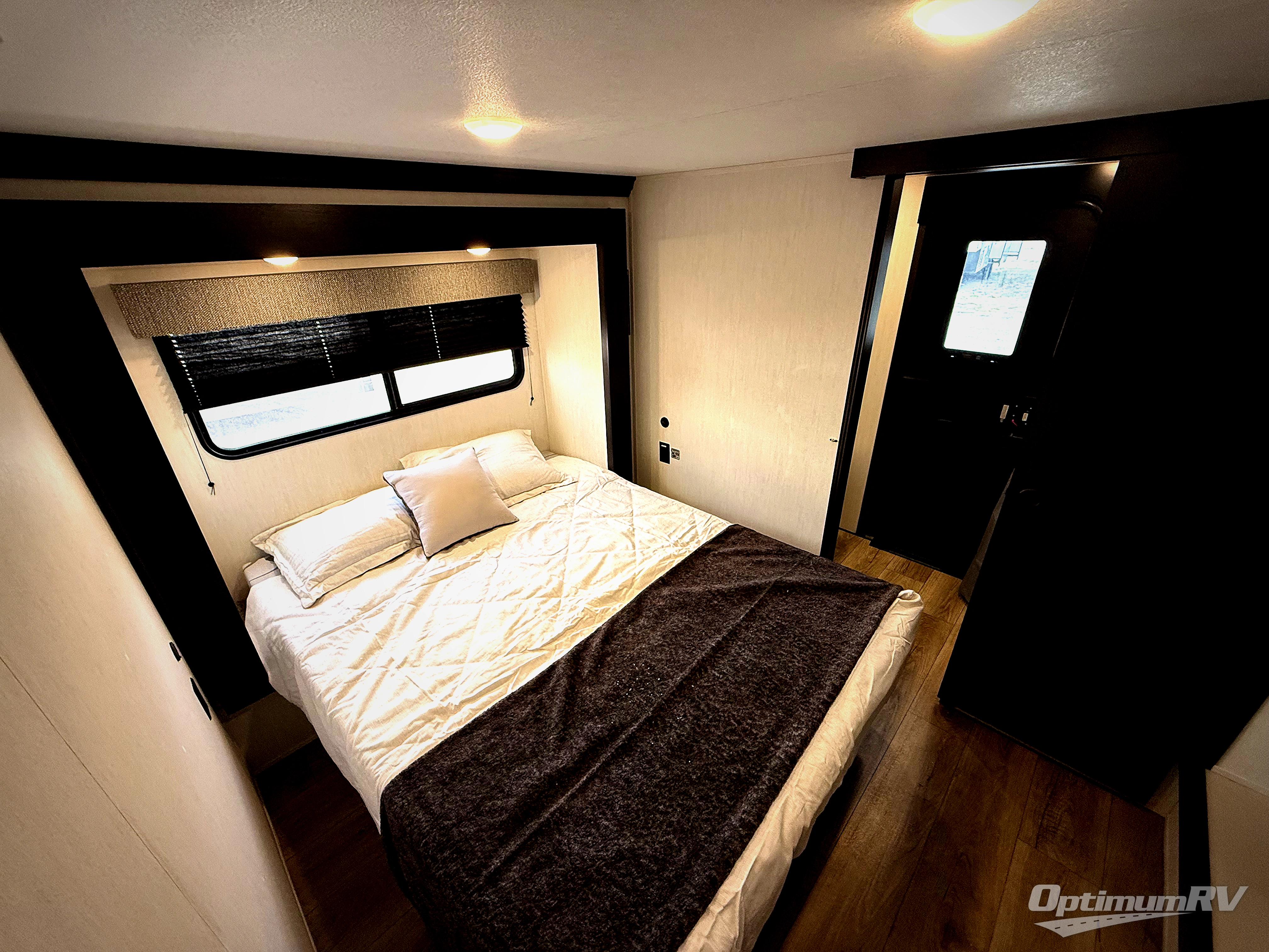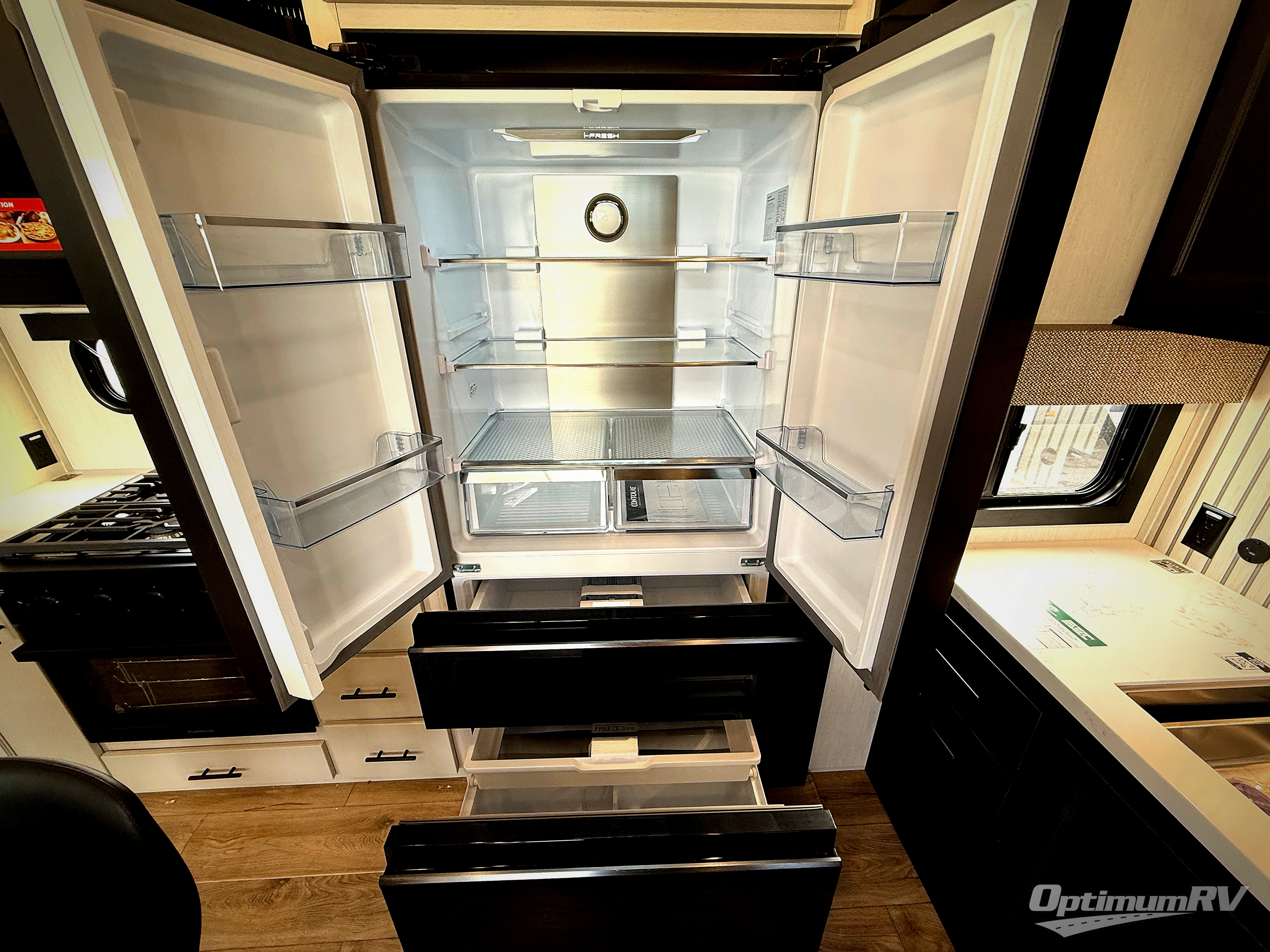 Are you looking for a fifth wheel where you can bring along your neighbor friends? You can do just that since there are two bedrooms in this unit, one of which includes a master bath with its own exterior entry door! The front bedroom is right next to the second full bath for convenience, and includes a camper king bed slide, a dresser, and front wardrobe. The rear master bedroom has a queen bed slide out across from a second slide for more floor space, and there is a loft above this room for more sleeping or storage space. Everyone can meet in the middle kitchen and living room since there are recliners, a ceiling fan, and kitchen island with four chairs. There is also storage below the island for kitchen necessities, and the hidden pantry behind the TV will be perfect for snacks, board games and more!