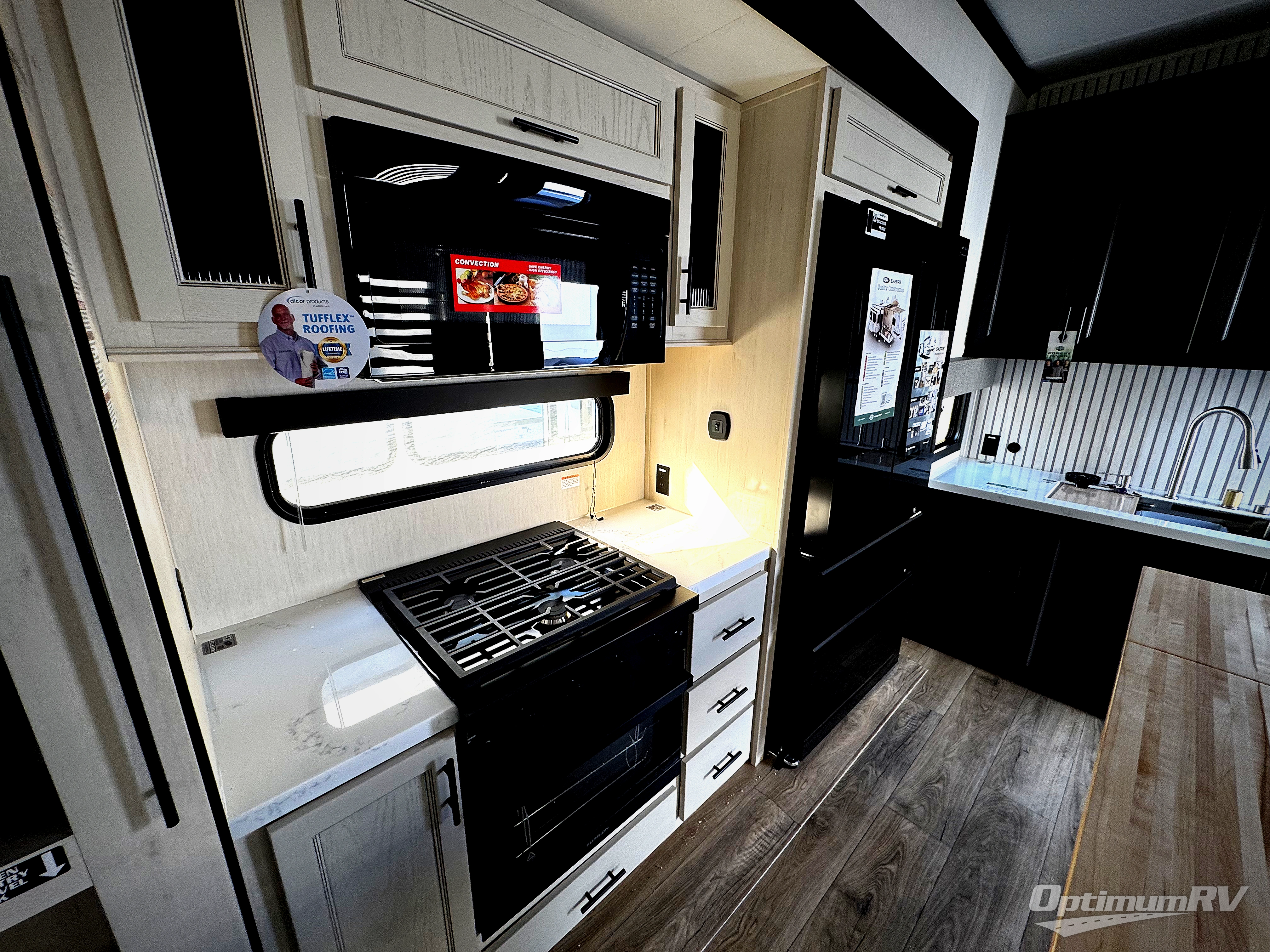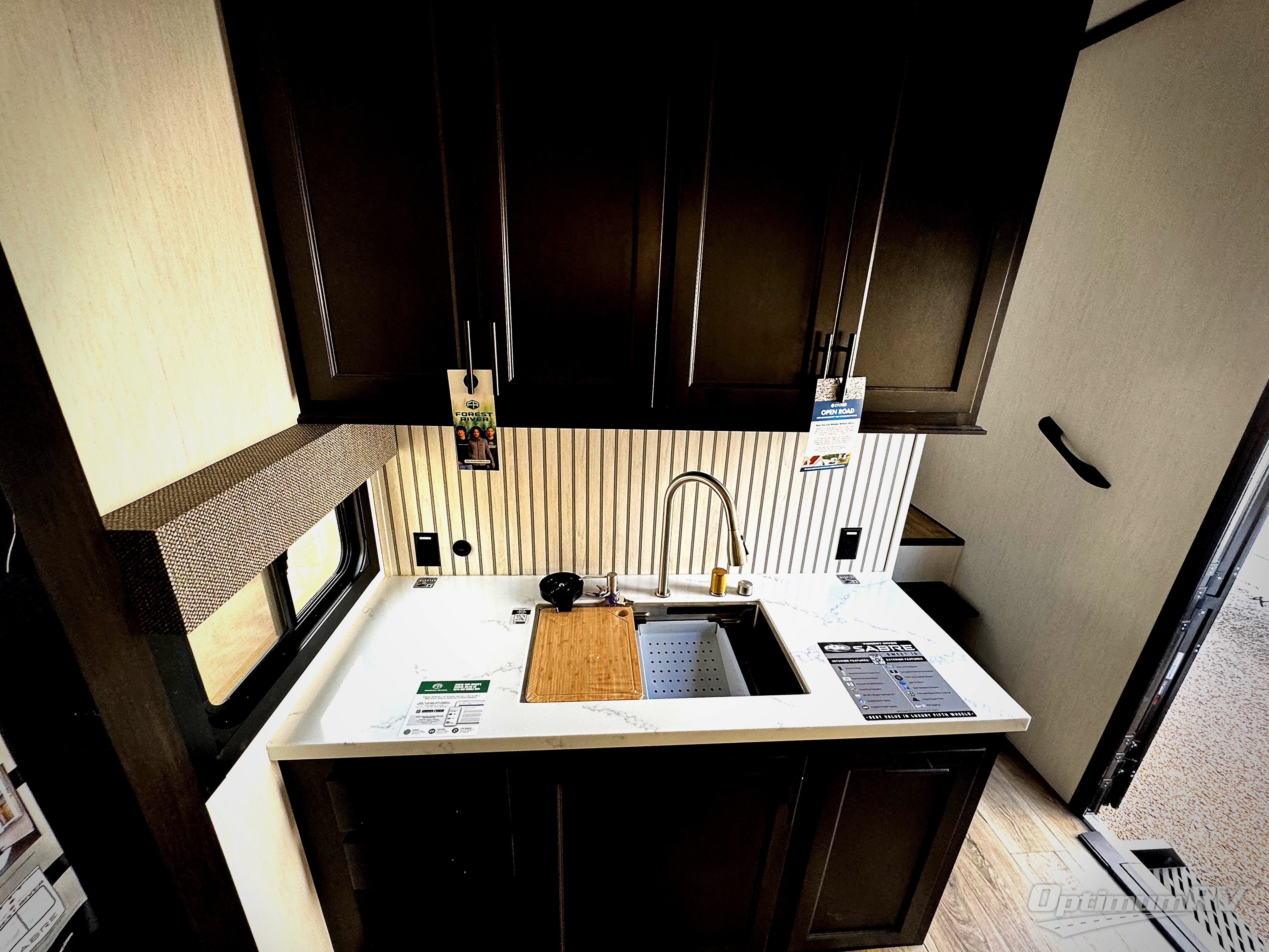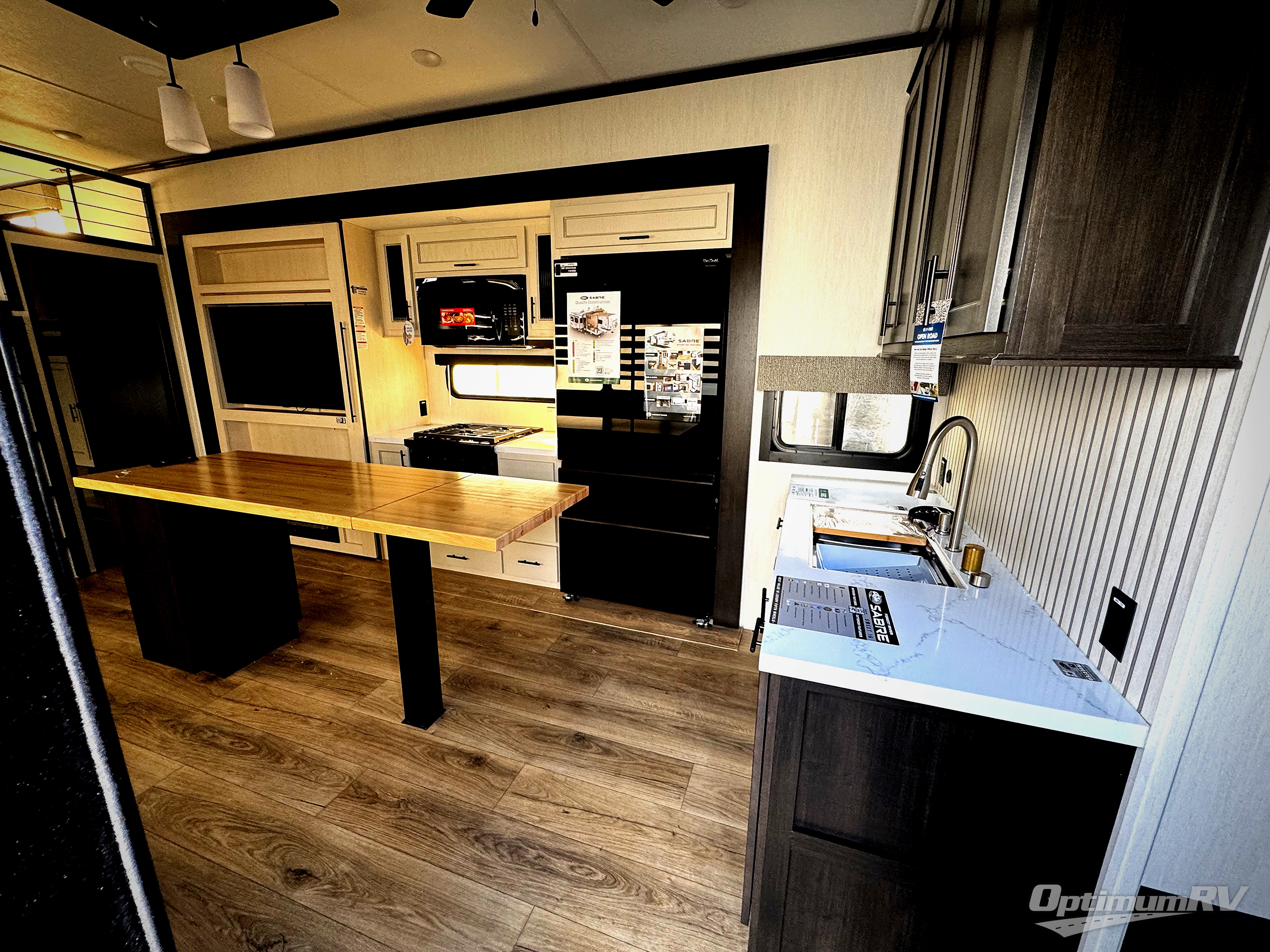 You will experience luxurious camping trips at an affordable price with any one of these Forest River Cherokee Sabre fifth wheels! These models are durable and ready to travel anytime of the year thanks to features like the high-gloss gel-coat front cap with LED lighting, the PVC roof membrane, and the forced air underbelly with enclosed gate valves. The electric auto-leveling system makes setting up easy and safe, and the adjustable power awning with LED lighting will create an inviting outdoor living space. Each model includes a universal docking station which includes a black tank flush and an outside shower, and adjustable stable steps for you to enter and exit the unit safely. Inside, you will love the design of the ambient accent lighting in the living area, the real wood lumbercore cabinetry, and the linoleum flooring!