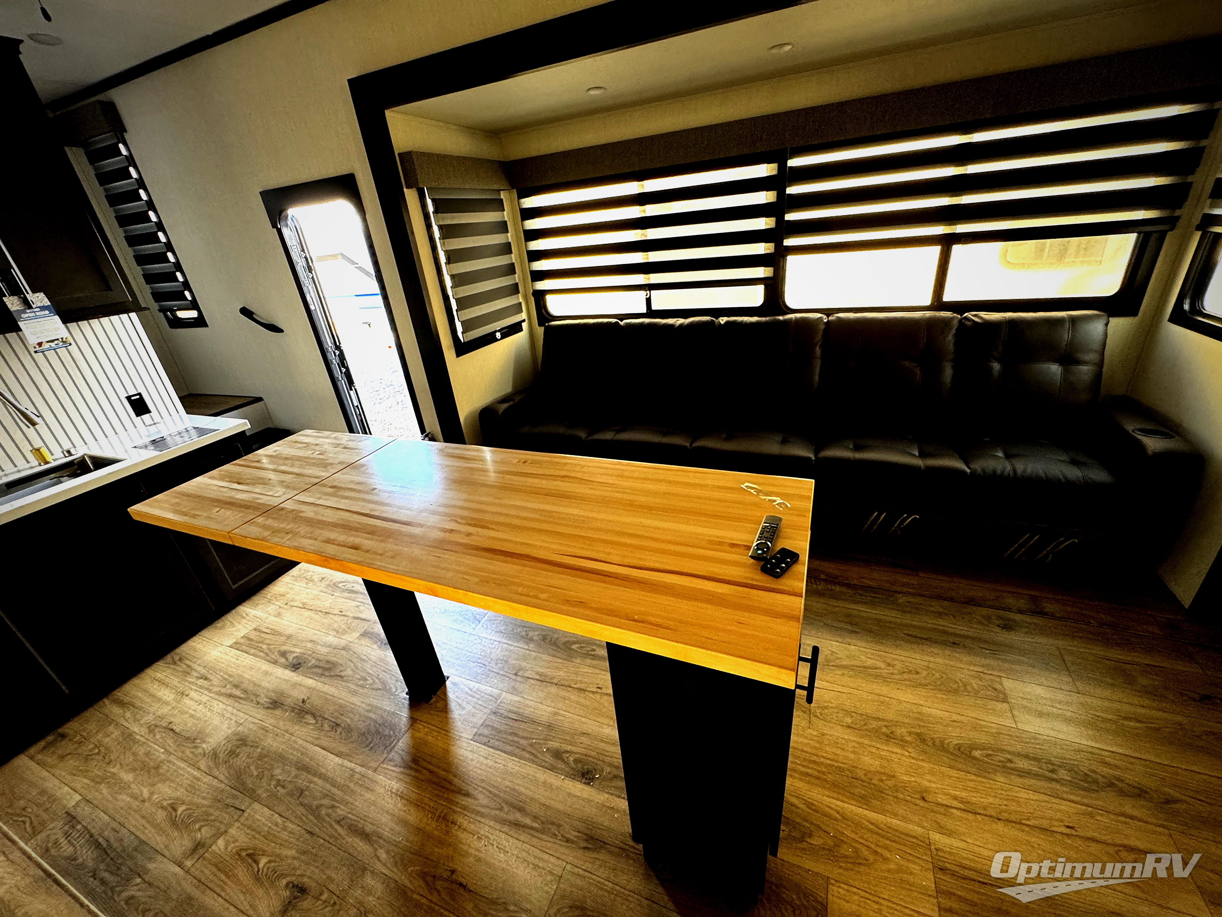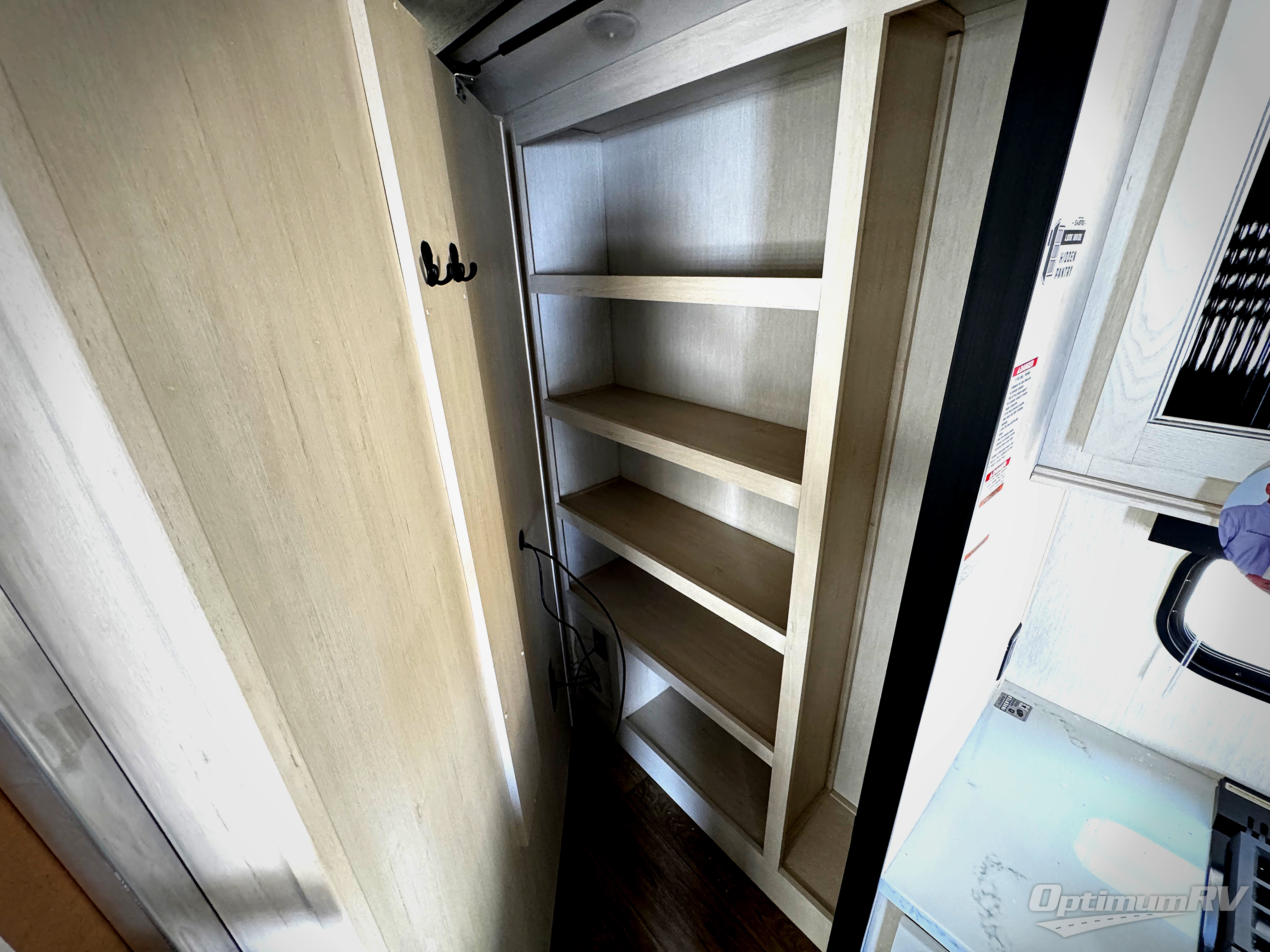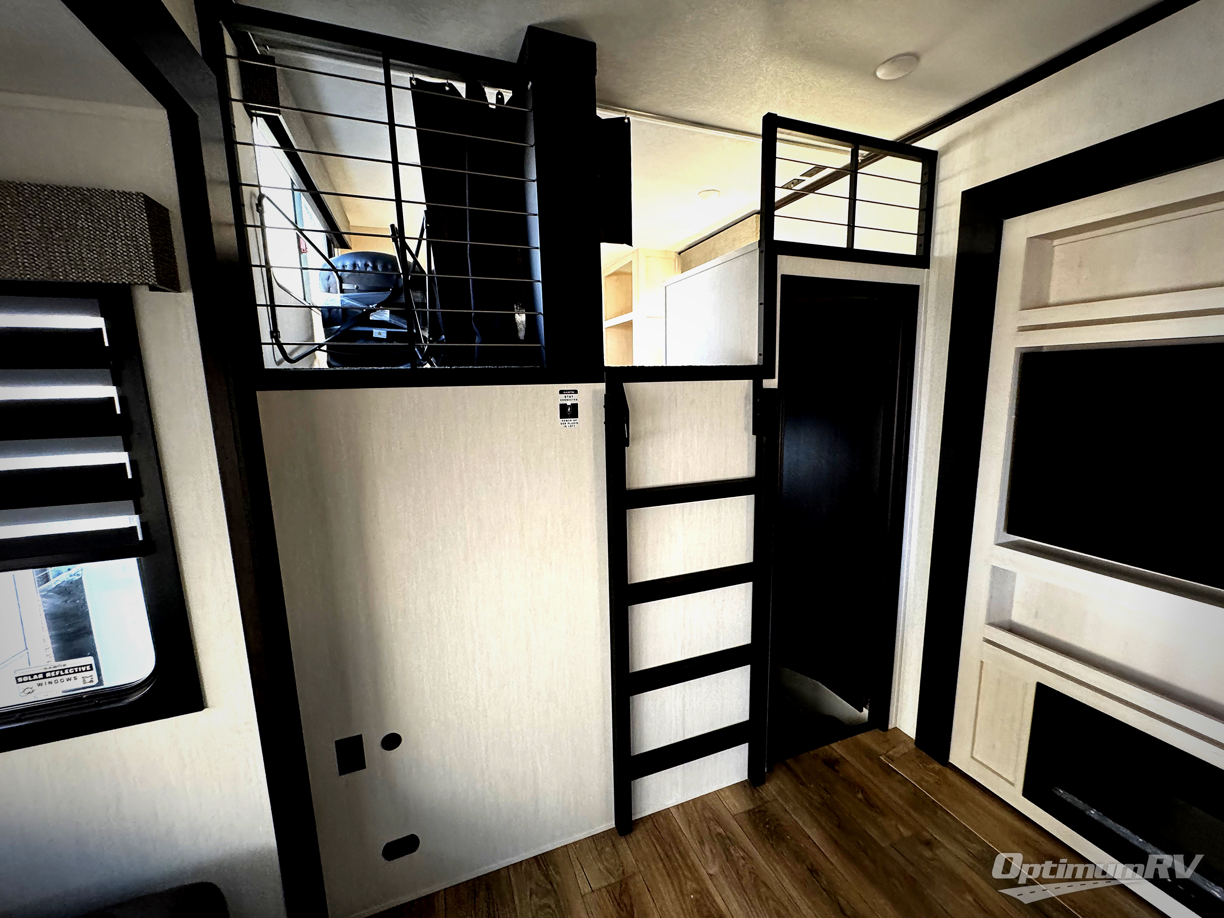 Are you looking for a fifth wheel where you can bring along your neighbor friends? You can do just that since there are two bedrooms in this unit, one of which includes a master bath with its own exterior entry door! The front bedroom is right next to the second full bath for convenience, and includes a camper king bed slide, a dresser, and front wardrobe. The rear master bedroom has a queen bed slide out across from a second slide for more floor space, and there is a loft above this room for more sleeping or storage space. Everyone can meet in the middle kitchen and living room since there are recliners, a ceiling fan, and kitchen island with four chairs. There is also storage below the island for kitchen necessities, and the hidden pantry behind the TV will be perfect for snacks, board games and more!