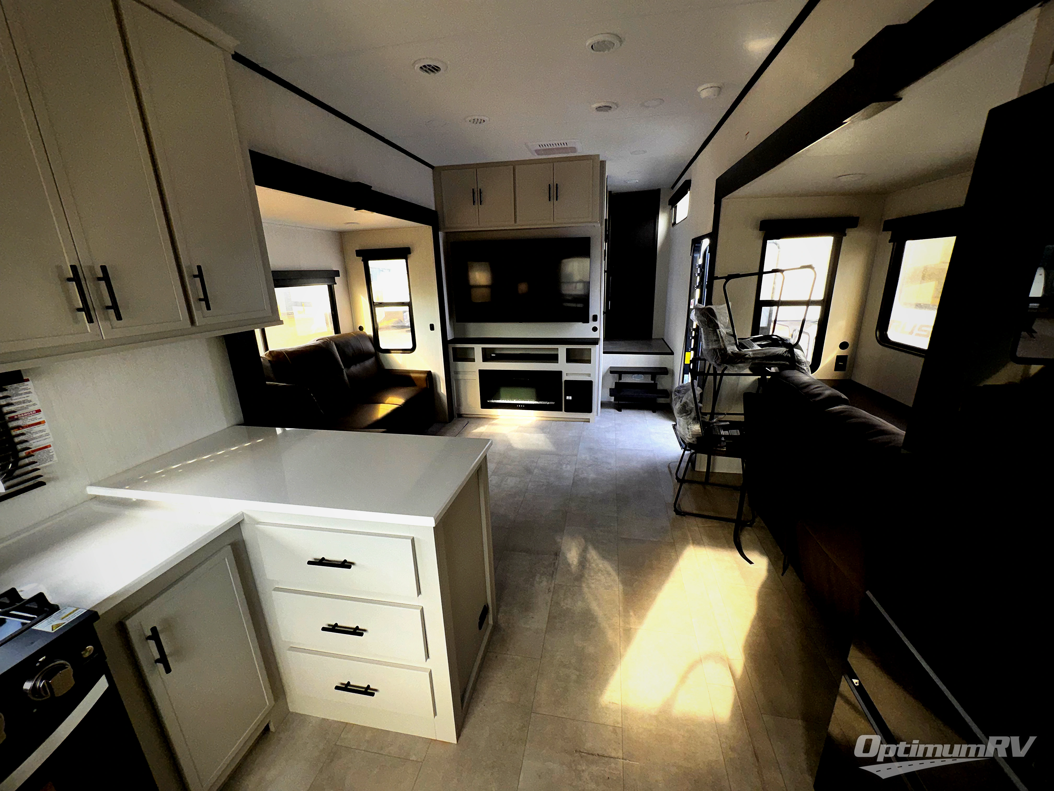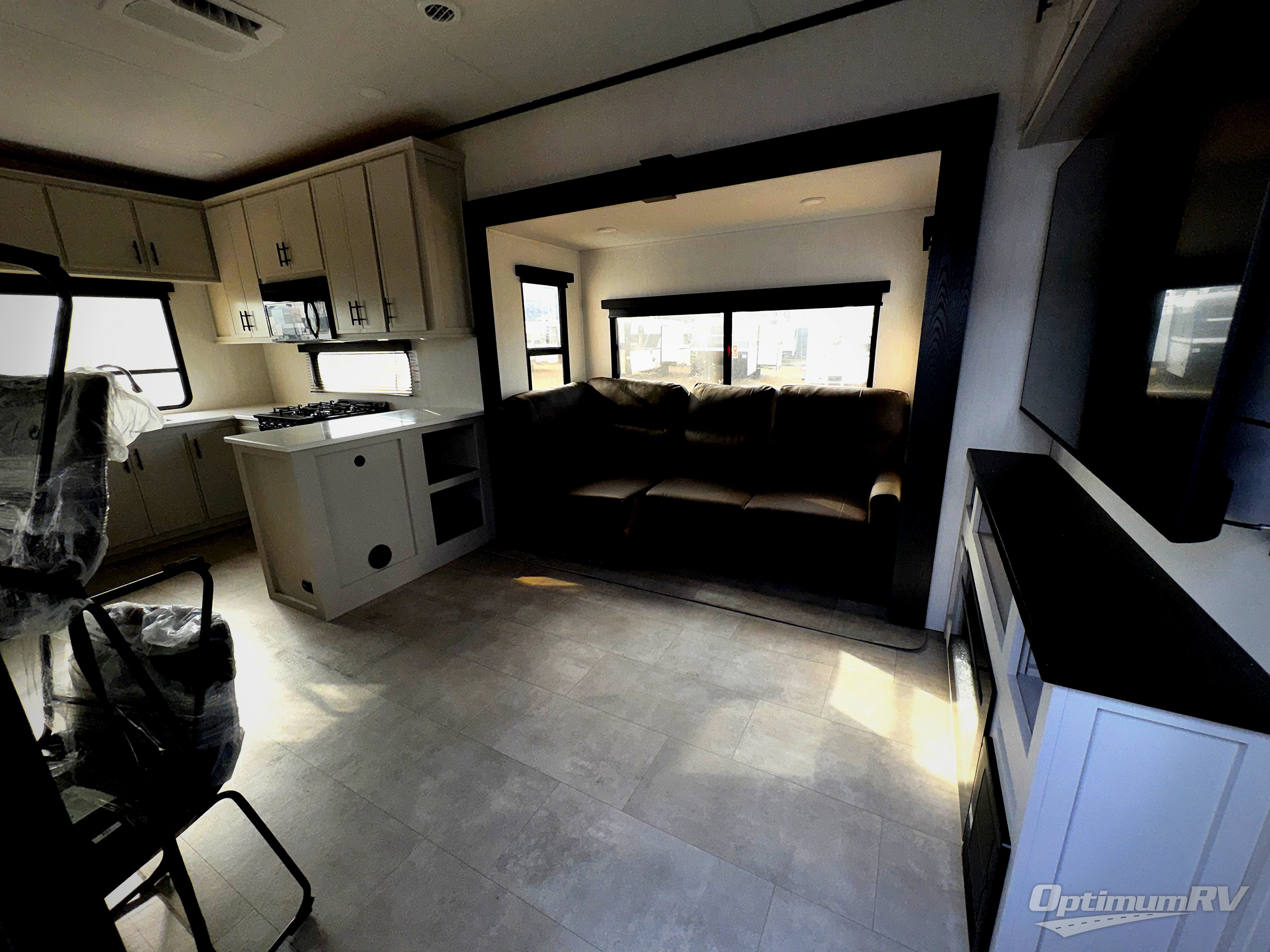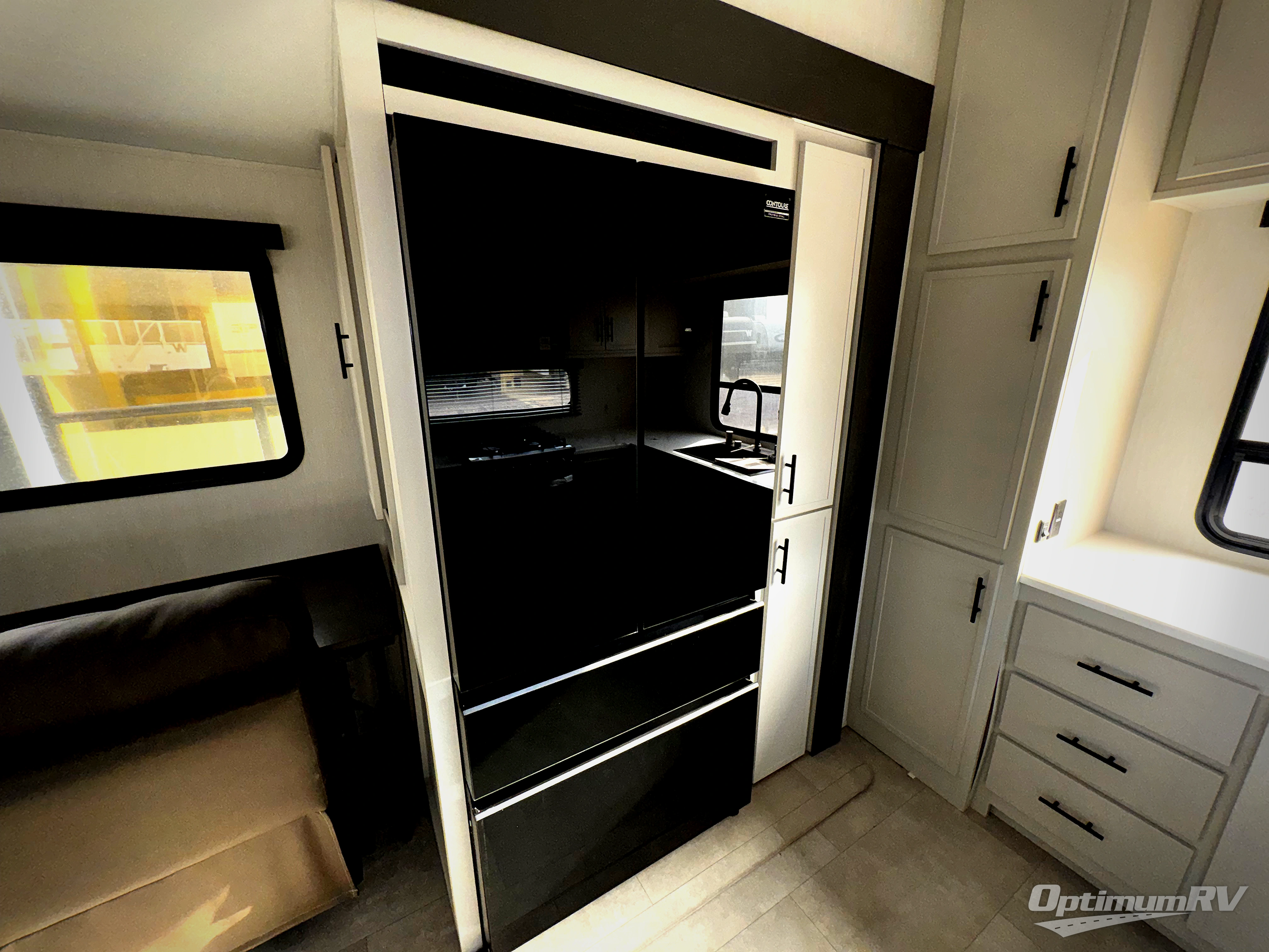 If you enjoy camping with family or friends, this fifth wheel is sure to meet all of your needs! The front bedroom includes a King bed slide out for more space and comfort, plus a front wardrobe/washer and dryer prep. And the full bath is right next door for easy nighttime use. The living room is made spacious thanks to the dual opposing slides, and you'll find a sectional sleeper sofa here, as well as a hybrid desk/dinette, perfect for a quick meal and to catch up with some emails. And don't overlook the rear kitchen with ample counter space, a four burner range, an accessory sink and a French door 12V refrigerator!