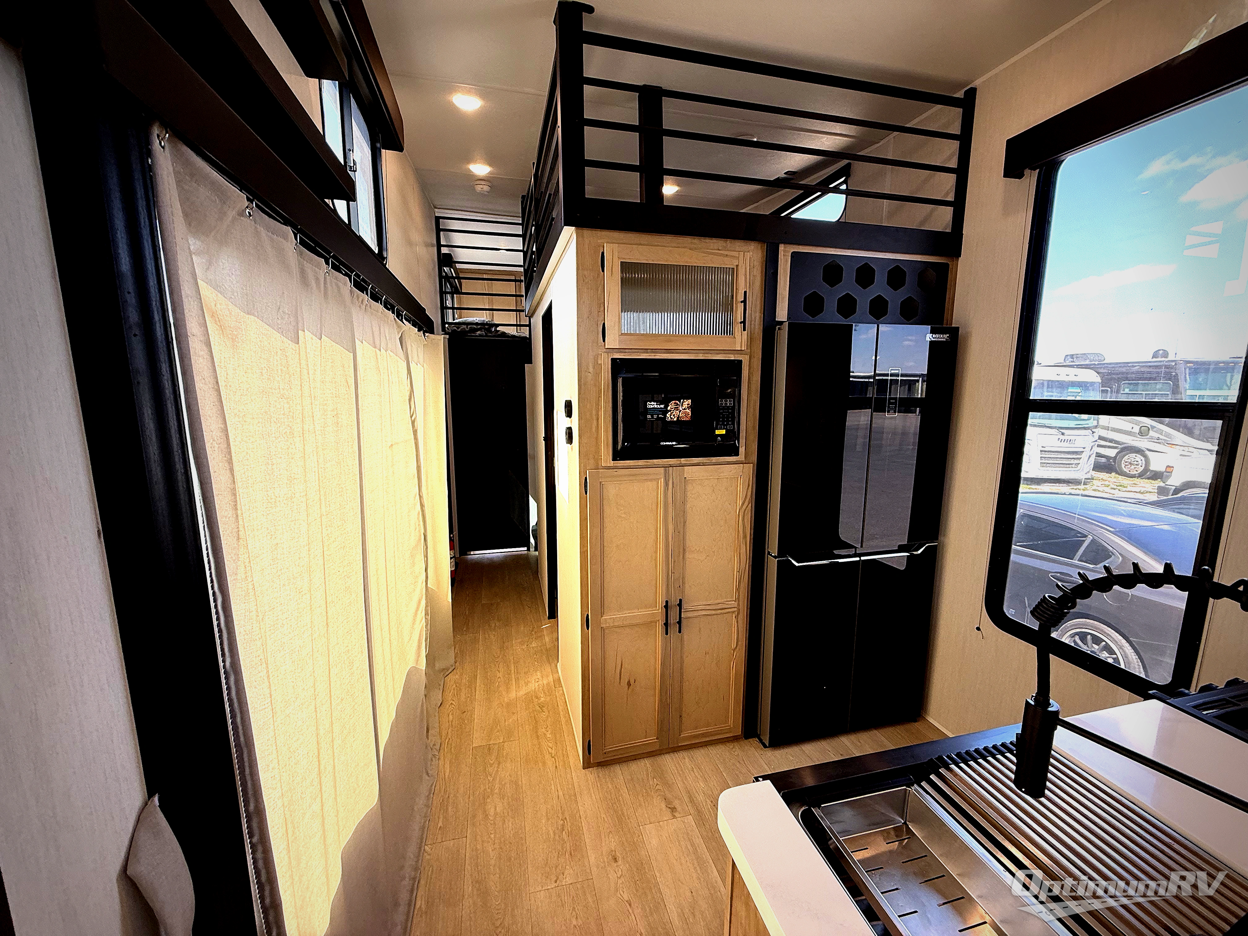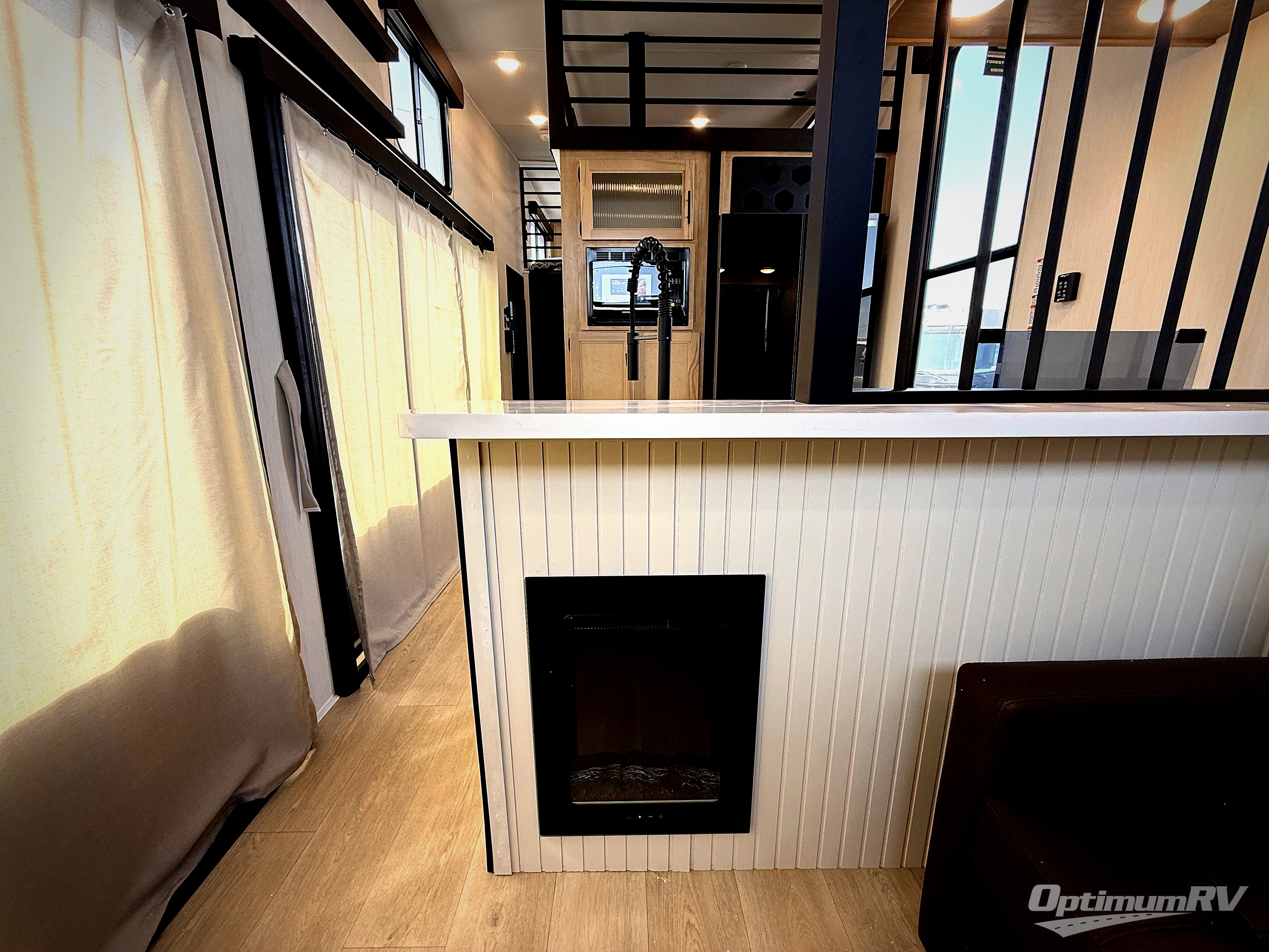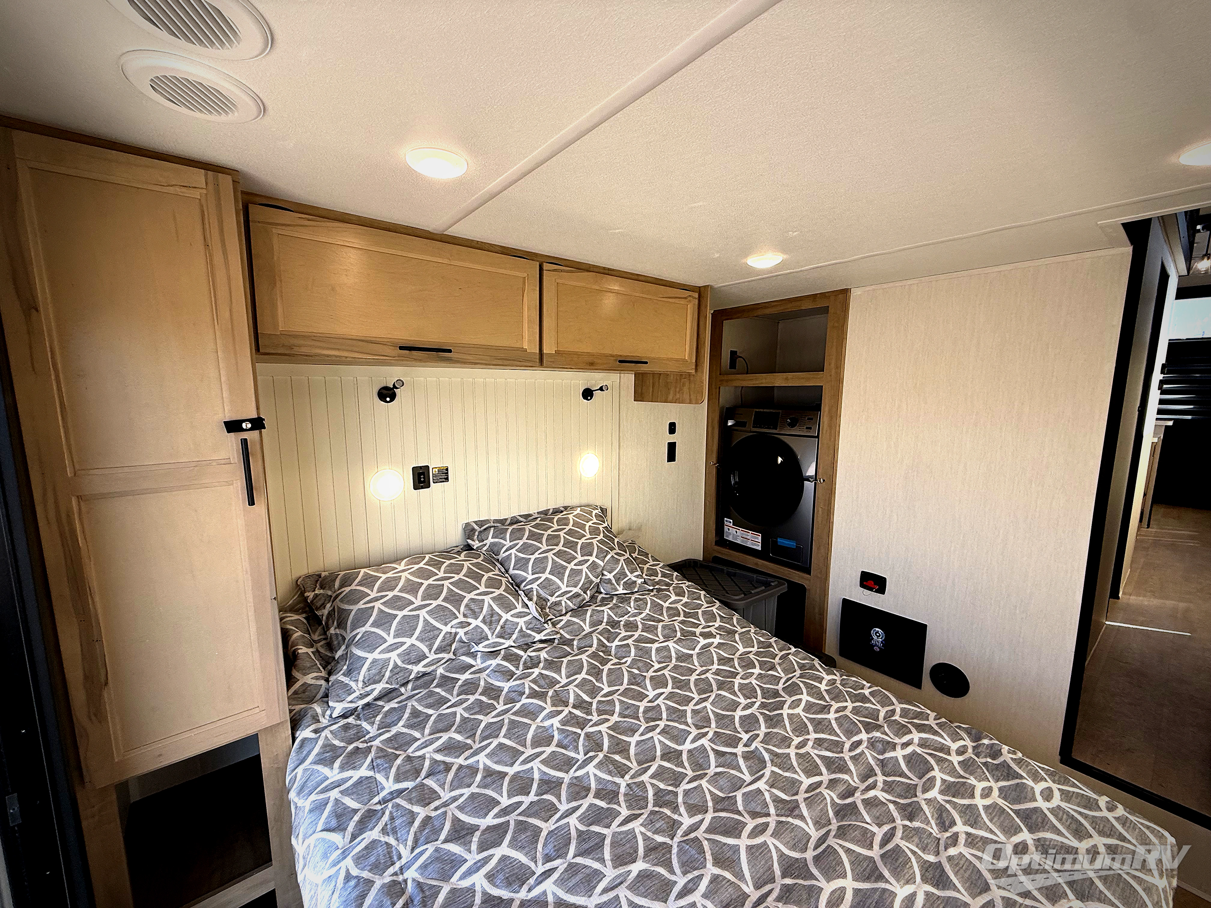 You'll feel right at home in this feature-packed destination trailer! The rear private bedroom features one of the dual entry doors, an RV king bed, and a side patio for great outdoor views! There is also a wardrobe with washer/dryer prep if you want the option to add these appliances. Above the bedroom, you'll find a loft with a queen bed, a fireplace and a storage cabinet to keep the space tidy. The chef of your group can whip up their best meals in the middle kitchen, and there is a spacious pantry to keep snacks stocked. Your crew can relax on the L-shaped sofa in the front living room, enjoy the fireplace and TV, or just take in the outdoor views provided by the huge side patio!