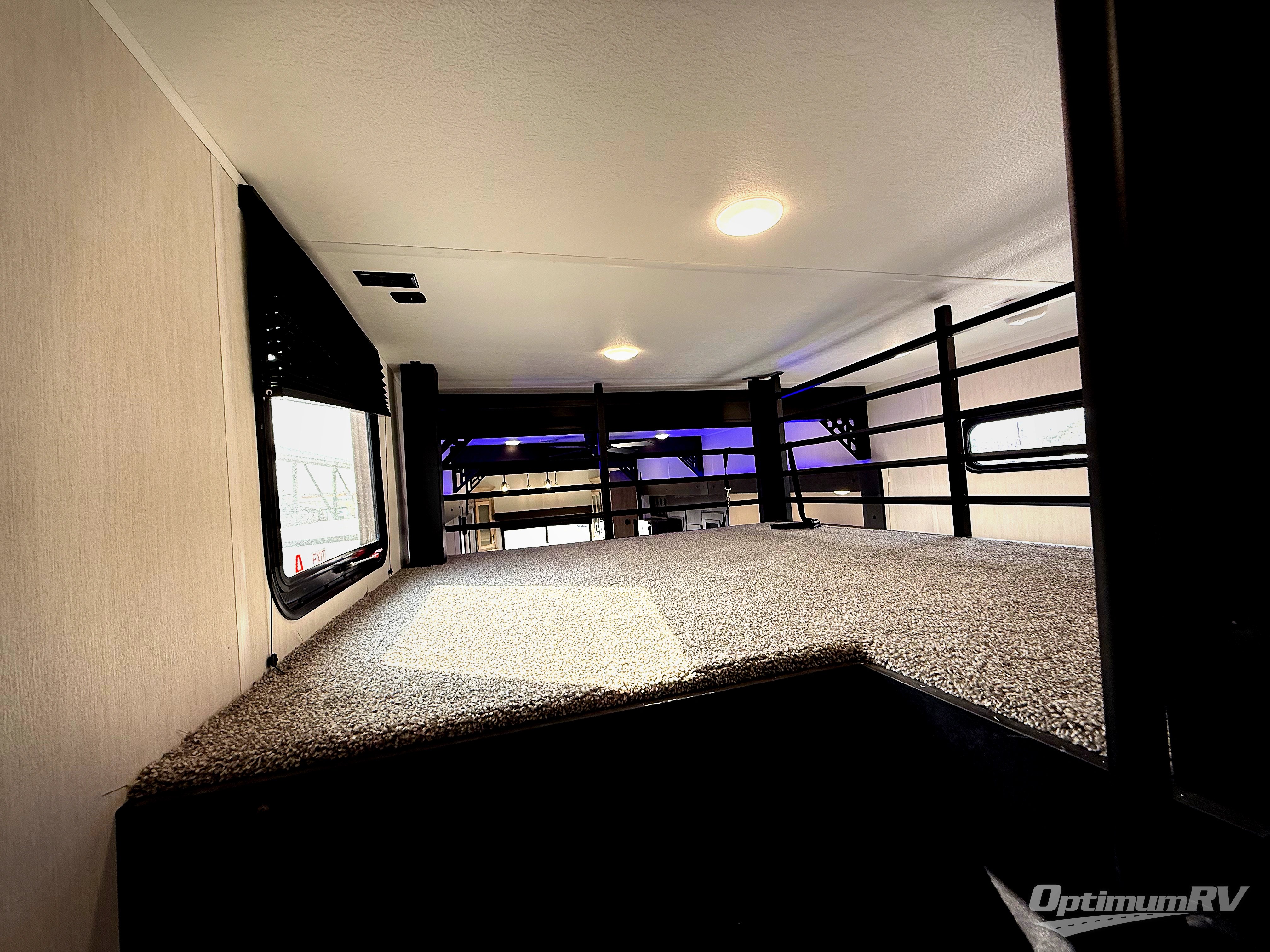 It won't be hard to find comfort in this front kitchen destination trailer! There is ample counter space to prep meals, a free-standing dinette with a slide out, plus a large pantry and 18 cu. ft. refrigerator for food storage. The bar top with stools overlooks the middle living area, where you'll also find dual hide-a-bed sofas and an entertainment center with a fireplace. The full bath includes a shower with a seat for more comfort, and one of the dual entry doors is right across from the bath so you can quickly get back outside. Head up the steps to the dual loft areas with two bunk mats and cabinets on one side, and an open area on the other, perfect for a play room or extra storage! And under the loft you'll find the rear private bedroom with a king bed slide, a wardrobe and an entertainment center, plus washer and dryer prep if you want to add these appliances!