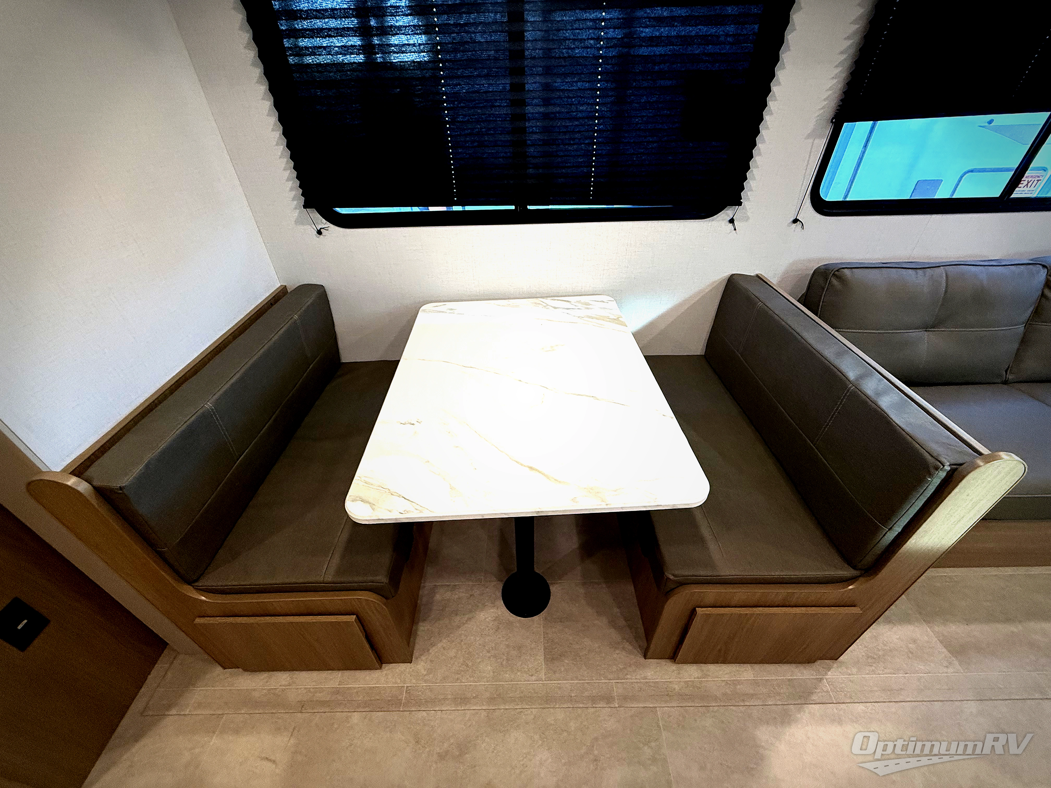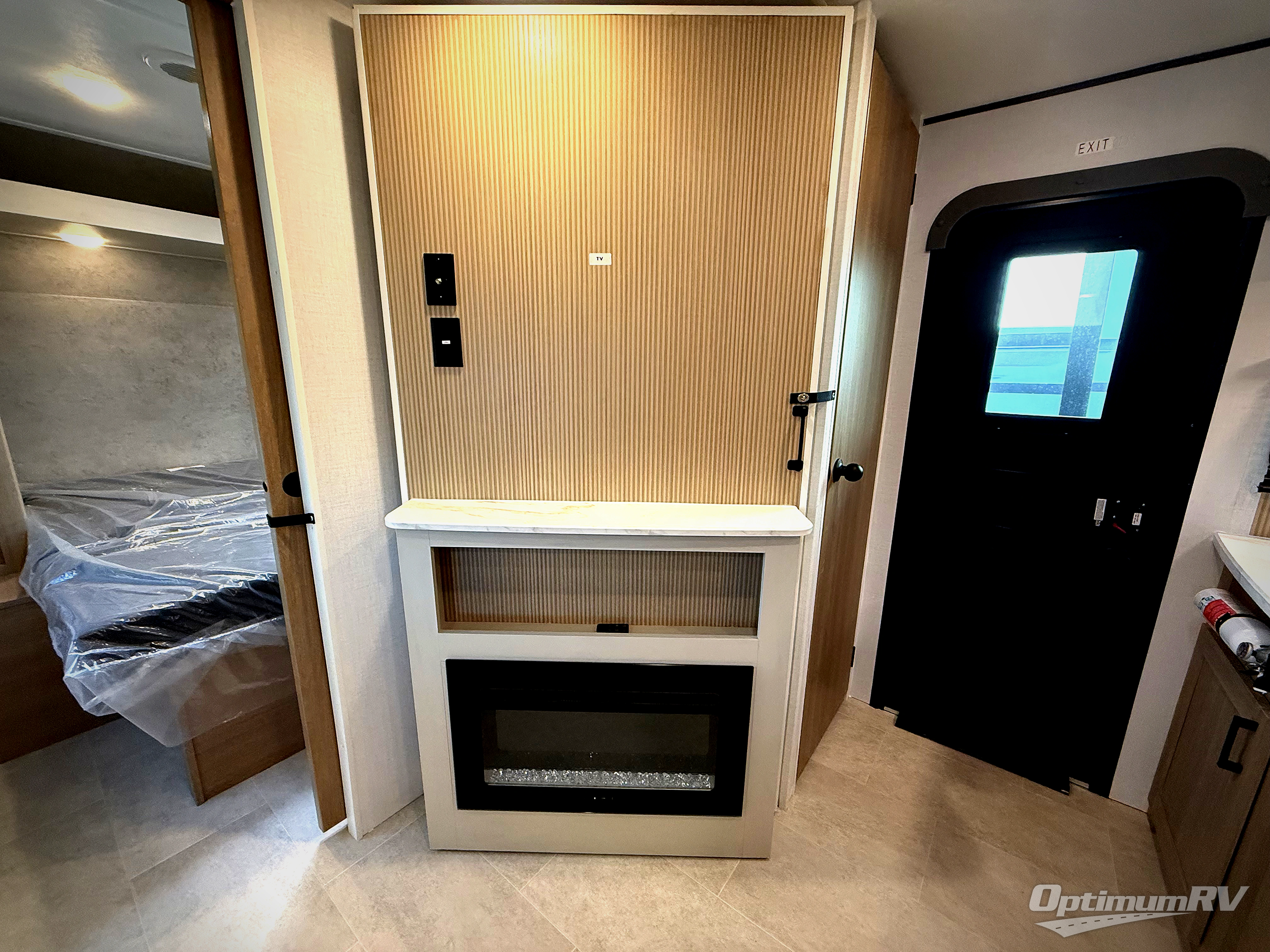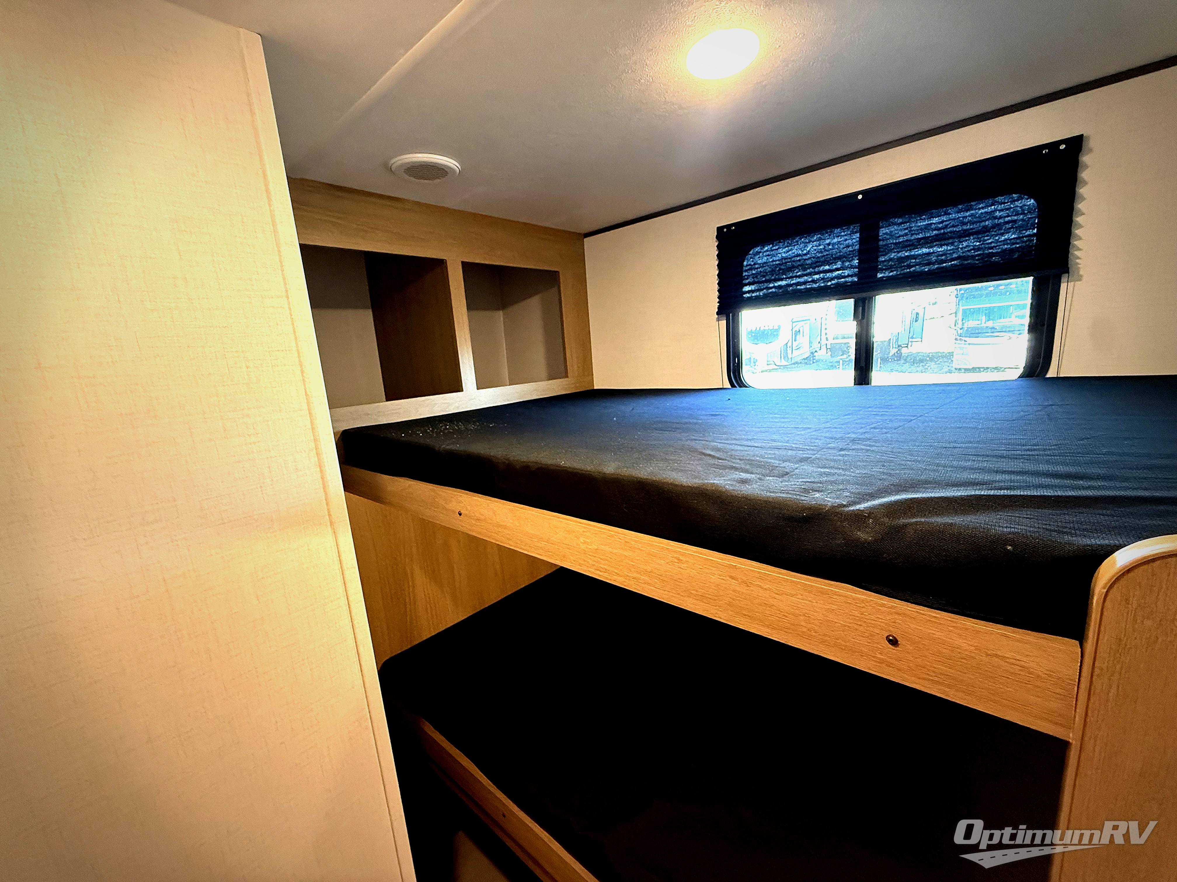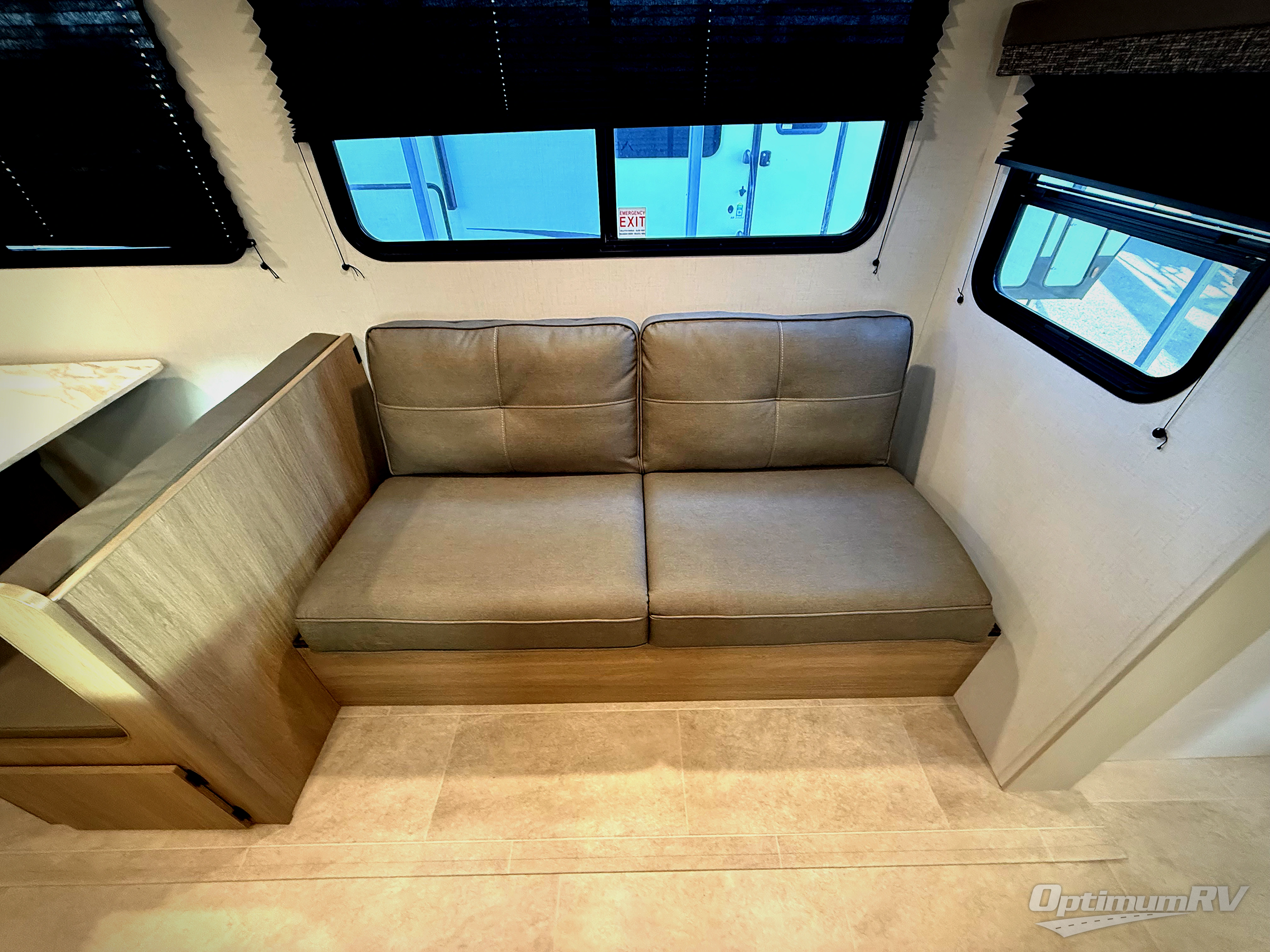 This travel trailer is one your whole crew will love! There is a rear private bunkhouse with double-size bunks for the little ones, a front private bedroom for you, and a booth dinette and jackknife sofa for even more sleeping space! The chef has their choice to cook indoors on the three burner range and microwave oven, or head outdoors to cook on the outdoor kitchen! The full bath will let everyone clean up each day, and the fireplace and large slide out will make your space feel more like home. And don't overlook the pass-through storage and 16' power awning with LED lights!