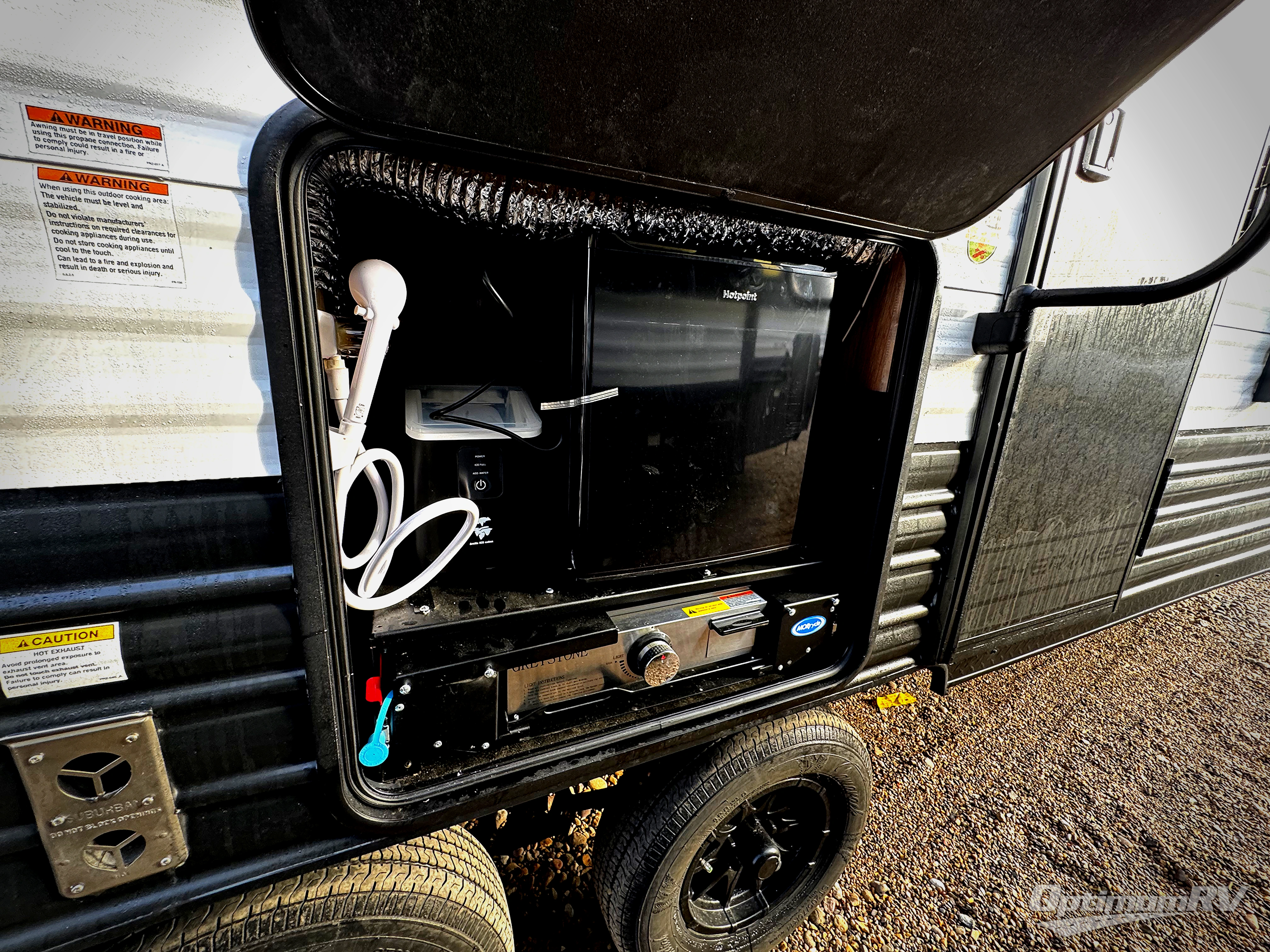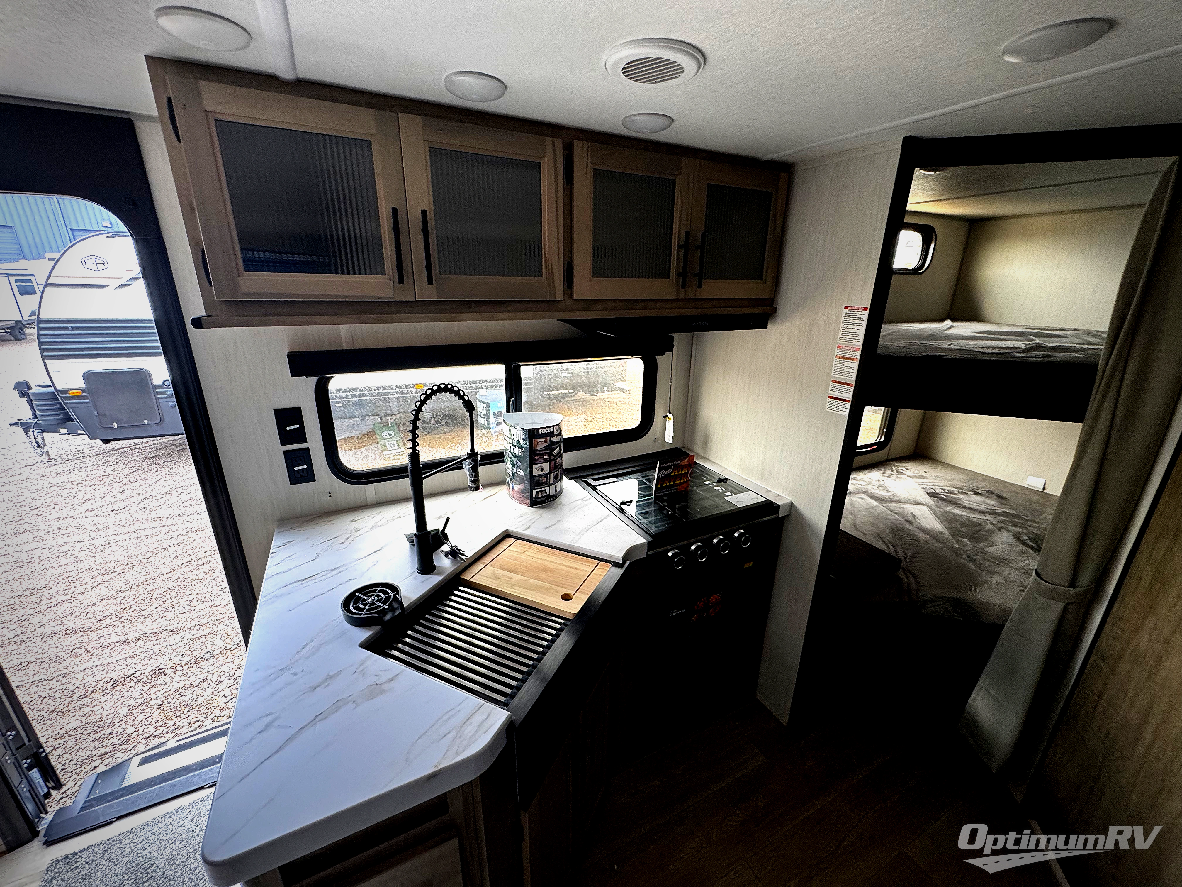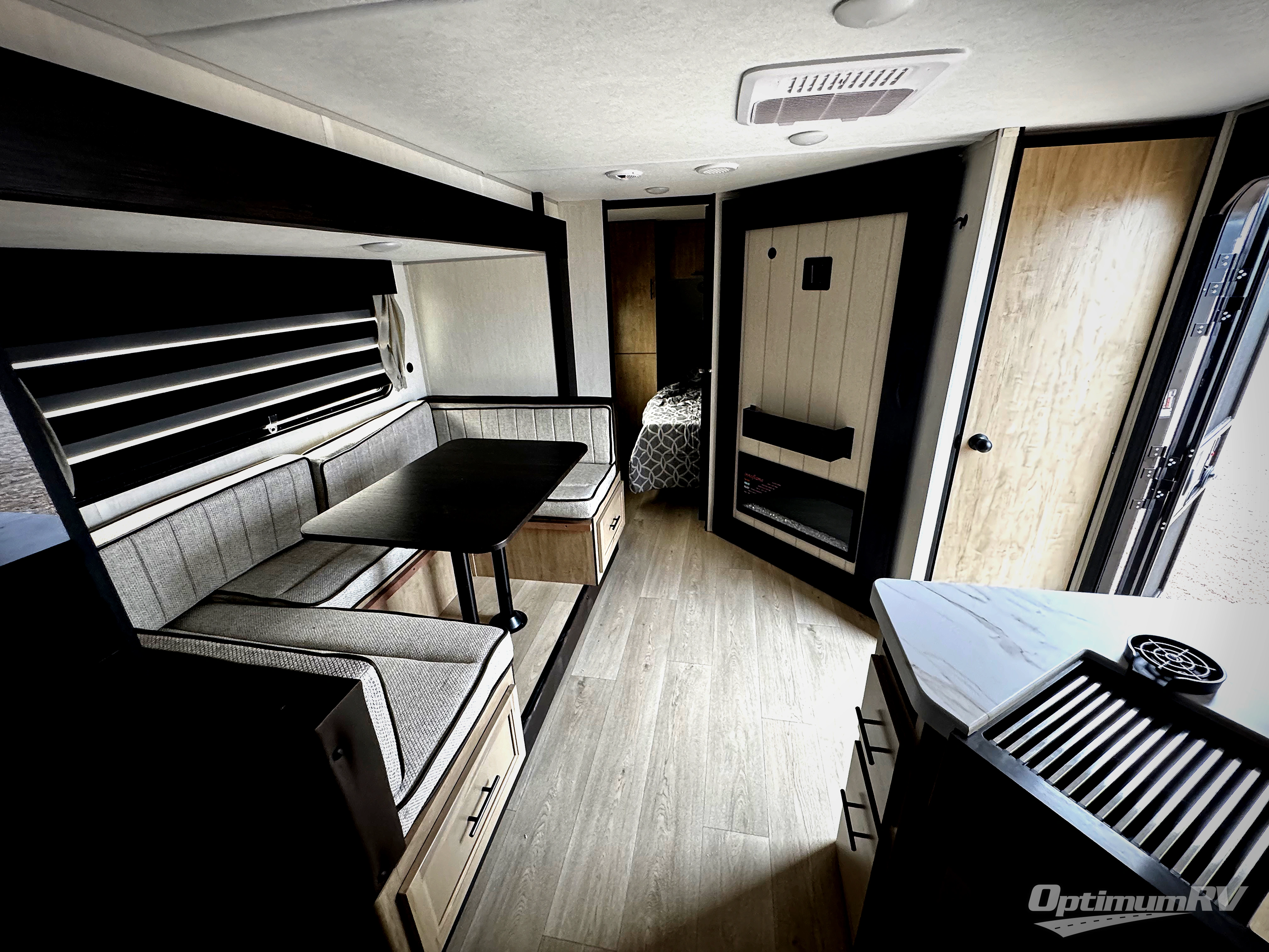 Enjoy time at the campground in this spacious travel trailer with a front private bedroom and double-size bunks for guests! The full interior kitchen and outside kitchen will let you make meals each day, and everyone can dine around the U-shaped dinette or under the 15' awning outside! This unit also includes ample storage space, including hidden shelves behind the fireplace and outside storage!