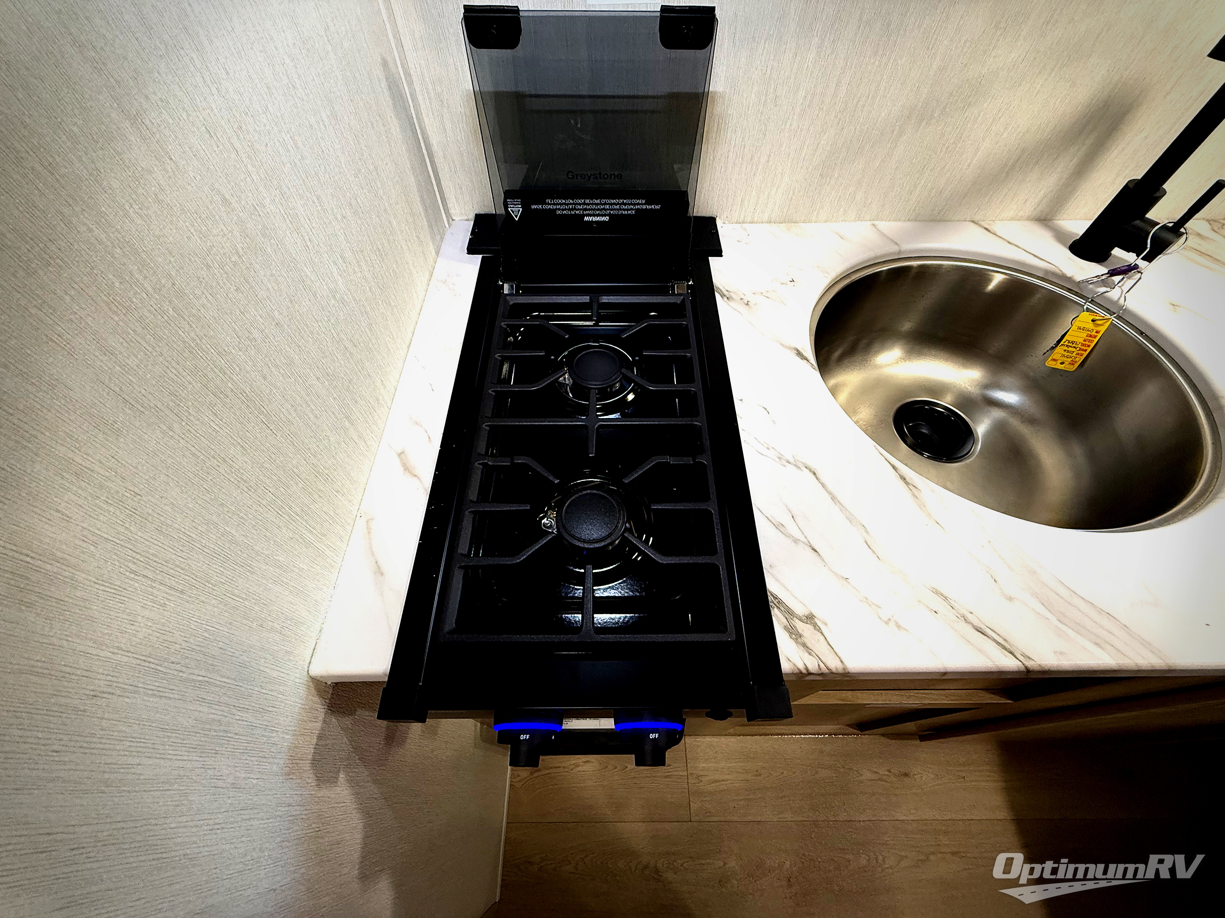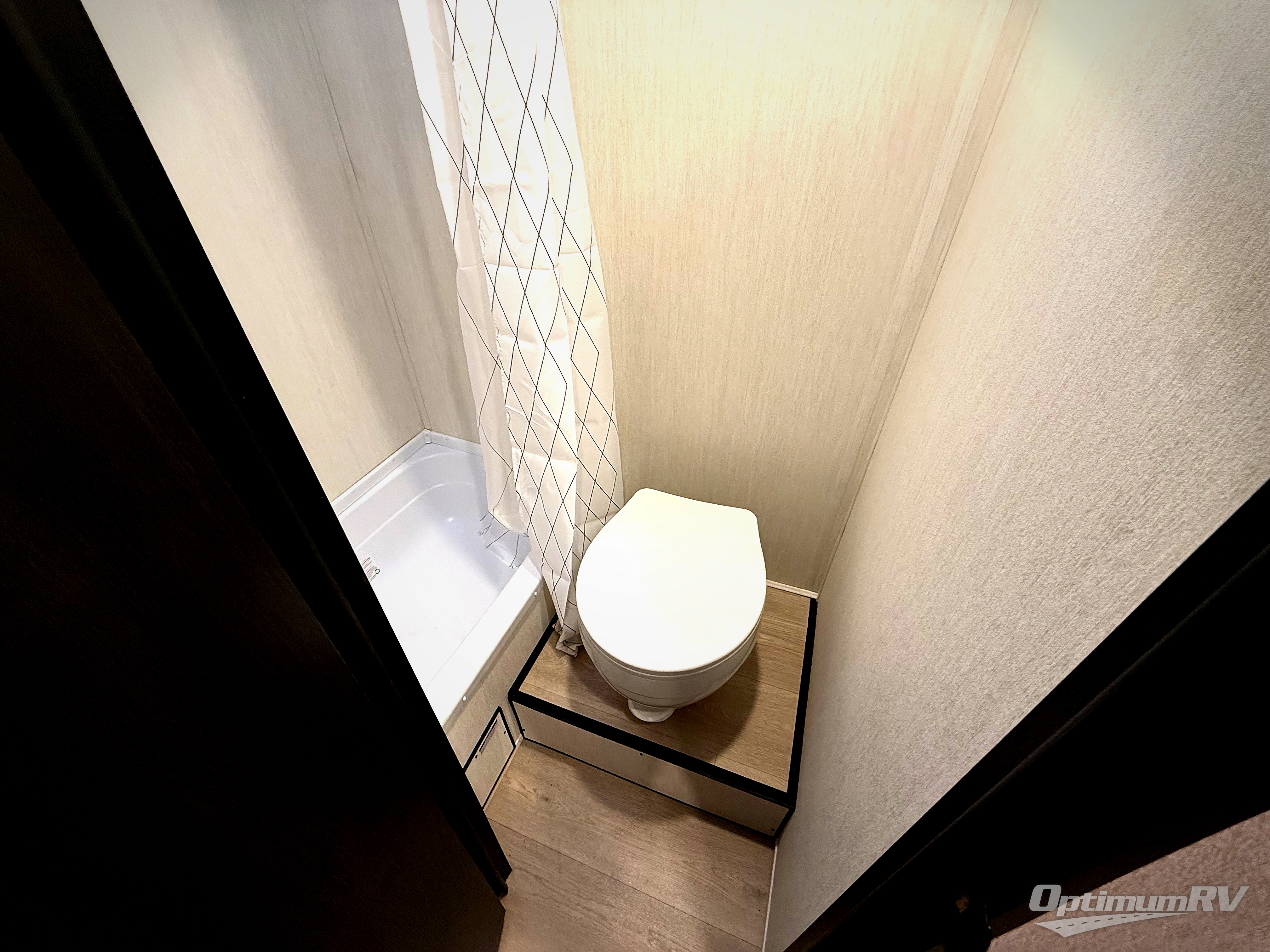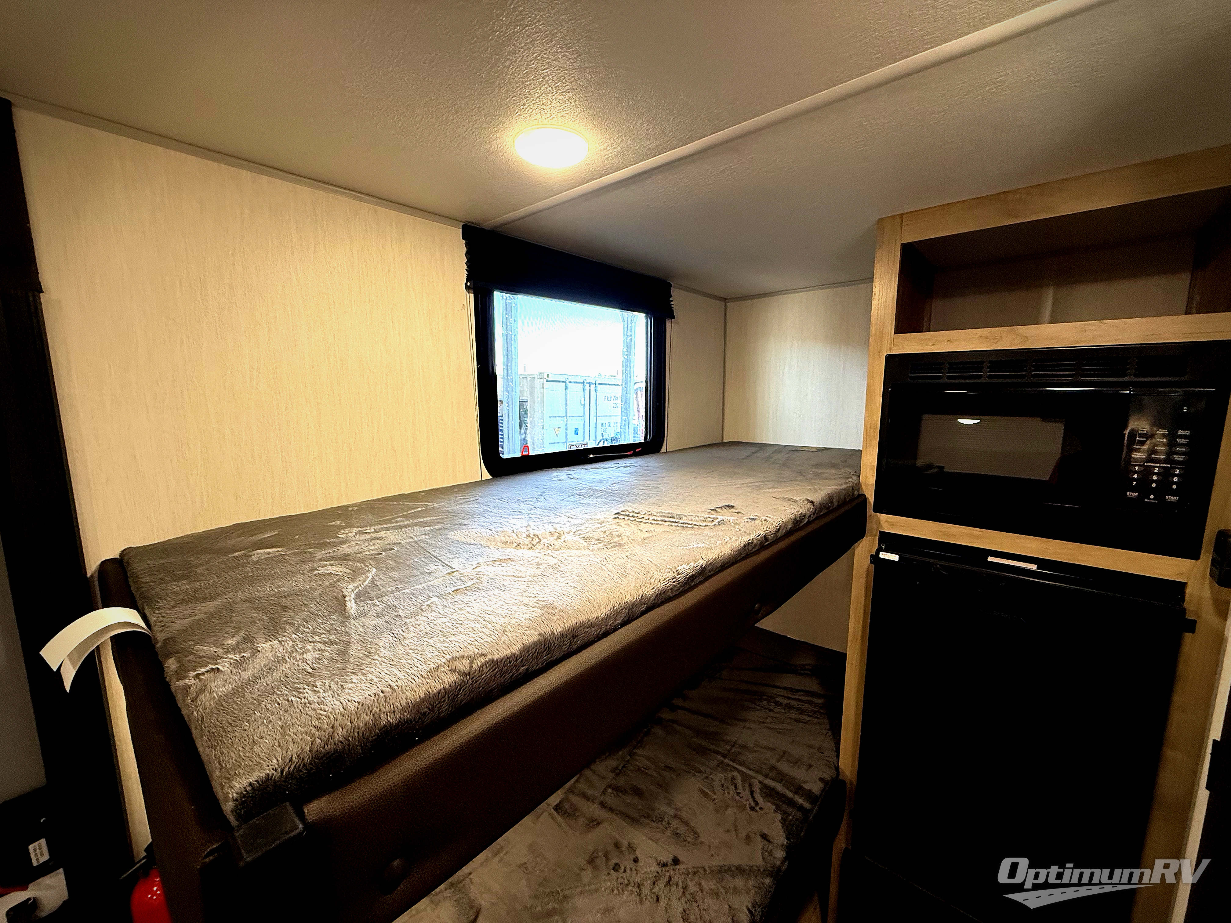 This travel trailer is perfect for epic road trips, memorable camping excursions, or rejuvenating getaways. The private bathroom is equipped with everything you need for a comfortable stay, providing a convenient spot to freshen up after a long day of exploring. The kitchen is equipped with a refrigerator for keeping drinks and ingredients fresh, and a microwave for quick reheating. The bunk beds are a great spot to take a nap or a kid's sleeping space. Overhead cabinets provide additional storage for cookware, dishes, and other essentials. In addition, the queen-sized bed provides a comfortable sleeping space, perfect for relaxing after a long day.