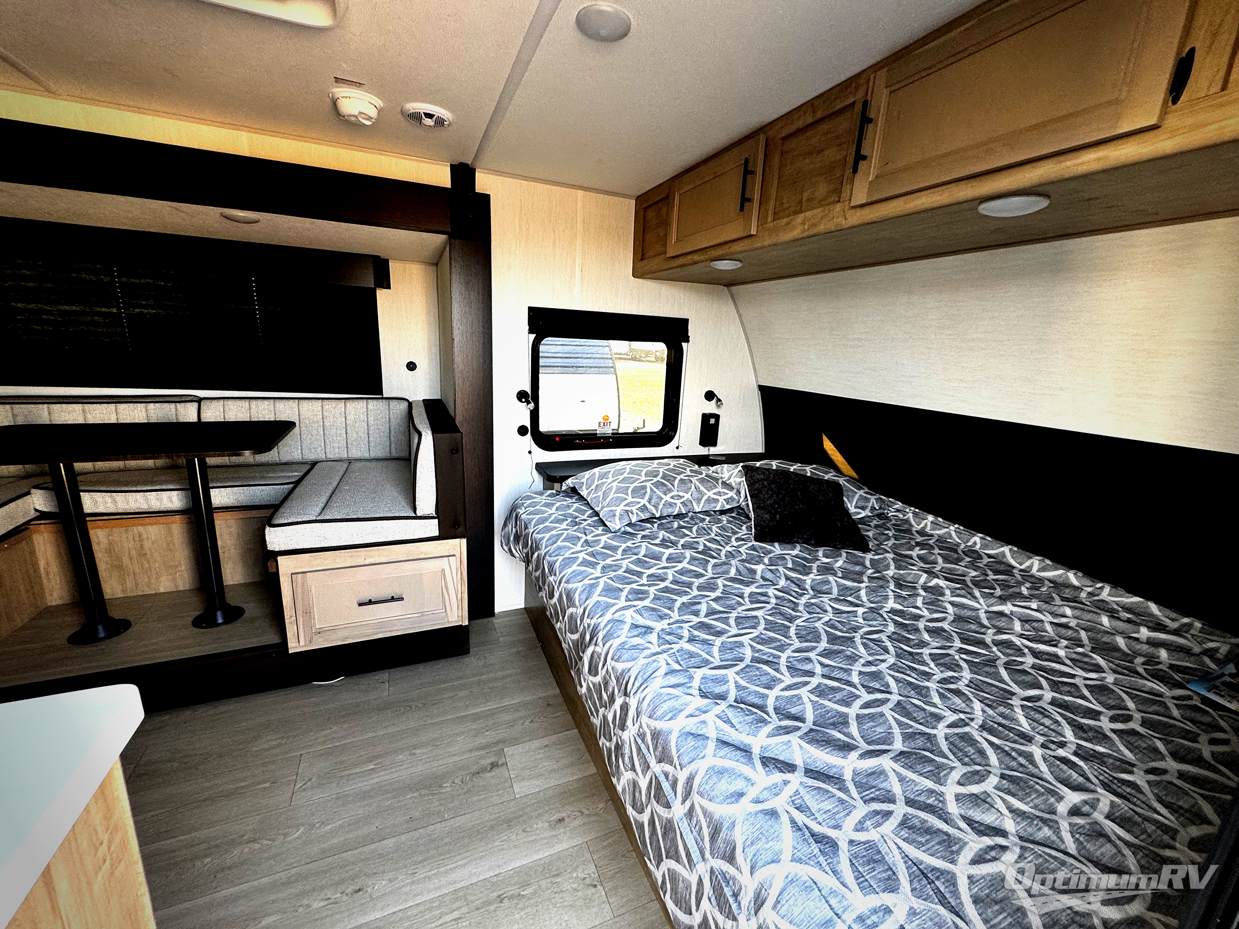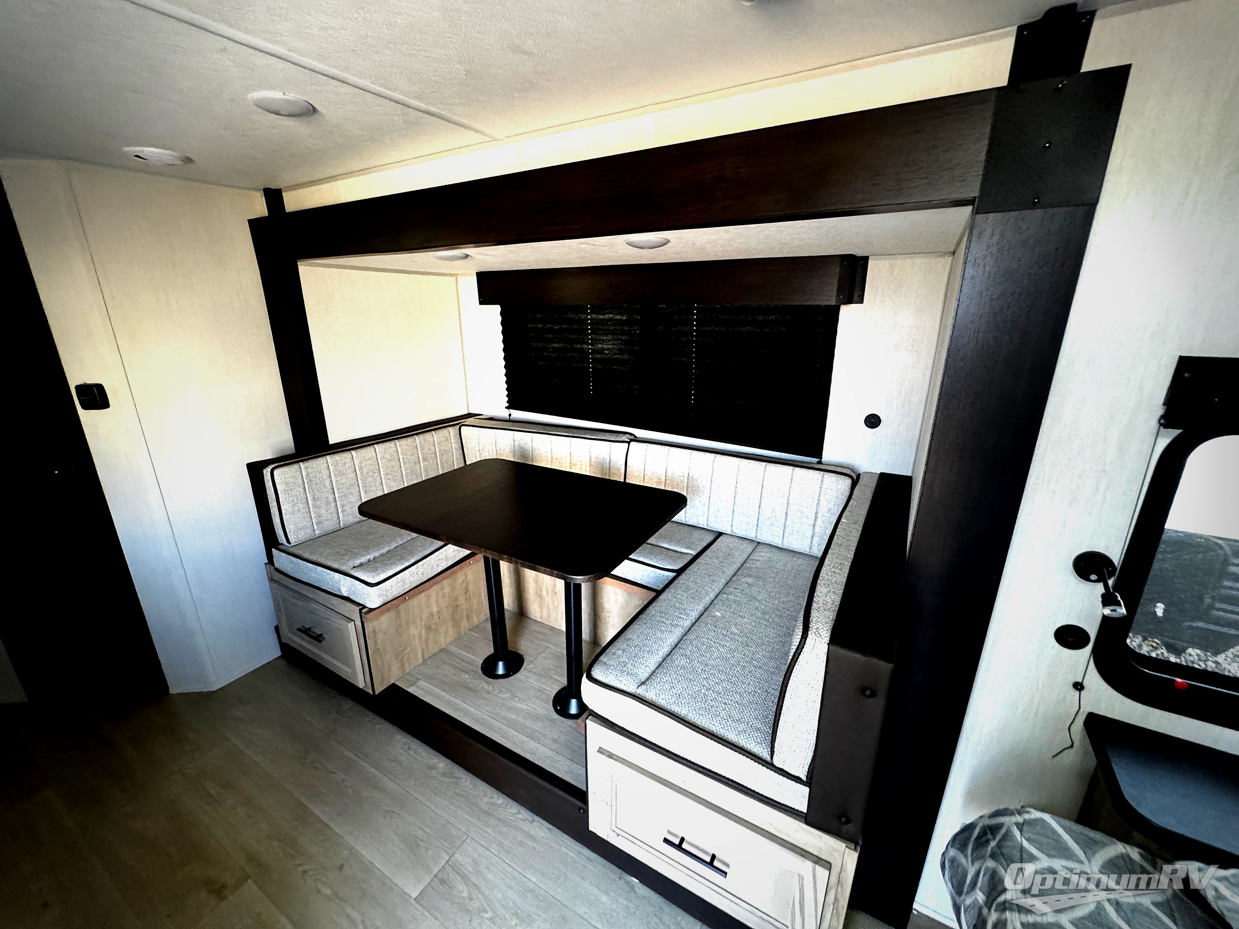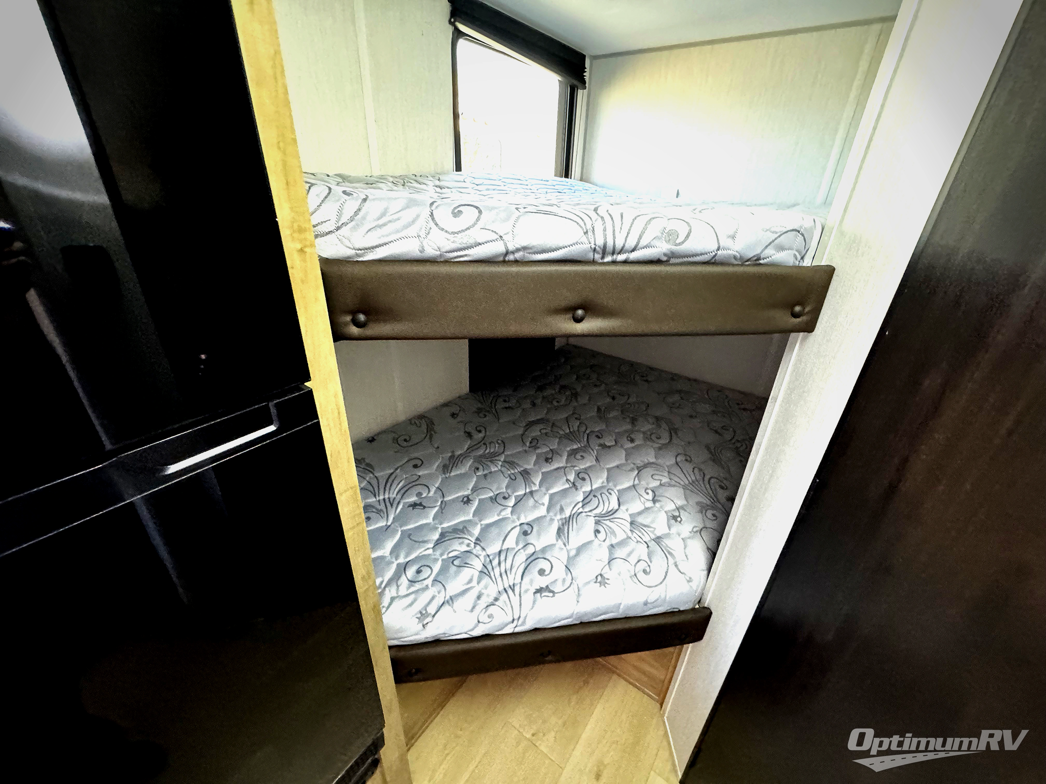 This family travel trailer is ready to head to the campground whenever you are! The kiddos can sleep on the set of double-size bed bunks, and you can sleep on the front queen bed, plus the U-shaped dinette slide can also transform into an extra sleeping space when you aren't using it to enjoy a meal. You can prepare your delicious meals on the range or at the outside mini kitchen and stay protected by the awning. The exterior not only has outside storage and an outside TV mount but also features an outside storage plus door for access to the storage space underneath the bottom bunk bed. The rear corner bath allows everyone to stay clean and refreshed while you camp.