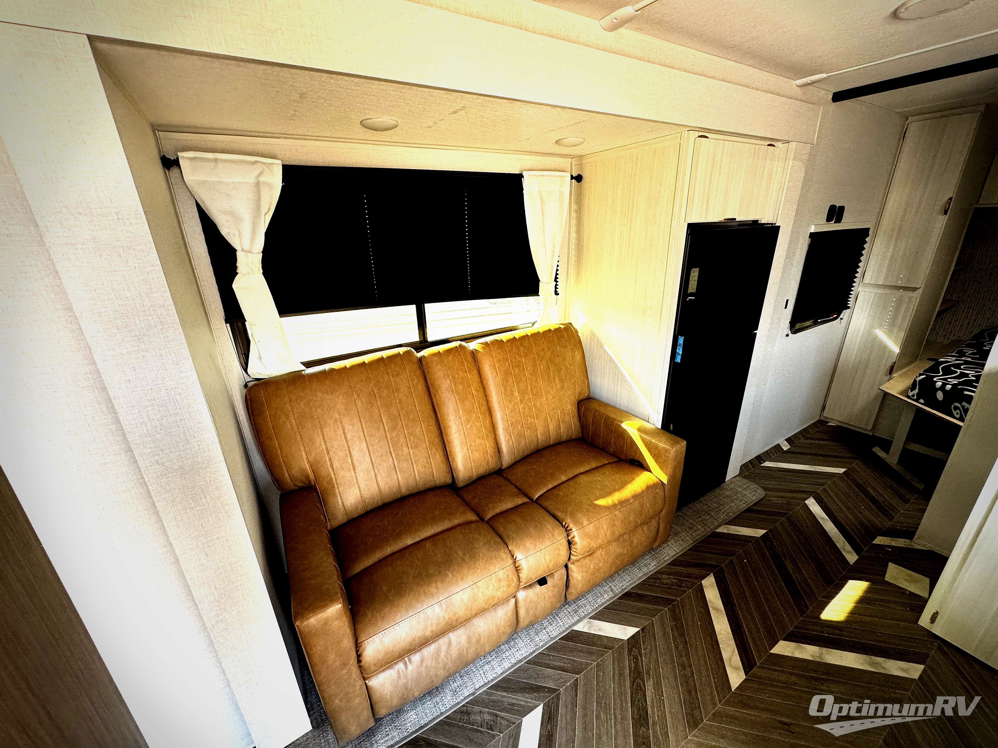 Whether you're camping in your own back yard or across the country, you'll find comfort in this spacious travel trailer. The full rear bath is not only spacious, but it's tucked away in the back for privacy. Your crew can get comfortable on the theater seating or head outdoors to relax under the 18' power awning. There is also a bar top with stools and a fully-equipped kitchen to make meals each day, or you can head outdoors to utilize the outdoor Quick Connect and 2X size camp refrigerator! When you're ready to call it a night, head to the front private bedroom for a great night's rest on the king bed that includes wardrobes on either side for your clothes.