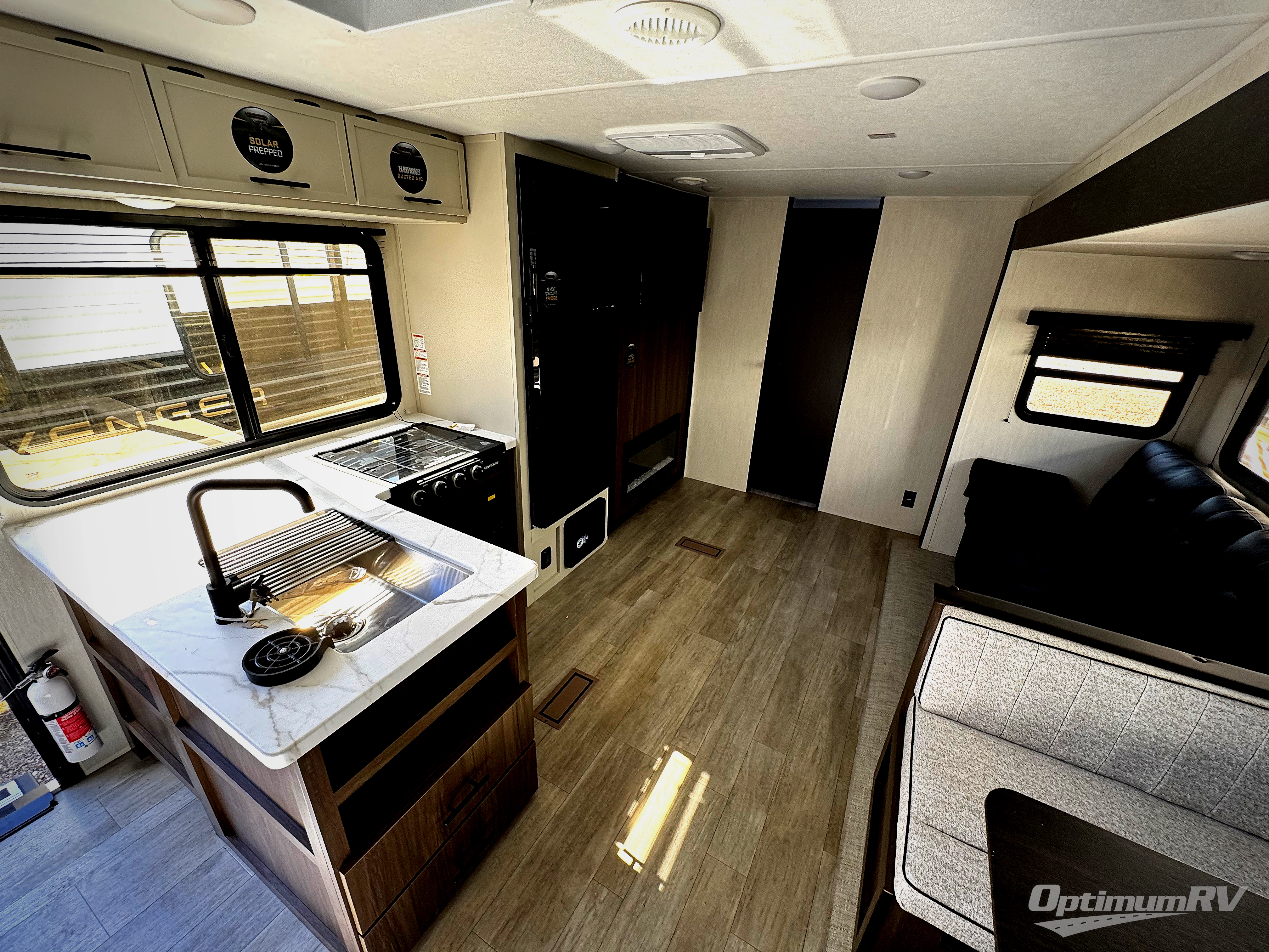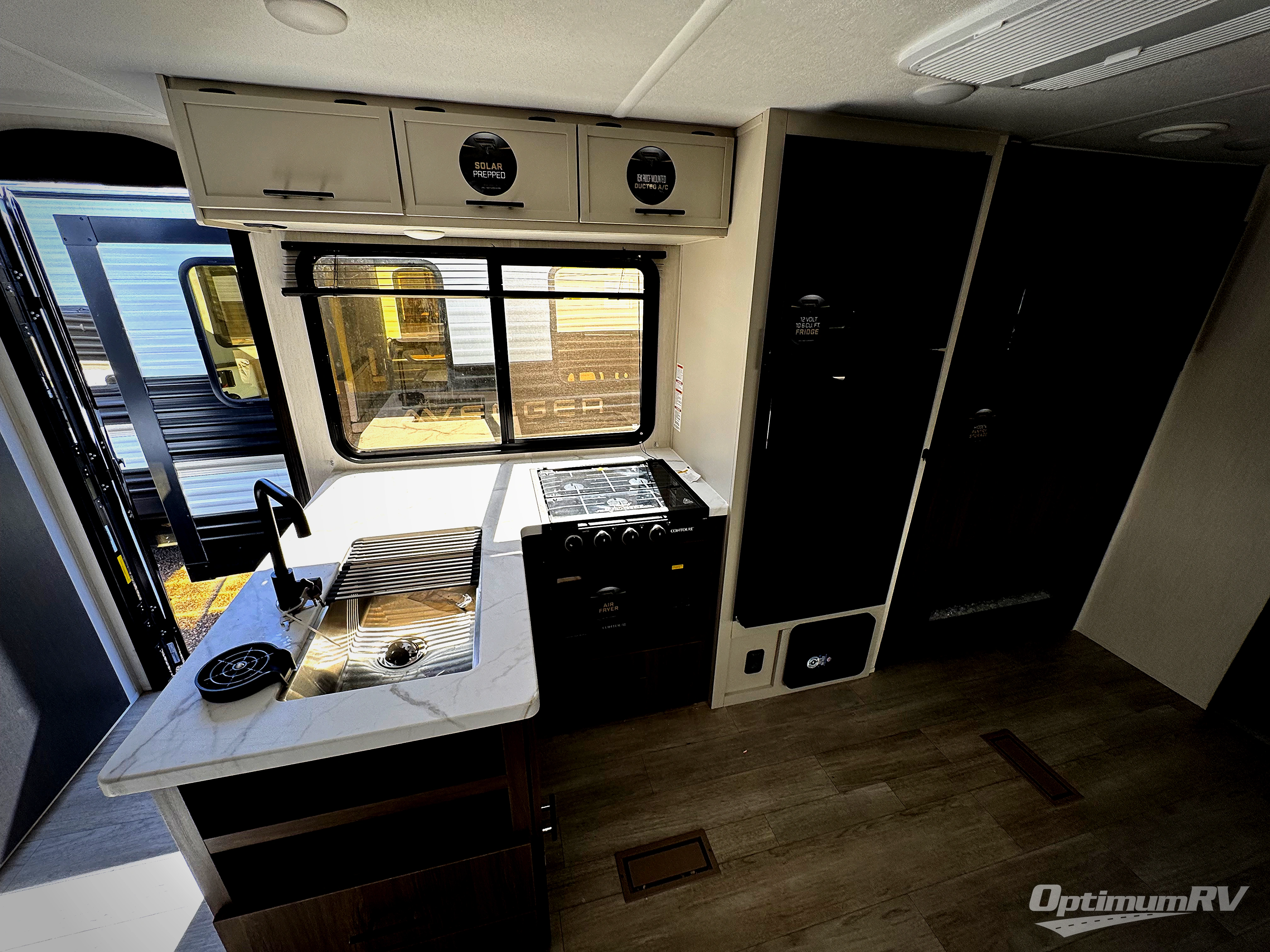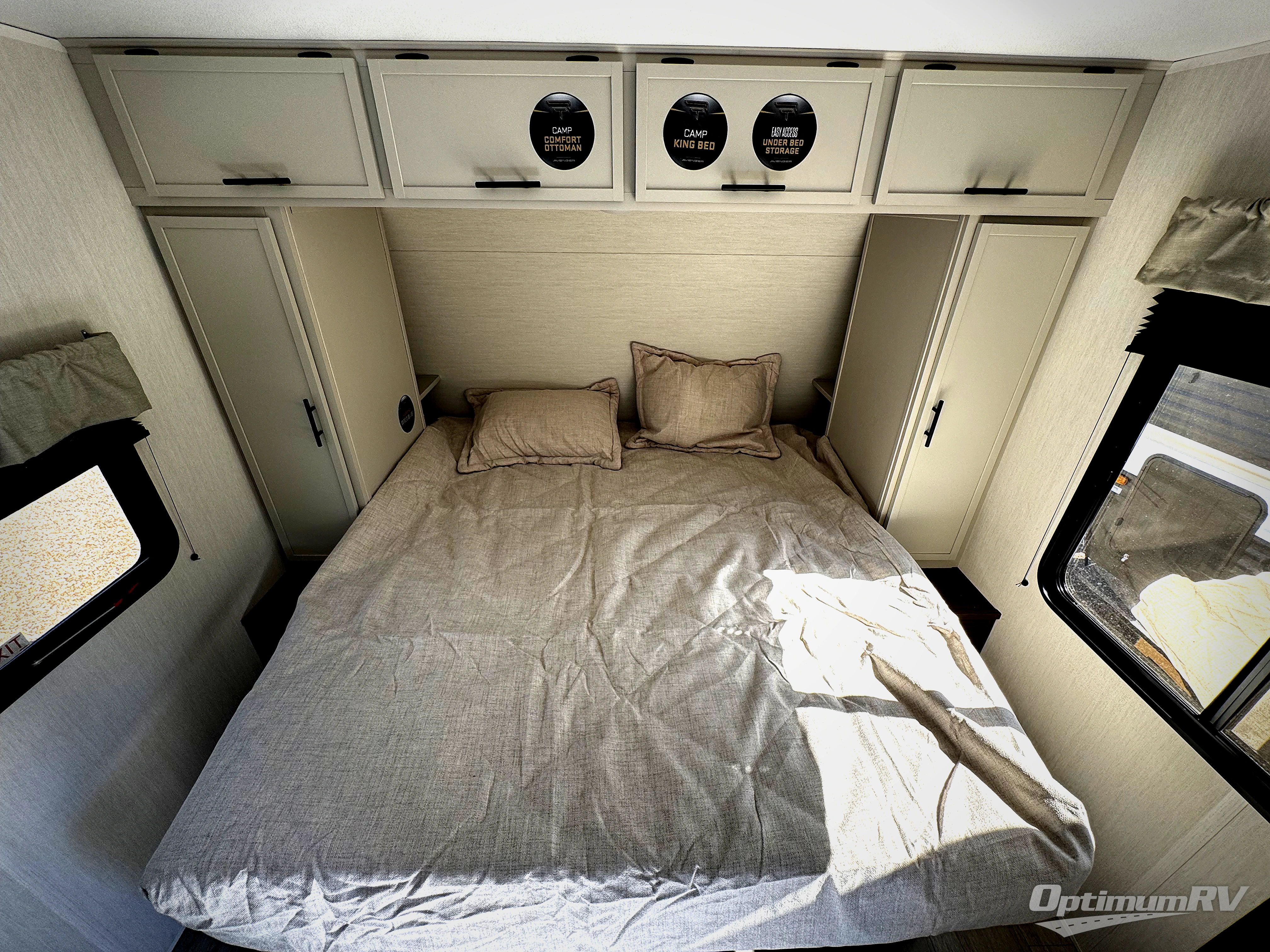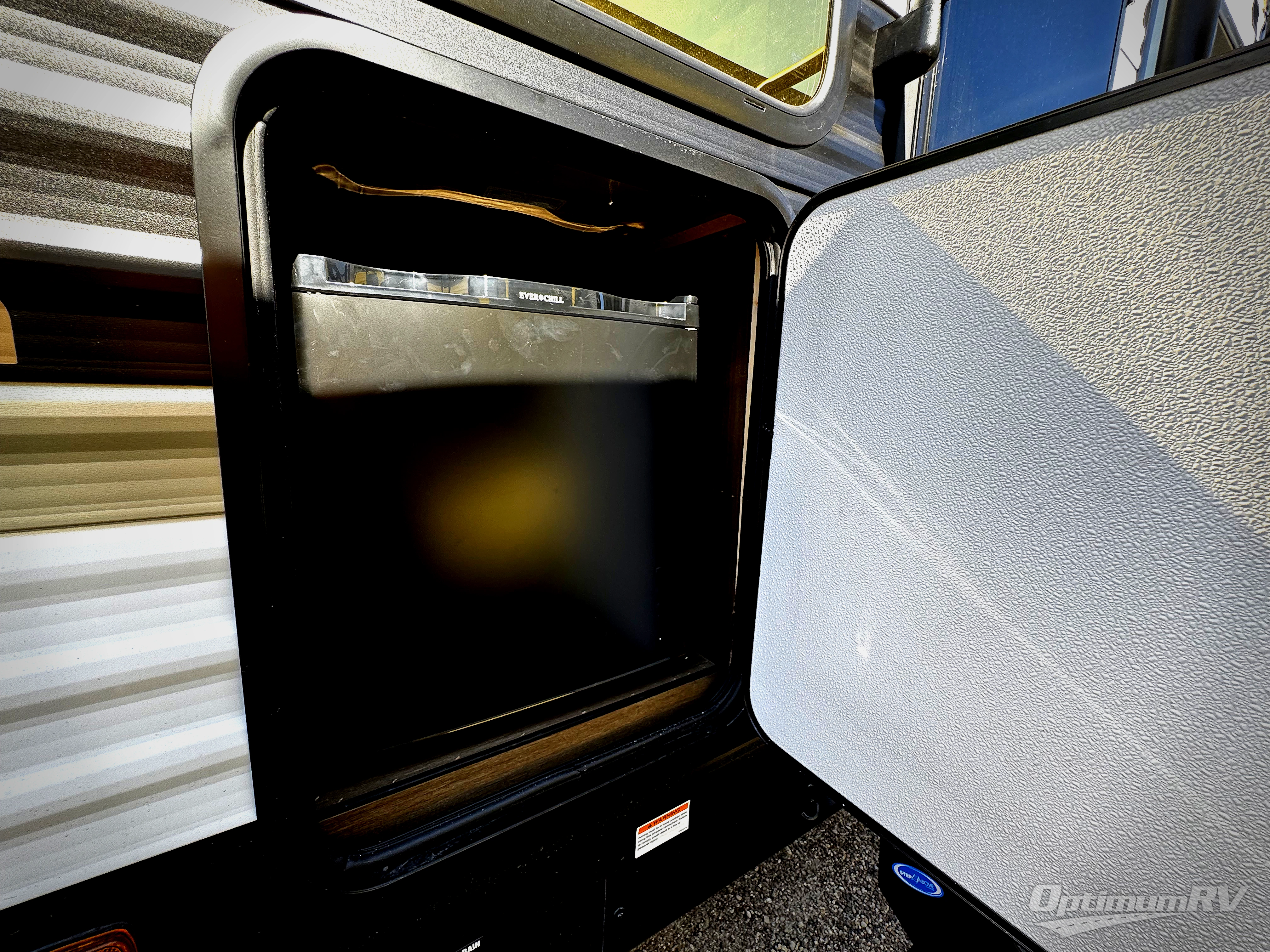 You'll appreciate the added space in this travel trailer thanks to the large slide out!  The booth dinette and sofa are found here, and there is a moveable storage ottoman for extra blankets or board games. You'll have your own space up front in the private bedroom, complete with a camp king bed and storage for your things. The chef of your group will find a three burner cooktop and a built-in convection microwave with an air fryer to cook meals, plus there is a 12V refrigerator and hidden pantry for food storage. This unit also includes a power awning outdoors and an outside refrigerator to keep cold drinks close by.