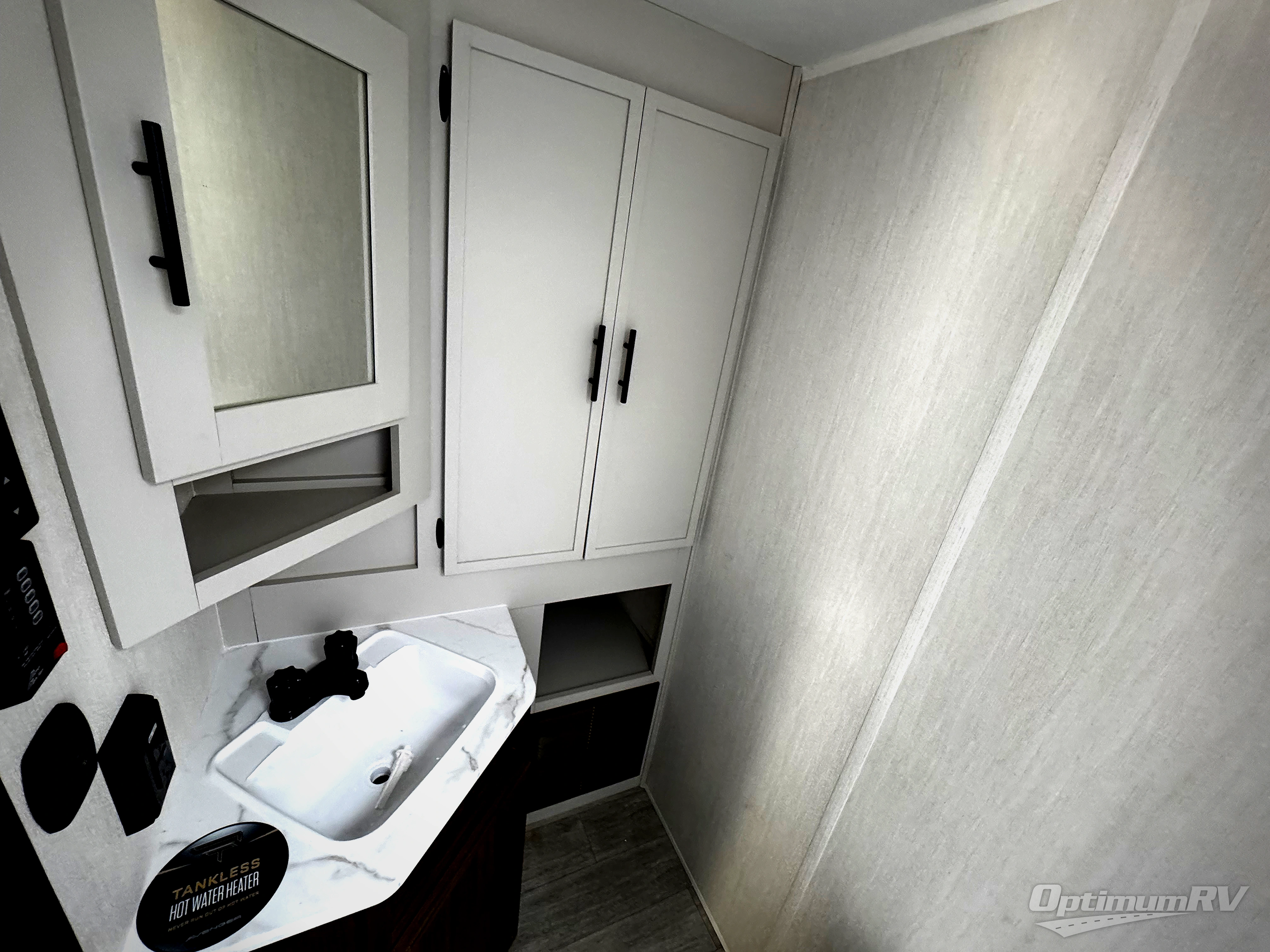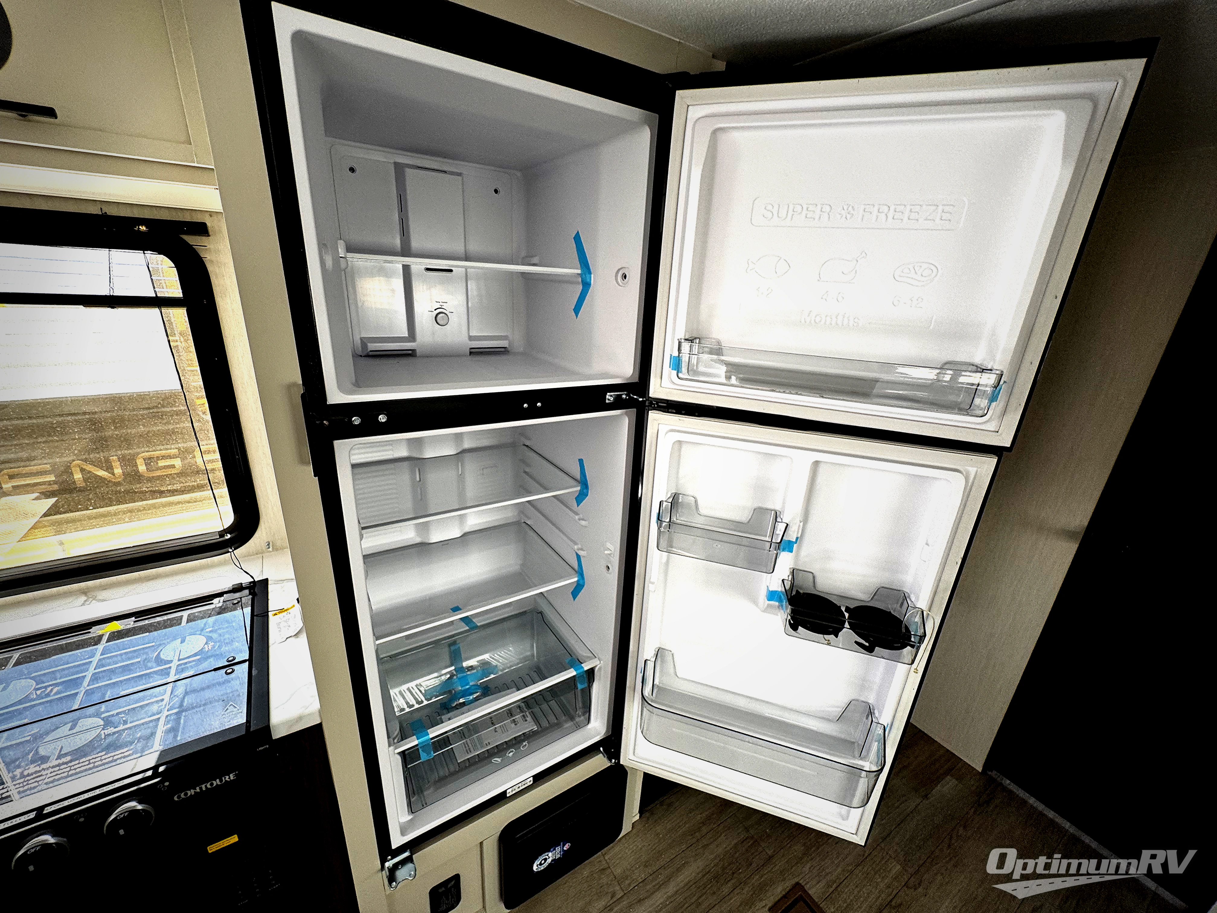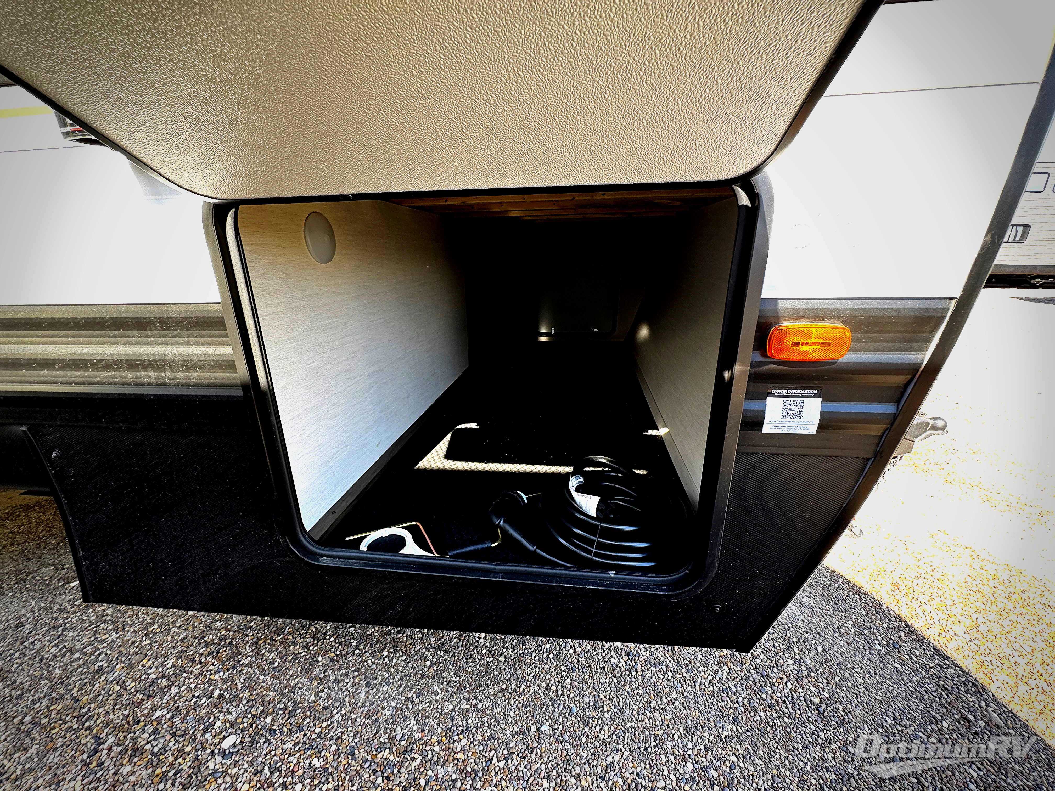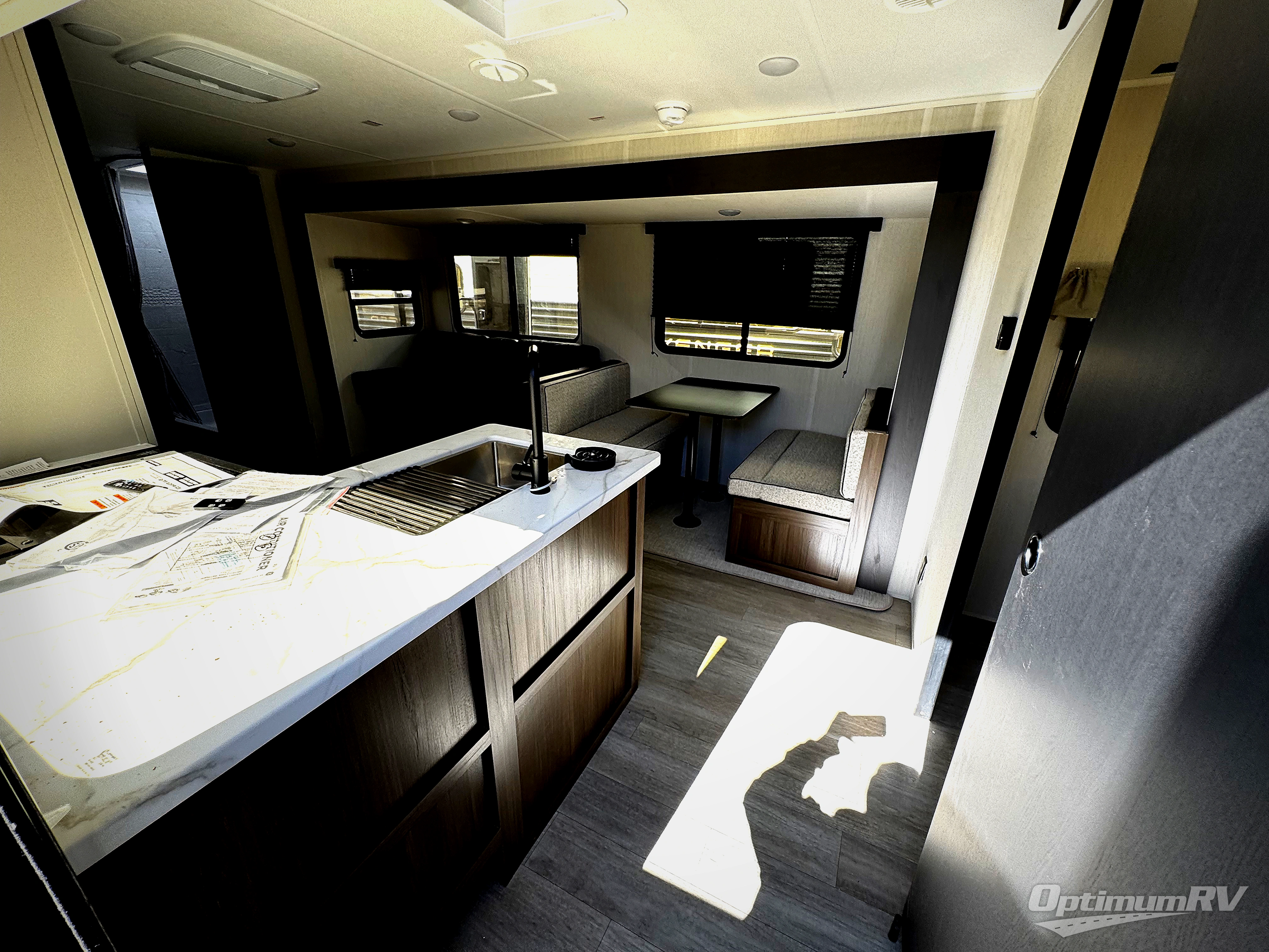 You'll appreciate the added space in this travel trailer thanks to the large slide out!  The booth dinette and sofa are found here, and there is a moveable storage ottoman for extra blankets or board games. You'll have your own space up front in the private bedroom, complete with a camp king bed and storage for your things. The chef of your group will find a three burner cooktop and a built-in convection microwave with an air fryer to cook meals, plus there is a 12V refrigerator and hidden pantry for food storage. This unit also includes a power awning outdoors and an outside refrigerator to keep cold drinks close by.