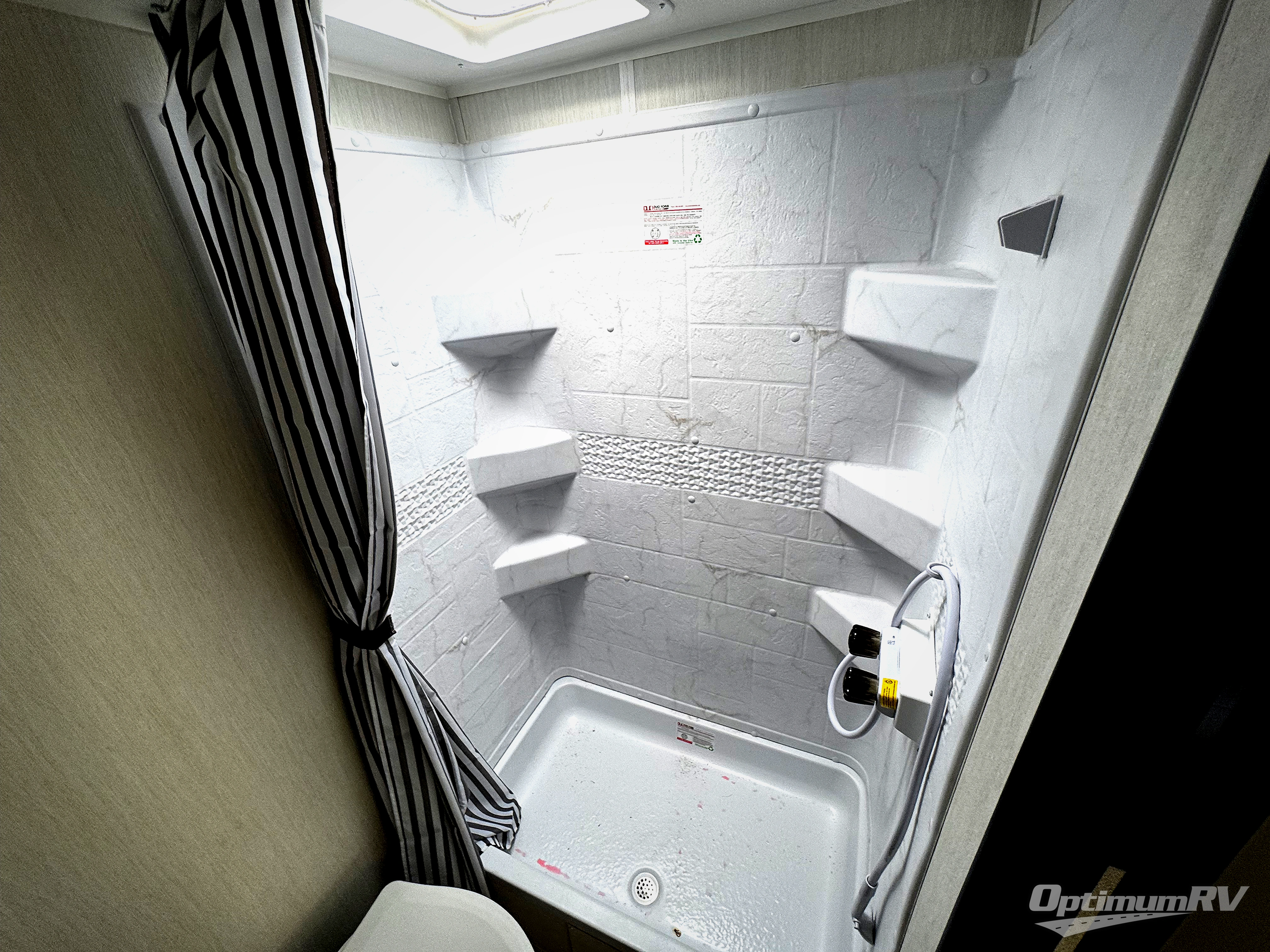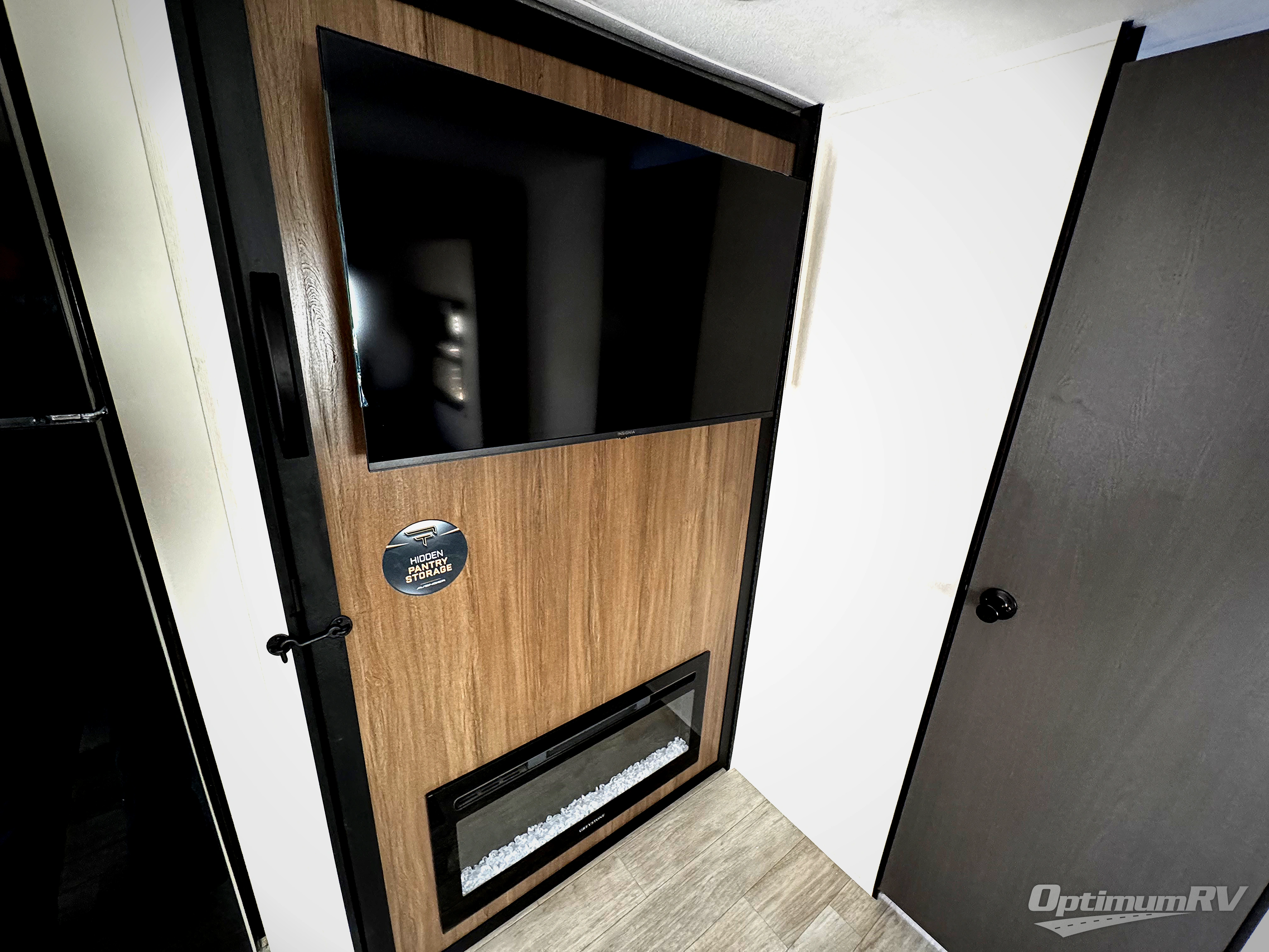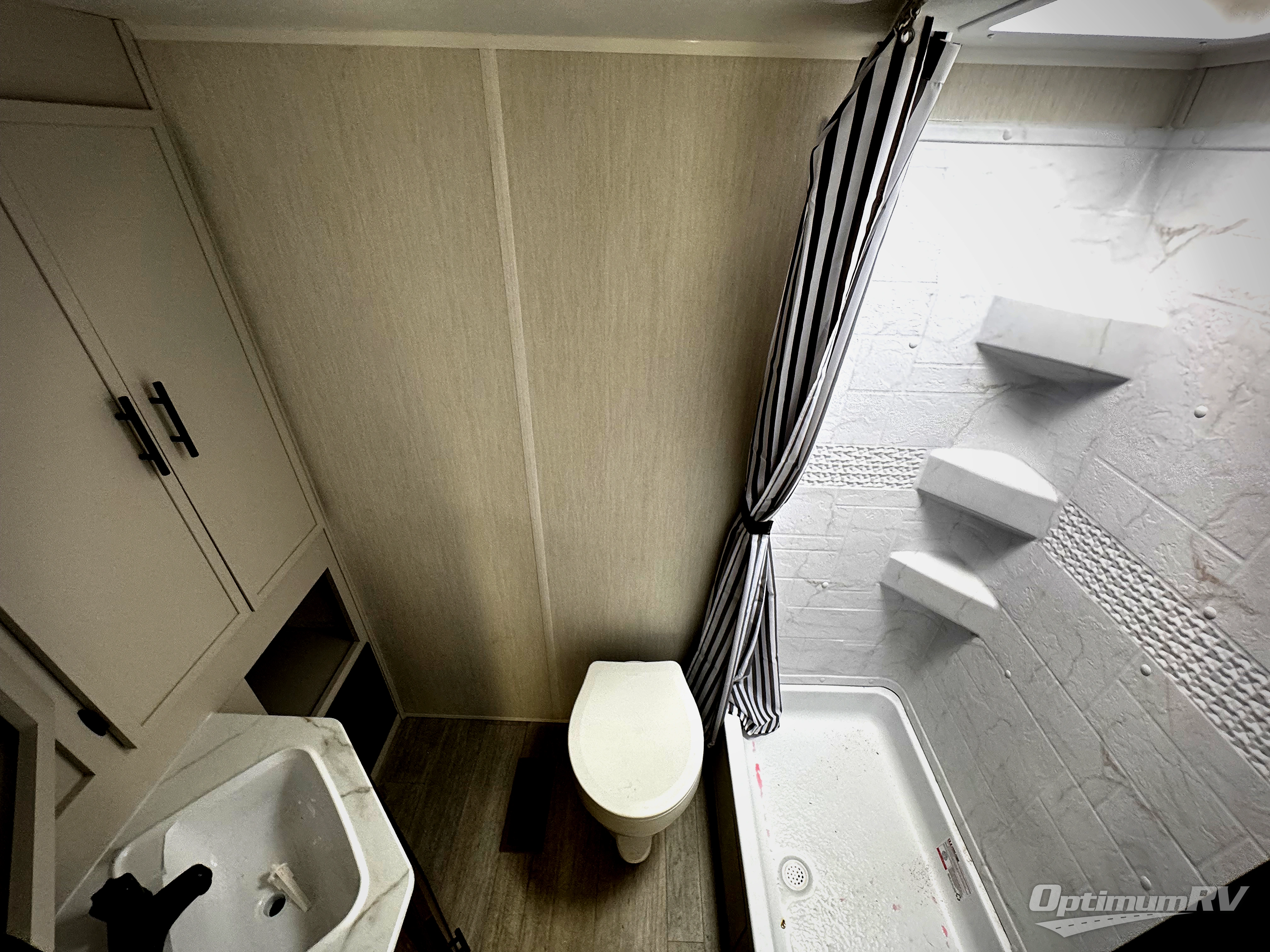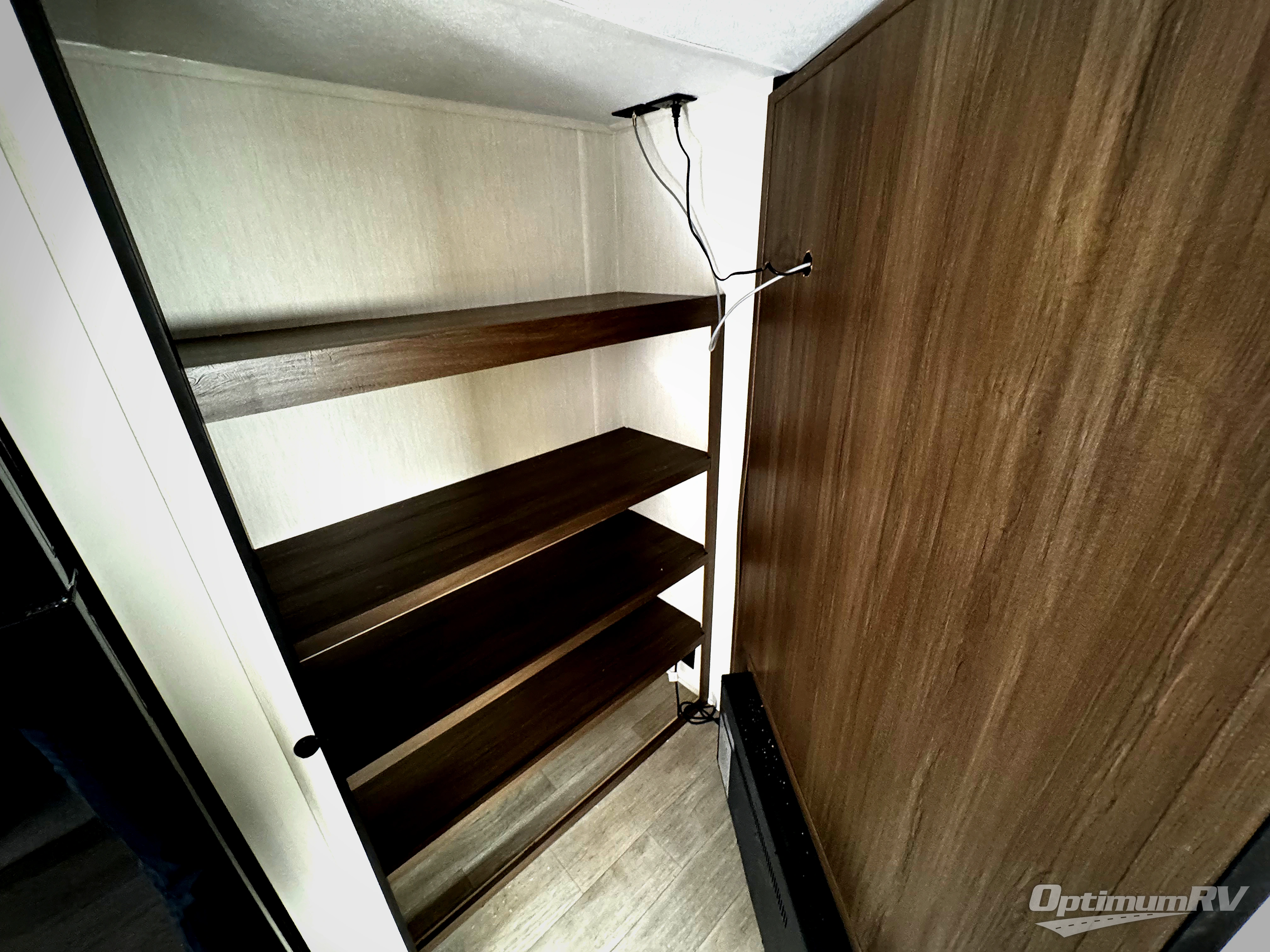 You'll appreciate the added space in this travel trailer thanks to the large slide out!  The booth dinette and sofa are found here, and there is a moveable storage ottoman for extra blankets or board games. You'll have your own space up front in the private bedroom, complete with a camp king bed and storage for your things. The chef of your group will find a three burner cooktop and a built-in convection microwave with an air fryer to cook meals, plus there is a 12V refrigerator and hidden pantry for food storage. This unit also includes a power awning outdoors and an outside refrigerator to keep cold drinks close by.