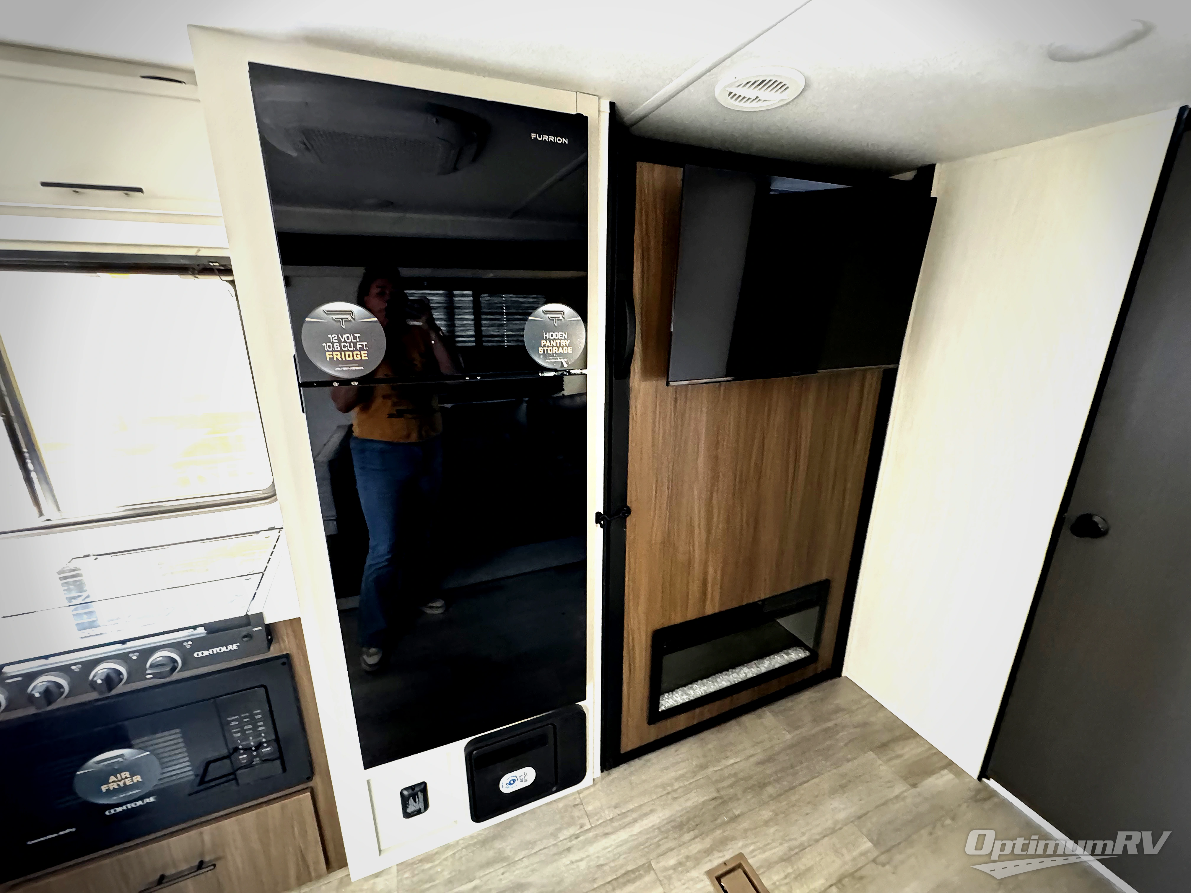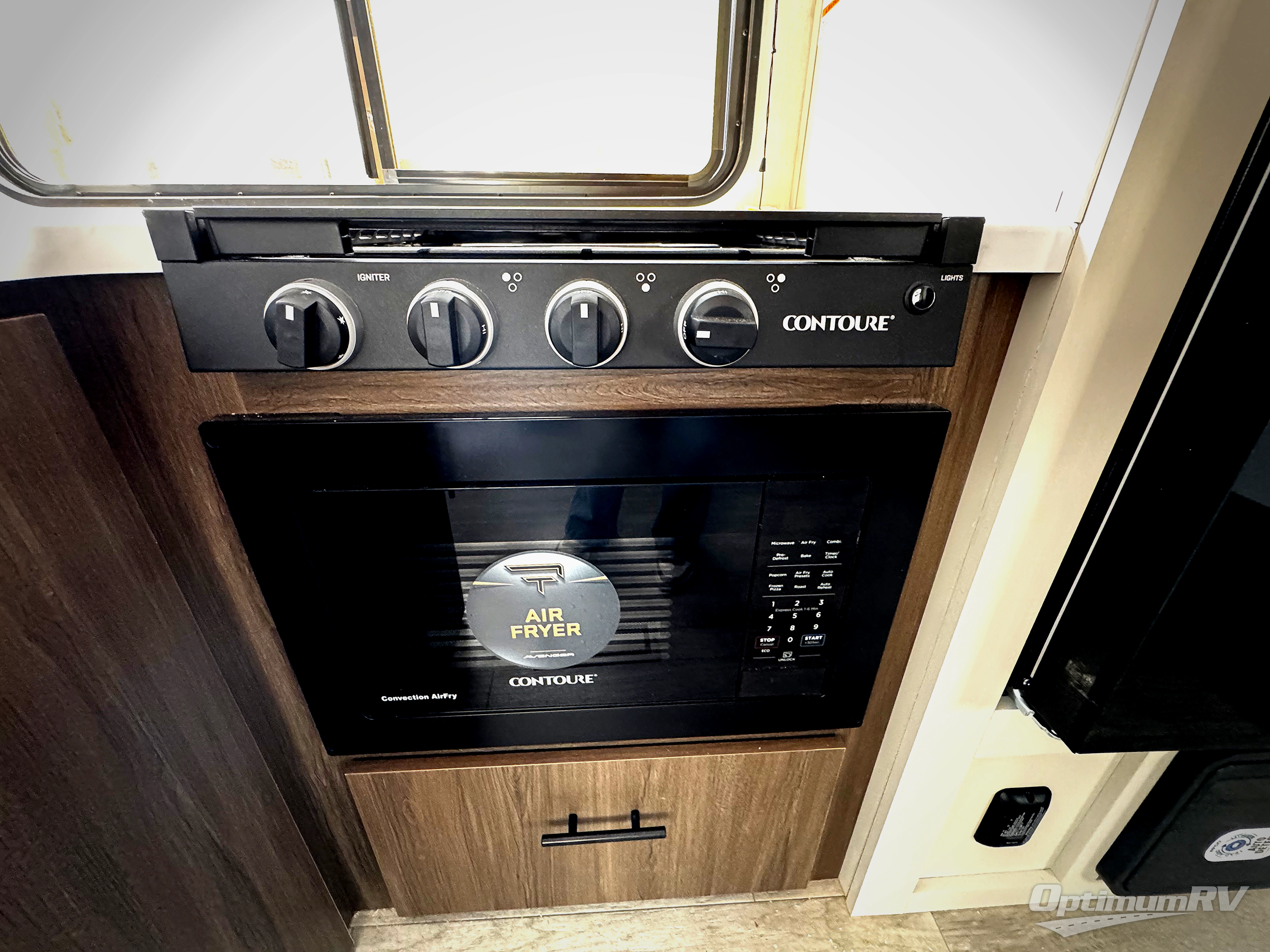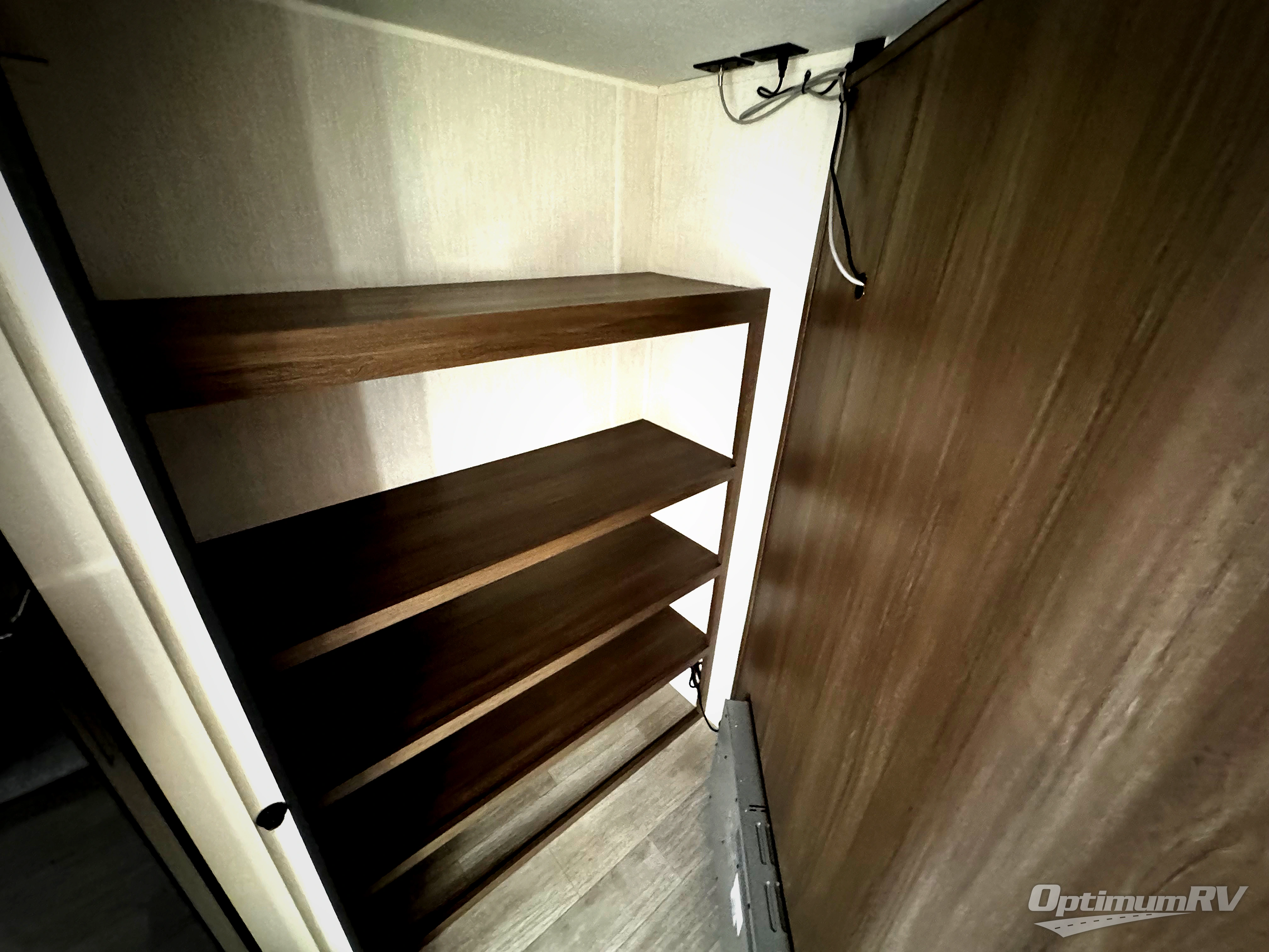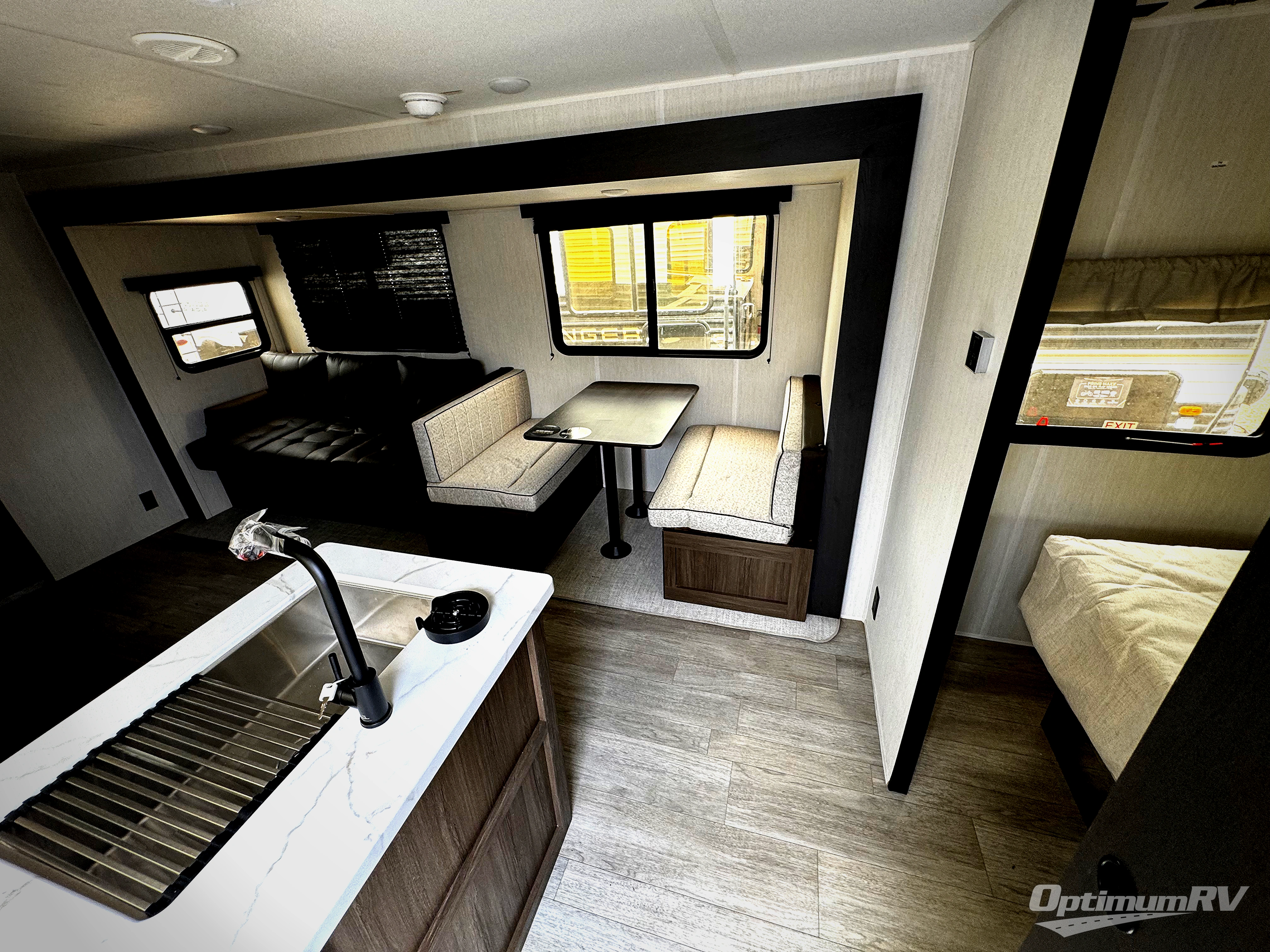 You'll appreciate the added space in this travel trailer thanks to the large slide out! The booth dinette and sofa are found here, and there is a moveable storage ottoman for extra blankets or board games. You'll have your own space up front in the private bedroom, complete with a camp king bed and storage for your things. The chef of your group will find a three burner cooktop and a built-in convection microwave with an air fryer to cook meals, plus there is a 12V refrigerator and hidden pantry for food storage. This unit also includes a power awning outdoors and an outside refrigerator to keep cold drinks close by.