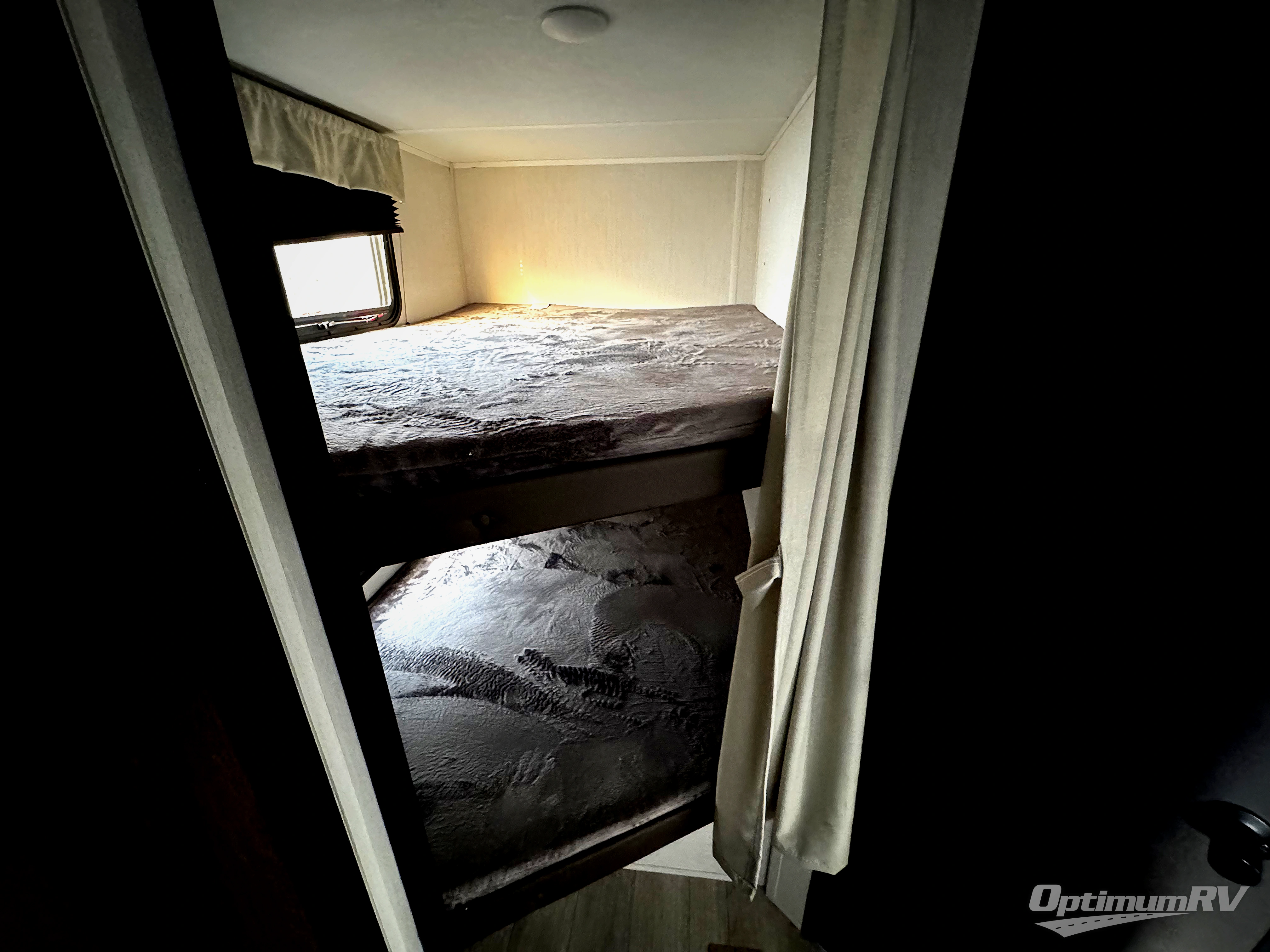 You'll appreciate the added space in this travel trailer thanks to the large slide out! The booth dinette and sofa are found here, and there is a moveable storage ottoman for extra blankets or board games. You'll have your own space up front in the private bedroom, complete with a camp king bed and storage for your things, while your guests take the double-size bunk beds towards the back. The chef of your group will find a three-burner cooktop and a built-in convection microwave with an air fryer to cook meals, plus there is a 12V refrigerator and large hidden pantry for food storage. This unit also includes a power awning outdoors and an outside refrigerator to keep cold drinks close by.
