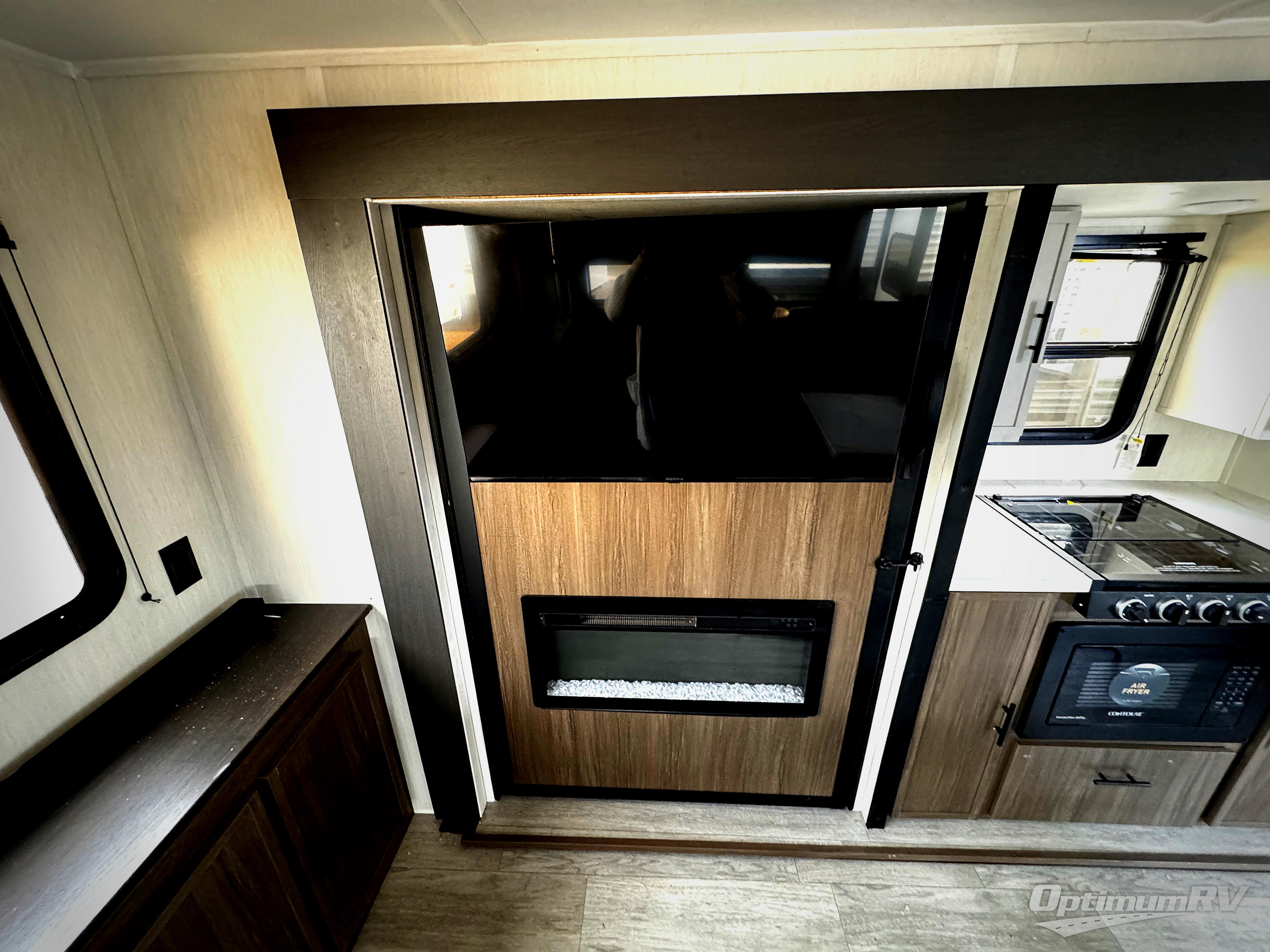 There is ample space to move about in this travel trailer thanks to the dual opposing slides! Here, you'll find an L-shaped sofa with a chaise lounge in direct view of TV and fireplace. There is also a hidden pantry behind the TV for snacks and movies! The center farm table includes four stools so you can gather around for meal times, and the desk with a chair will provide a place for you to get some work done if needed. This unit features a full bath towards the front private bedroom for easy access at night, and you're sure to get a great night's rest on the camp king bed!